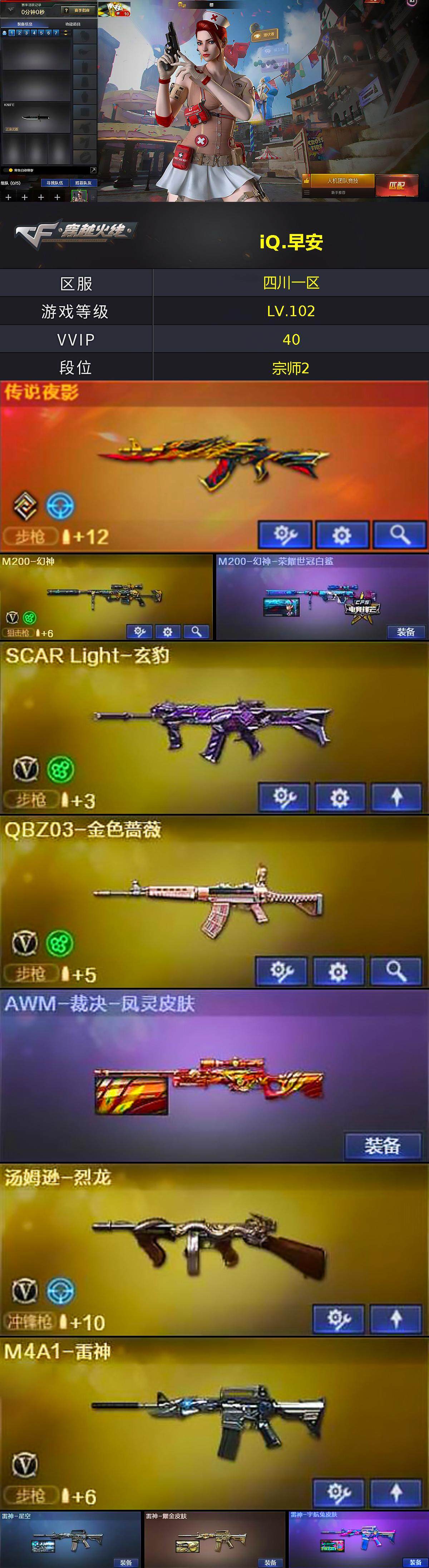 四川一区-39v-3王者-1炫金 【传说武器】:传说夜影 【热门武器】:传说夜影,q03-金色蔷薇,m200-幻神,金色小号,c.a.t,毒蜂,m4a1-黑骑士,汤姆逊-烈龙,沙鹰-修罗2,炽芒蝶刃,金刚伞2 【王者炫金武器】:王者玄武,王者岩刺,炫金毁灭 【音效卡】:m4a1-黑骑士音效卡,炼狱-百战金芒-庆典舞曲音效卡 【皮肤】:m200-幻神-荣耀世冠白鲨,awm-裁决-凤灵皮肤
