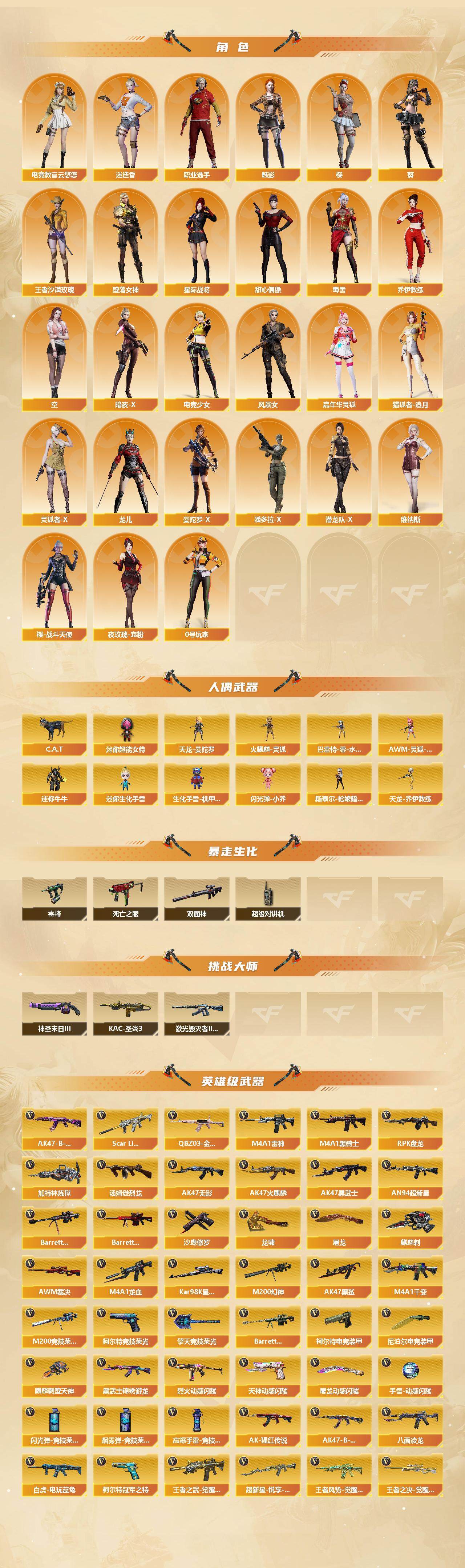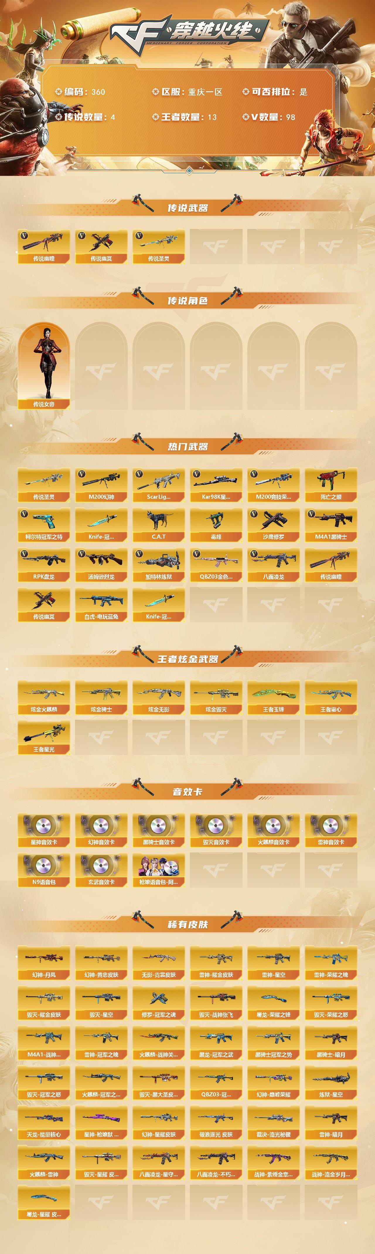 【360】xg33025重庆一区-98v-13王者-4炫金 【传说武器】:传说圣灵,传说幽瞳,传说幽冥 【传说角色】:传说女帝 【热门武器】:传说圣灵,传说幽瞳,传说幽冥,q03-金色蔷薇,scar light-白虎,m200-幻神,m200-竞技荣光,八面凌龙,死亡之眼,白虎-电玩蓝兔,柯尔特-冠军之特,kar98k-星神,c.a.t,毒蜂,m4a1-黑骑士,汤姆逊-烈龙4,rpk-盘龙3,加特林-炼狱,沙鹰-修罗2,knife-冠军之刃2 【王者炫金武器】:王者霜心,王者星光,王者玉锋,炫金火麒麟,炫金骑士,炫金无影,炫金毁灭 【音效卡】:m200-幻神音效卡,ak47-火麒麟音效卡,m4a1-雷神音效卡,m4a1-黑骑士音效卡,barrett-毁灭音效卡,呛娘语音包-阿敏,n9语音包,kar98k-星神音效卡,m14ebr-玄武音效卡 【皮肤】:m200-幻神-黄忠皮肤,幻神-丹凤,幻神-巅峰荣耀,幻神-星耀 皮肤,q03-冠军之薇,金色蔷薇-破浪逐光 皮肤,裁决-流光秘银,星神-呛娘默 皮肤,雷神-暗月,雷神-荣耀之魄,雷神-星空,雷神-耀金皮肤,雷神-冠军之魄,m4a1-战神赵云,火麒麟-雷神,火麒麟-冠军之心,火麒麟-战神关羽2,毁灭-荣耀之怒,毁灭耀金皮肤,毁灭-星空,毁灭-冠军之怒,毁灭-战神张飞,毁灭-黑大圣皮肤,毁灭-星耀 皮肤,黑龙-冠军之武,黑骑士-暗月,黑骑士-冠军之势,无影-霓裳皮肤,八面凌龙-星守炎龙 皮肤,八面凌龙-不朽玄君 皮肤,战神-紫绶金章皮肤2,战神-流金岁月皮肤,天龙-能量核心,炼狱-星空,修罗-冠军之魂2,屠龙-荣耀之锋,屠龙-星耀 皮肤 【角色】:葵,樱,魅影,迷迭香,电竞教官-云悠悠,星际战将,王者沙漠玫瑰,堕落女神,乔伊教练,空,暗夜-x,电竞少女,风暴女,嘉年华灵狐,猎狐者-追月,0号玩家,灵狐者-x,龙儿,曼陀罗-x,潘多拉-x,潜龙队-x,甜心偶像,蜀雪,维纳斯,夜玫瑰-宠粉,樱-战斗天使,职业选手 【人偶武器】:天龙-曼陀罗,火麒麟-灵狐,天龙-乔伊教练,芭蕾特-零-水下丽影,斯泰尔-呛娘暗刃,awm-灵狐-15周年嘉年华,c.a.t,迷你牛牛,迷你生化手蕾2,生化手蕾-机甲核心3,闪光丹-小乔,迷你超能女侍 【暴走生化】:毒蜂,双面神,死亡之眼,超级对讲机 【挑战大师】:激光毁灭者iii-白马银呛,kac-圣炎切割者iii,神圣爆裂者-末日iii 【英雄级武器】:m4a1-千变,ak47-火麒麟4,m4a1-雷神4,m4a1-黑骑士,ak47-无影,ak47-黑武士2,an94-超新星,ak47-黑鲨2,m4a1-龙血2,scar light-白虎,黑武士-锦绣游龙,八面凌龙,q03-金色蔷薇,烈火-动感闪耀,王者之武-觉醒版,超新星-悦享-觉醒版,ak-47-猩红传说4,ak47-b-战神,ak47-b-常胜将军,王者风势-觉醒版,白虎-电玩蓝兔,barrett-毁灭,barrett-极光,awm-裁决,m200-幻神,kar98k-星神,barrett-电竞装甲,m200-竞技荣光,王者之决-觉醒版,王者星神-觉醒版,rpk-盘龙3,加特林-炼狱,汤姆逊-烈龙4,烈龙-悦心-觉醒版,沙鹰-修罗2,柯尔特-冠军之特,柯尔特-电竞装甲,柯尔特-无冕之王,柯尔特-竞技荣光,天神-动感闪耀,屠龙,龙啸,麒麟刺-堕天神,麒麟刺,擎天-竞技荣光,屠龙-动感闪耀,尼泊尔-电竞装甲,王者之击-觉醒版,高爆手蕾-雷霆,高爆手蕾-堕天神,高爆手蕾-竞技荣光,手蕾-动感闪耀,闪光丹-雷霆,闪光丹-堕天神,闪光丹-竞技荣光,闪光丹-雷霆王者-觉醒版,盐雾蛋-雷霆,盐雾蛋-堕天神,盐雾蛋-竞技荣光 【道具】:bs战队炫彩背包,冰冰企鹅背包,沙漠龙背包-猛男专属,炫彩背包-诺拉,炫彩背包,超级背包,终极猎手-荒漠刀客,虚空终结者-暗域熔岩,女皇终结者-魔龙之吻,绿色巨人,灵魂忍者2,变异宝贝,迷雾幽灵2,生化弹匣,夺命之镰,防化服3,金色流光-呛王排位2,星辰流光-呛王排位,呛王排位28赛季金色流光,语音特效-机器人,电玩兔兔表情,动感闪耀表情,ep战队名片,ep战队喷图,防弹头盔7,防弹衣7,c4工具钳6,手蕾包6 【特殊呛械】:1白虎,1黑骑士,4烈龙,3盘龙,1炼狱