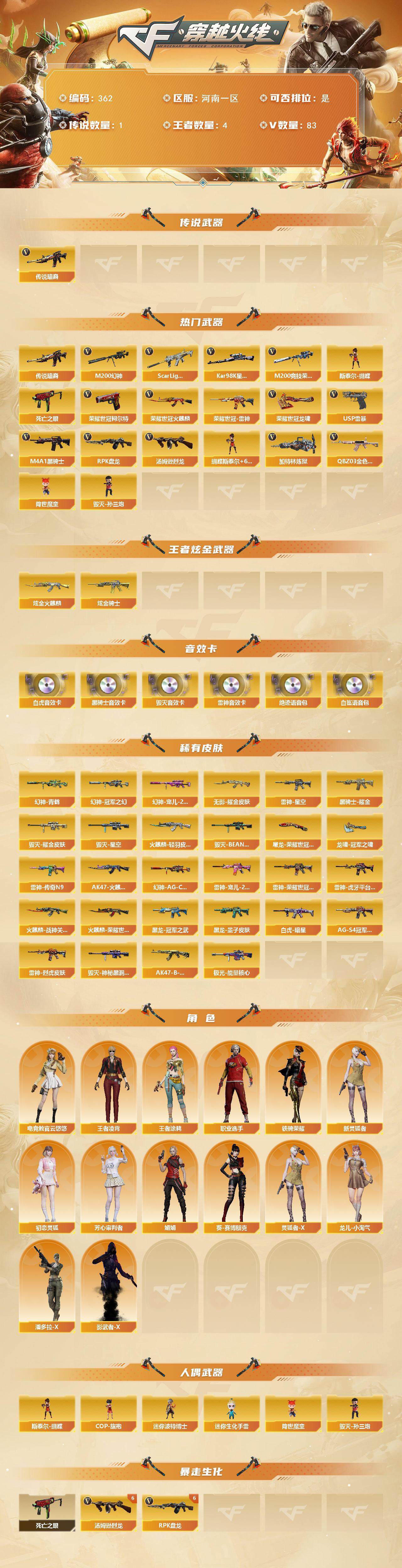 【362】xg32156河南一区-83v-4王者-4炫金 【传说武器】:传说暗裔 【热门武器】:传说暗裔,q03-金色蔷薇3,scar light-白虎,m200-幻神,m200-竞技荣光,死亡之眼,荣耀世冠-火麒麟,荣耀世冠-雷神,荣耀世冠-柯尔特2,kar98k-星神,m4a1-黑骑士,汤姆逊-烈龙6,rpk-盘龙6,加特林-炼狱,斯泰尔-蝴蝶,降世魔童,毁灭-孙三炮,usp-雷暴2,荣耀世冠-龙啸 【王者炫金武器】:炫金火麒麟,炫金骑士3 【音效卡】:m4a1-雷神音效卡,m4a1-黑骑士音效卡,barrett-毁灭音效卡2,scar light-白虎音效卡,绝迹语音包,白鲨语音包 【皮肤】:幻神-冠军之幻,幻神-ag-cfpls17冠军,幻神-青鹤,幻神-宠儿-2021mvp,scar light-白虎-暗星,雷神-星空2,雷神-传奇n9,雷神-宠儿-2019mvp,雷神-虎牙平台皮肤,雷神-烈虎皮肤,雷神-荣耀世冠ag,ak47-火麒麟-传奇even,火麒麟-轻羽皮肤,火麒麟-战神关羽,火麒麟-荣耀世冠ag,毁灭耀金皮肤,毁灭-星空,毁灭-bean-2020mvp,毁灭-神秘黑洞皮肤,黑龙-墨子皮肤,黑龙-冠军之武,黑骑士耀金皮肤,黑骑士-ag-s4冠军典藏,无影耀金皮肤,ak47-b-常胜将军-孙权,极光-能量核心2,屠龙-荣耀世冠ag,龙啸-冠军之啸 【角色】:电竞教官-云悠悠,王者凌霄,王者涂鸦,初恋灵狐,芳心审判者,娟娟,葵-赛博朋克,灵狐者-x,龙儿-小淘气,潘多拉-x,铁骑荣耀,新灵狐者,影武者-x,职业选手 【人偶武器】:毁灭-孙三炮,斯泰尔-蝴蝶,cop-旗袍,迷你波特博士,迷你生化手蕾,降世魔童 【暴走生化】:死亡之眼 【挑战大师】:神圣爆裂者iii,冰龙粉碎者-白马银呛,试炼破坏者iii 【英雄级武器】:ak47-火麒麟,m4a1-黑龙,m4a1-雷神2,m4a1-黑骑士,ak47-无影,ak47-雷暴,scar light-白虎,m4a1-夜魔,m4a1-玫瑰精灵,q03-金色蔷薇3,王者之势-觉醒版,黑骑士-海王,荣耀世冠-火麒麟,荣耀世冠-雷神,awm-天龙,barrett-毁灭2,barrett-极光,m200-幻神,kar98k-星神,m200-竞技荣光,王者星神-觉醒版,rpk-盘龙6,加特林-炼狱,汤姆逊-烈龙6,aa-12-雷霆,沙鹰-天神,usp-雷暴2,柯尔特-电竞装甲,荣耀世冠-柯尔特2,柯尔特-竞技荣光,屠龙2,龙啸6,擎天,麒麟刺,擎天-竞技荣光,荣耀世冠-龙啸,斩神刀-雷暴,高爆手蕾-雷暴5,高爆手蕾-竞技荣光,闪光丹-雷暴5,闪光丹-竞技荣光,盐雾蛋-雷暴5,盐雾蛋-竞技荣光 【道具】:ag战队炫彩背包,bs战队炫彩背包,ep战队炫彩背包,edg炫彩背包,kz战队炫彩背包,q9战队炫彩背包,r.lgd炫彩背包,we炫彩背包,xrock炫彩背包,战舰背包,机械魔影背包-红色,炫彩背包,黄金生化钩,夺命之镰,防化服,呛王排位28赛季金色流光,呛王排位29赛季金色流光,斯沃特表情,防弹头盔3,防弹衣2,c4工具钳4,手蕾包3 【特殊呛械】:蝴蝶斯泰尔6烈龙,1白虎,1黑骑士,6烈龙,6盘龙,1炼狱,1蝴蝶斯泰尔