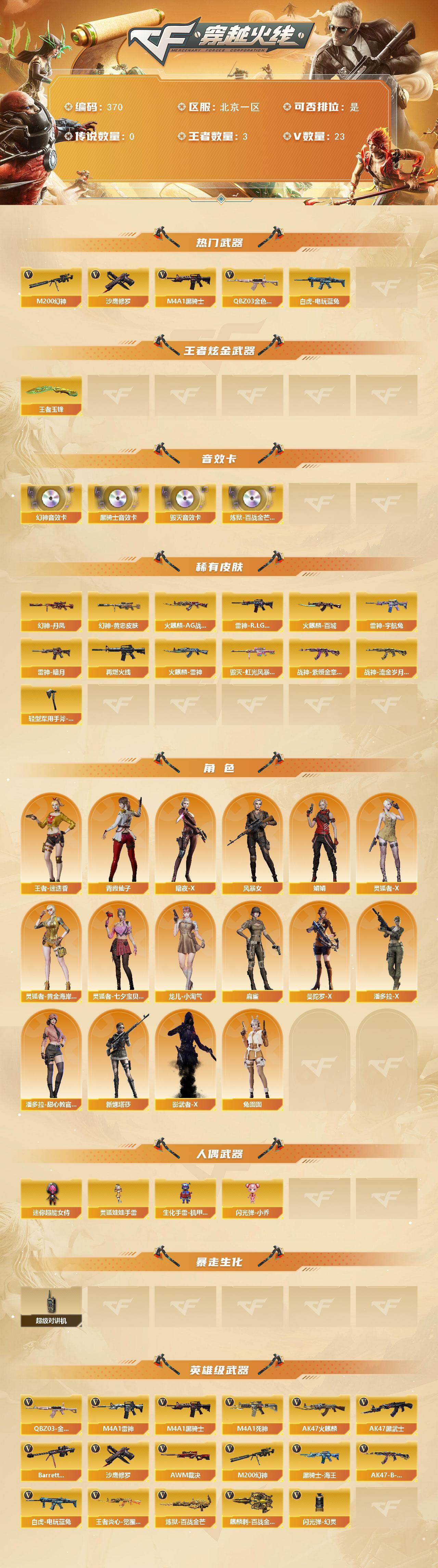 【370】xh62544北京一区-23v-3王者-0炫金 【热门武器】:q03-金色蔷薇,m200-幻神,白虎-电玩蓝兔,m4a1-黑骑士,沙鹰-修罗3 【王者炫金武器】:王者玉锋 【音效卡】:m200-幻神音效卡,m4a1-黑骑士音效卡,barrett-毁灭音效卡,炼狱-百战金芒-庆典舞曲音效卡 【皮肤】:m200-幻神-黄忠皮肤,幻神-丹凤,雷神-暗月,雷神-r.lgd-cfpls18冠军,雷神-宇航兔皮肤,m4a1-再燃火线,火麒麟-ag战队皮肤,火麒麟-雷神,火麒麟-百城,毁灭-虹光风暴 皮肤,战神-紫绶金章皮肤2,战神-流金岁月皮肤4,轻型军用手斧-再燃火线 【角色】:王者-迷迭香,暗夜-x,风暴女,娟娟,灵狐者-x,灵狐者-黄金海岸,灵狐者-七夕宝贝,龙儿-小淘气,麻雀,曼陀罗-x,潘多拉-x,潘多拉-甜心教官,青霞仙子,兔囡囡,新娜塔莎,影武者-x 【人偶武器】:生化手蕾-机甲核心,闪光丹-小乔,迷你超能女侍,灵狐娃娃手蕾 【暴走生化】:超级对讲机 【英雄级武器】:ak47-火麒麟2,m4a1-雷神,m4a1-黑骑士,m4a1-死神,ak47-黑武士,q03-金色蔷薇,ak47-b-战神,王者炎心-觉醒版,黑骑士-海王,白虎-电玩蓝兔,barrett-毁灭,awm-裁决,m200-幻神,炼狱-百战金芒,沙鹰-修罗3,麒麟刺-百战金芒,闪光丹-幻灵 【道具】:百战金芒炫彩背包,背包-洛丽塔,超级背包,女皇终结者-魔龙之吻,救世主-黑桃战神,绿色巨人,灵魂忍者,迷雾幽灵,夺命之镰,防化服2,金色流光-呛王排位2,星辰流光-呛王排位,流光-再燃火线,呛王排位29赛季金色流光,语音特效-盛典烟火,萌萌小葵表情,电玩兔兔表情,防弹头盔6,防弹衣6,c4工具钳4,手蕾包4 【特殊呛械】:1黑骑士
