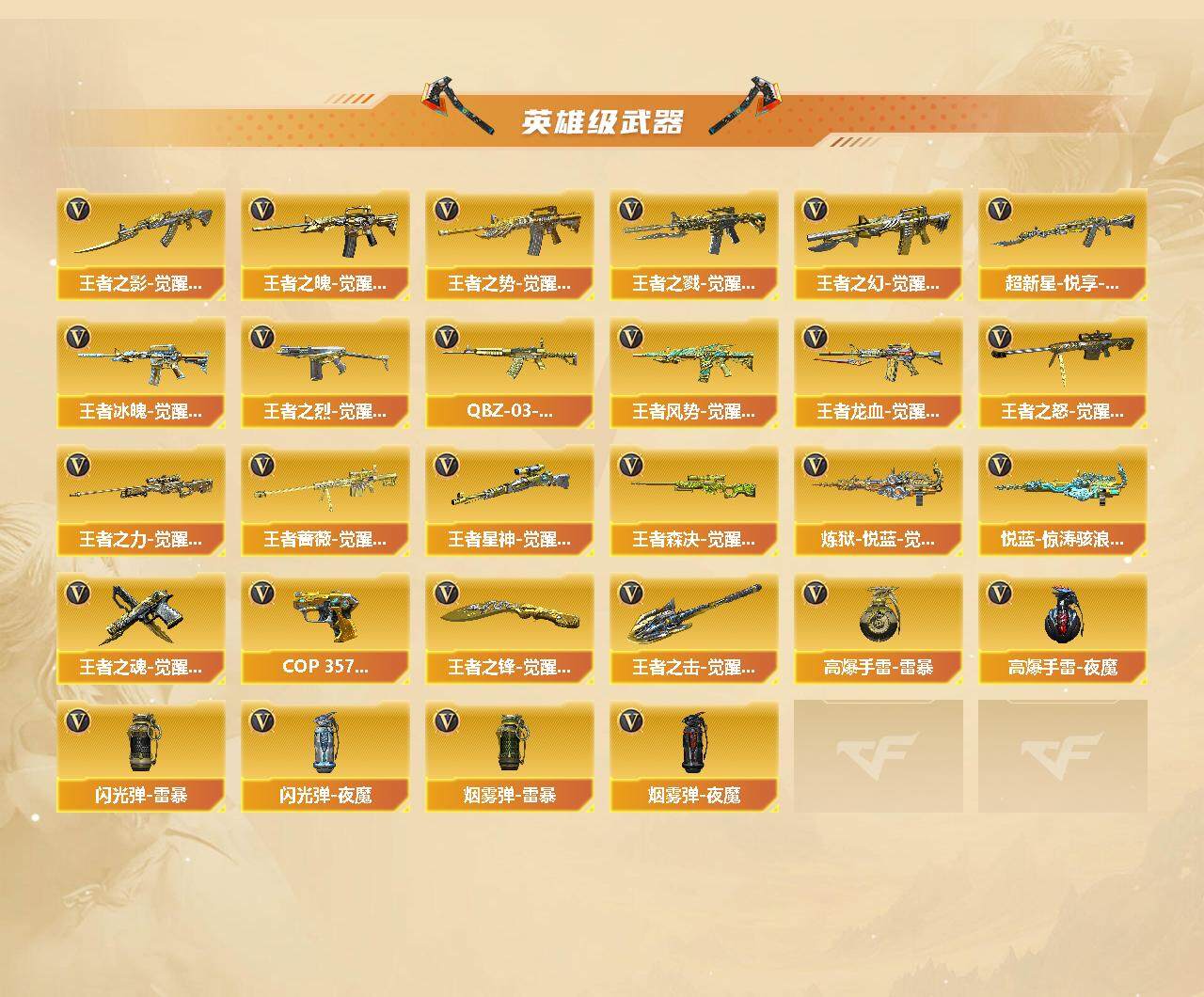 【371】xh86133河南一区-204v-39王者-11炫金 【传说武器】:传说光耀(序列号版),传说暗裔(序列号版),传说辉光,传说梦魇 【热门武器】:传说光耀,传说暗裔,传说梦魇,传说辉光,q03-金色蔷薇,m14ebr-玄武,scar light-白虎2,hk417-朱雀,m200-幻神,m200-竞技荣光,死亡之眼3,柯尔特-冠军之特,kar98k-星神,c.a.t,炼狱-迷你小钢,毒蜂,m4a1-黑骑士7,汤姆逊-烈龙8,rpk-盘龙6,加特林-炼狱3,金色蔷薇-空,斯泰尔-蝴蝶,雷神-小红,毁灭-孙三炮,裁决-雪莉杨,火麒麟-绝迹,cop-白鲨,usp-雷暴,cop-堕天神,沙鹰-修罗8,knife-冠军之刃2,荣耀世冠-龙啸,金刚伞 【王者炫金武器】:王者青龙,王者玉锋,炫金火麒麟2,炫金骑士,炫金雷神,炫金武士3,炫金毁灭2,炫金天龙2 【音效卡】:m200-幻神音效卡,ak47-火麒麟音效卡,m4a1-雷神音效卡,m4a1-黑龙音效卡,m4a1-黑骑士音效卡,barrett-毁灭音效卡2,scar light-白虎音效卡,绝迹语音包,白鲨语音包,n9语音包,kar98k-星神音效卡 【皮肤】:幻神-丹凤,幻神-青鹤,幻神-宠儿-2021mvp,幻神-巅峰荣耀,幻神-cfs2022,m200-幻神-荣耀世冠白鲨,scar light-白虎-暗星,q03-冠军之薇,星神-璀璨皮肤,星神-漫游,雷神-暗月2,雷神-荣耀之魄,雷神-星空,m4a1-雷神-cfs 2019,雷神-耀金皮肤,雷神-冠军之魄,雷神-传奇n9,雷神-宠儿-2019mvp,雷神-杨戬,雷神-烈虎皮肤,雷神-机甲刑天皮肤,雷神-脉冲核心,雷神-宇航兔皮肤,雷神-源计划2.0专属 皮肤,火麒麟-冠军之心,ak47-火麒麟-传奇even,火麒麟-轻羽皮肤,火麒麟-盘古,火麒麟-白虎,火麒麟-百城2,火麒麟-心动糖果,毁灭-荣耀之怒,毁灭耀金皮肤,毁灭-冠军之怒,毁灭-cfs2020,毁灭-bean-2020mvp,毁灭-黑大圣皮肤,毁灭-风暴,毁灭-魔灵皮肤,毁灭-神秘黑洞皮肤,m4a1-千变-孔明皮肤,黑龙-能量核心,黑龙-暗月,黑龙-墨子皮肤,黑龙-冠军之武,黑骑士-暗月2,黑骑士耀金皮肤,黑骑士-冠军之势2,黑骑士-地狱火,黑骑士-cfs2021,黑骑士-伏羲,无影耀金皮肤,黑武士-典韦皮肤,烈火-熔核皮肤,战神-粉色甜心皮肤3,战神-紫绶金章皮肤10,战神-流金岁月皮肤9,ak47-b-常胜将军-曹操,ak47-b-常胜将军-孙权2,awm-天龙-传奇70kg,awm-天龙-传奇白鲨,炼狱-星空3,炼狱-玩具呛皮肤,修罗-星空,修罗-冠军之魂4,天神-暗月,屠龙-荣耀之锋,屠龙-荣耀世冠ag,龙啸-冠军之啸,擎天-秘银,擎天-冠军之击,麒麟刺-甜蜜糖果 皮肤,麒麟刺-荣耀世冠白鲨 【角色】:零,葵,樱,瞳,魅影,凌霄,雨棠,电竞教官-云悠悠,鹰,审判者,王者-瞳-闭月羞花,王者樱-热浪之夏,王者-葵-貂蝉,王者葵-惊若翩鸿,王者春,王者炫,王者玲珑-小乔,王者沙漠玫瑰,云海玲珑,暗夜-x,初恋灵狐,电竞少女,风暴女,嘉年华灵狐,卡塔琳娜,葵-赛博朋克,兰-海滩派对,0号玩家,灵动武士,灵狐者-x,灵狐者-黄金海岸,灵狐者-七夕宝贝,流浪蔷薇,龙儿-小淘气,曼陀罗-礼服,女战神,潘多拉-x,潘多拉-甜心教官,青霞仙子,莎莎,斯沃特-x,蜀雪,铁骑荣耀,兔囡囡,新灵狐者,新娜塔莎,樱-战斗天使,樱-缤纷夏日,职业选手 【人偶武器】:雷神-小红,火麒麟-绝迹,cop-白鲨,毁灭-孙三炮,裁决-雪莉杨,天龙-曼陀罗,火麒麟-灵狐2,m4a1-雷神-精英刀锋,炼狱-迷你小钢,金色蔷薇-空,斯泰尔-蝴蝶,芭蕾特-零-水下丽影,barrett-战龙-灵狐者,awm-灵狐-15周年嘉年华,m37-葵,cop-旗袍,c.a.t,黄金迷你深渊冰龙,迷你裂空之翼,黄金迷你裂空之翼,迷你波特博士2,夺魂,迷你生化手蕾3,生化手蕾-机甲核心,深渊终结者手蕾,闪光丹-小乔,m200-夜玫瑰,迷你艾比,迷你超能女侍,灵狐娃娃手蕾 【暴走生化】:毒蜂,黑龙吞噬者,死亡之眼3,超级对讲机 【挑战大师】:神圣爆裂者iii3,ak47-冰龙粉碎者,冰龙粉碎者-白马银呛3,激光毁灭者iii-白马银呛2,vepr-12-金魔,激光毁灭者iii,机甲撕裂者iii,试炼破坏者iii,阐释者iii 【英雄级武器】:m4a1-千变,ak47-火麒麟2,ak47-麒麟,m4a1-黑龙4,m4a1-雷神,m4a1-黑骑士7,ak47-无影,m4a1-死神,ak47-黑武士,ak12-天启2,an94-超新星,m4a1-武圣2,ak47-机械迷城2,ak47-黑鲨2,m4a1-龙血3,hk417-朱雀,scar light-白虎2,m4a1-夜魔3,m14ebr-玄武,m4a1-玫瑰精灵,q03-金色蔷薇,m4a1-猎神,王者之心-觉醒版,王者之影-觉醒版,王者之魄-觉醒版,王者之势-觉醒版,王者之戮-觉醒版2,王者之幻-觉醒版,超新星-悦享-觉醒版3,ak-47-猩红传说11,ak47-b-战神,王者冰魄-觉醒版,王者之烈-觉醒版,q-03-王者蔷薇-觉醒版,王者风势-觉醒版,王者龙血-觉醒版,awm-天龙2,barrett-毁灭,barrett-极光7,awm-裁决,m200-幻神,barrett-朱雀,kar98k-星神,m200-竞技荣光,王者之怒-觉醒版,王者之力-觉醒版,王者蔷薇-觉醒版,王者星神-觉醒版,王者森决-觉醒版,rpk-盘龙6,加特林-炼狱3,炼狱-悦蓝-觉醒版,悦蓝-惊涛骇浪-觉醒版,汤姆逊-烈龙8,aa-12-雷霆,王者之霆-觉醒版,沙鹰-修罗8,沙鹰-天神3,usp-雷暴,cop-堕天神,cop 357-雷霆王者-觉醒版,柯尔特-冠军之特,柯尔特-电竞装甲,柯尔特-竞技荣光,破空呛刃-夜魔,王者之魂-觉醒版,glock18-武圣,屠龙2,龙啸7,马来剑-夜魔,擎天2,麒麟刺5,擎天-竞技荣光3,荣耀世冠-龙啸,尼泊尔-电竞装甲,斩神刀-雷暴,王者之锋-觉醒版2,王者之击-觉醒版,高爆手蕾-雷暴4,高爆手蕾-夜魔7,高爆手蕾-竞技荣光9,闪光丹-雷暴4,闪光丹-夜魔7,闪光丹-竞技荣光10,盐雾蛋-雷暴4,盐雾蛋-夜魔7,盐雾蛋-竞技荣光9,m4a1-赤狱骑士 【道具】:ep战队炫彩背包,edg炫彩背包,q9战队炫彩背包,r.lgd炫彩背包,we炫彩背包,xrock炫彩背包,云山科技背包,女皇终结者-背包,炫彩背包,背包-洛丽塔,虎牙炫彩背包,超级背包,女皇终结者-魔龙之吻,救世主-黑桃战神,妩媚妖姬,黄金生化钩,