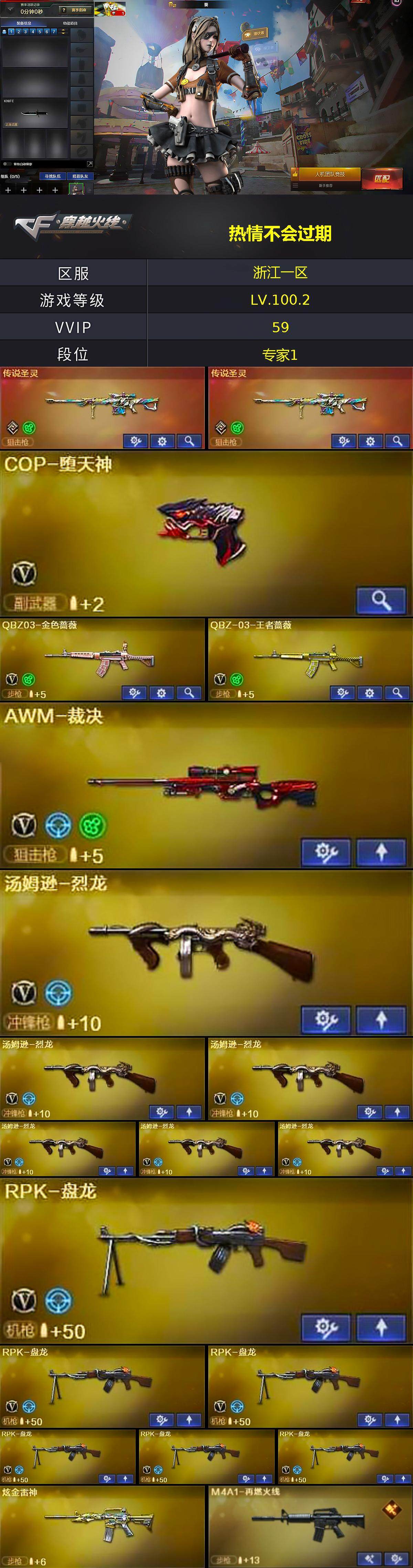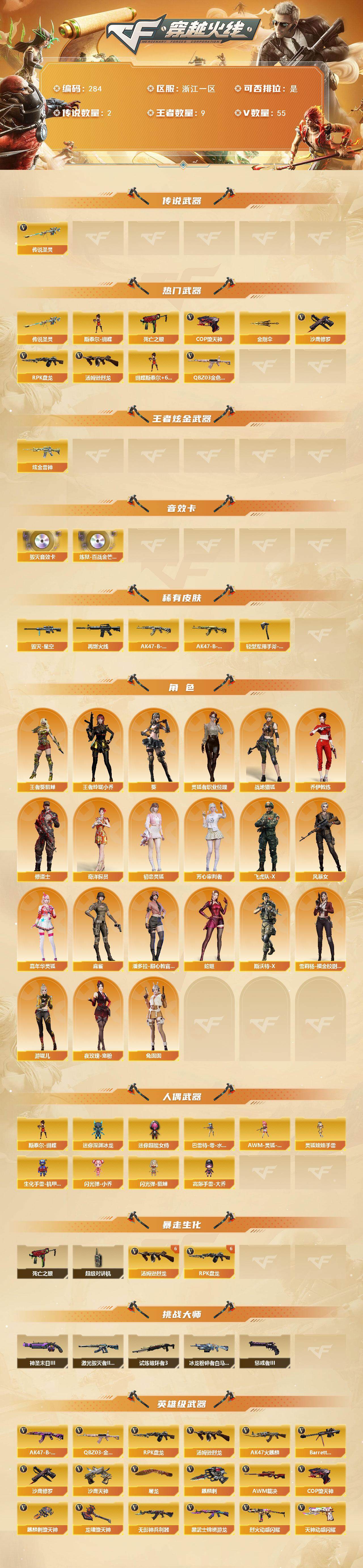 浙江一区-55v-9王者-1炫金 【传说武器】:传说圣灵2 【热门武器】:传说圣灵2,q03-金色蔷薇,死亡之眼,汤姆逊-烈龙6,rpk-盘龙6,斯泰尔-蝴蝶,cop-堕天神,沙鹰-修罗5,金刚伞 【王者炫金武器】:炫金雷神 【音效卡】:barrett-毁灭音效卡,炼狱-百战金芒-庆典舞曲音效卡 【皮肤】:m4a1-再燃火线,毁灭-星空,超新星-深海萌鲨 皮肤,ak47-b-常胜将军-刘备,ak47-b-常胜将军-孙权,轻型军用手斧-再燃火线 【角色】:葵,战地猎狐,王者-葵-貂蝉,王者玲珑-小乔,奇洋探员,乔伊教练,修道士,初恋灵狐,芳心审判者,飞虎队-x,风暴女2,嘉年华灵狐,灵狐者-职业经理,麻雀,潘多拉-甜心教官,蛇姬,斯沃特-x,兔囡囡,雪莉杨-摸金校尉,夜玫瑰-宠粉,游珑儿 【人偶武器】:斯泰尔-蝴蝶,芭蕾特-零-水下丽影,awm-灵狐-15周年嘉年华3,迷你深渊冰龙,生化手蕾-机甲核心3,闪光丹-小乔,闪光丹-貂蝉,高爆手蕾-大乔,迷你超能女侍,灵狐娃娃手蕾 【暴走生化】:死亡之眼,超级对讲机 【挑战大师】:冰龙粉碎者-白马银呛,激光毁灭者iii-白马银呛,试炼破坏者iii,神圣爆裂者-末日iii,惩戒者iii 【英雄级武器】:ak47-火麒麟,无影-神兵利器,黑武士-锦绣游龙,超新星-热带奇洋,q03-金色蔷薇,烈火-动感闪耀,王者火魄-觉醒版,ak47-b-常胜将军,q-03-王者蔷薇-觉醒版,barrett-毁灭,awm-裁决,rpk-盘龙6,炼狱-百战金芒,汤姆逊-烈龙6,沙鹰-修罗5,沙鹰-天神,cop-堕天神,天神-动感闪耀,屠龙,麒麟刺-堕天神,麒麟刺,屠龙-动感闪耀,龙啸-热带奇洋,龙啸-堕天神,麒麟刺-百战金芒,王者之啸-觉醒版2,王者之击-觉醒版2,高爆手蕾-堕天神3,手蕾-动感闪耀,手蕾-热带奇洋,闪光丹-堕天神3,盐雾蛋-堕天神3,m4a1-赤狱骑士,barrett-碧霄极光 【道具】:bs战队炫彩背包,云山科技背包,全能呛王背包,古蛇迷踪炫彩背包,奇洋探员-海龟背包,热带奇洋炫彩背包,百战金芒炫彩背包,背包-洛丽塔,超级背包,圣拳猎手-炽雪,女皇终结者-魔龙之吻,救世主-黑桃战神,黄金生化钩,绿色巨人,灵魂忍者3,变异宝贝,迷雾幽灵3,生化弹匣,夺命之镰,防化服3,金色流光-呛王排位2,星辰流光-呛王排位,呛王排位28赛季金色流光,呛王排位29赛季金色流光,语音特效-盛典烟火,萌萌小葵表情,电玩兔兔表情,热带奇洋表情,动感闪耀表情,ep战队名片,ep战队喷图,防弹头盔5,防弹衣5,c4工具钳5,手蕾包5 【特殊呛械】:蝴蝶斯泰尔6烈龙,6烈龙,6盘龙,1蝴蝶斯泰尔