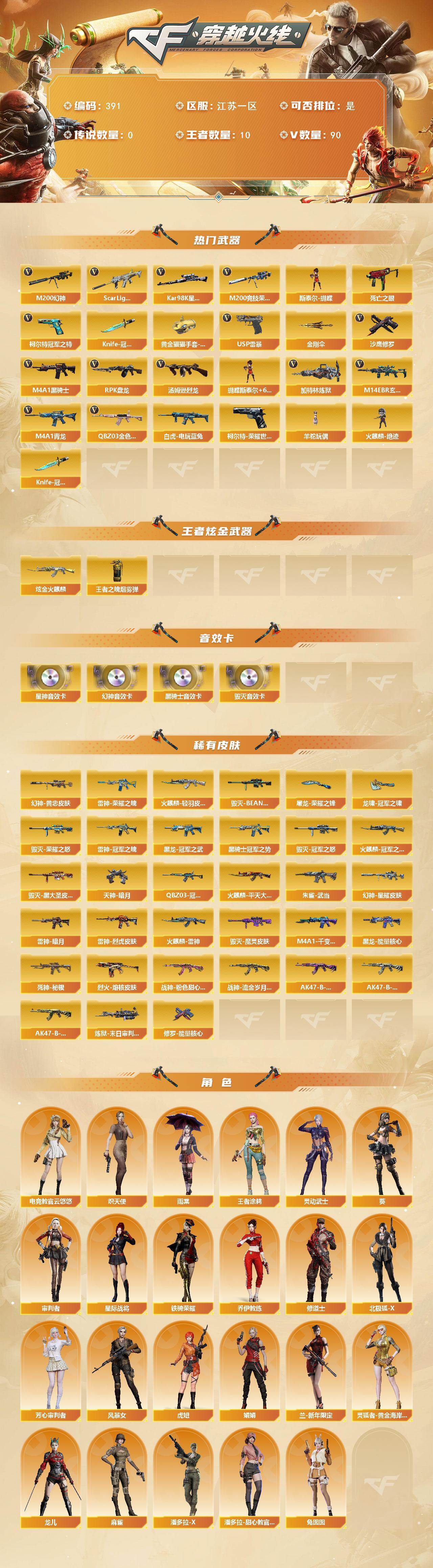 【391】特17225东部江苏一区可排位可二次【江苏一区/90v/vip6】【生化爆破全能/幻神三件套/星神带音效卡/6烈龙蝴蝶/6盘龙炼狱/竞技荣光套/武圣套/10手呛拉满/q三件套】【m200-幻神/m200-幻神音效卡/m200-幻神-黄忠皮肤/幻神-星耀 皮肤】【m200-竞技荣光】【kar98k-星神/kar98k-星神音效卡】【王者星神/王者白虎】【knife-冠军之刃/黄金猫猫手套-白鲨】【柯尔特-冠军之特/柯尔特-竞技荣光/usp-雷暴/柯尔特-荣耀世冠白鲨2023】【scar light-白虎】【q03-金色蔷薇/q03-金色蔷薇音效卡/q03-冠军之薇】【m4a1-雷神/雷神-荣耀之魄/雷神-冠军之魄/雷神-烈虎皮肤/雷神-暗月】【glock18-武圣】【barrett-毁灭/barrett-毁灭音效卡/毁灭-荣耀之怒/毁灭-冠军之怒/毁灭-bean-2020mvp/毁灭-魔灵皮肤】【ak47-火麒麟/火麒麟-冠军之心/火麒麟-cfstar/火麒麟-轻羽皮肤/火麒麟-雷神/火麒麟-平天大圣】【m4a1-黑骑士/m4a1-黑骑士音效卡/黑骑士-冠军之势/黑骑士-海王2】【m4a1-黑龙2/黑龙-冠军之武/黑龙-能量核心2】【hk417-朱雀-武当】【m4a1-死神2/死神-秘银/m4a1-千变-孔明皮肤】【汤姆逊-烈龙6】【rpk-盘龙6】【加特林-炼狱】【斯泰尔-蝴蝶/死亡之眼】【沙鹰-修罗4/修罗-能量核心】【沙鹰-天神】【麒麟刺3】【擎天/擎天-竞技荣光】【屠龙2/屠龙-荣耀之锋】【龙啸/龙啸-冠军之啸】【电竞教官-云悠悠/王者涂鸦/王者涂鸦/雨棠/龙儿/审判者/灵动武士/炽天使/星际战将/乔伊教练/修道士/兔囡囡/兰-新年限定/麻雀/灵狐者-黄金海岸/娟娟/潘多拉-x/铁骑荣耀/幻影/堕天使/复仇者】【m14ebr-玄武/m4a1-青龙/m4a1-玫瑰精灵2/m4a1-武圣】【白虎-电玩蓝.兔/ak47-b-常胜将军/ak47-b-身先士卒/ak47-b-战士/ak-47-猩红传说】【aa-12-雷霆】【an94-超新星/超新星-悦享】【barrett-朱雀/barrett-暗月传说2】【毛瑟-玄龙/colt 1911-大黄蜂4/cop 357-青龙/新usp-呛王排位奖励2】【斩神刀/金刚伞/金刚伞-电玩红兔/迷你深渊冰龙】【神圣爆裂者-末日iii/激光毁灭者iii/冰龙粉碎者-白马银呛】【斯泰尔-巧克力】【m4a1-小黄鸡/火麒麟-绝迹/黄金迷你深渊冰龙/夺魂/barrett-夜玫瑰】【王者森决/王者森决/王者之心/王者之魄/王者之戮】【高爆手蕾-竞技荣光2/闪光丹-竞技荣光/盐雾蛋-竞技荣光3】【高爆手蕾-幻灵3/闪光丹-幻灵3/盐雾蛋-幻灵4】【闪光丹-电竞装甲/盐雾蛋-电竞装甲】【炫金火麒麟】【语音特效-机器人】【透明护目镜/超级对讲机/超级背包/炫彩背包/防弹头盔4/防弹衣5/c4工具钳2/手蕾包3/防化服3】