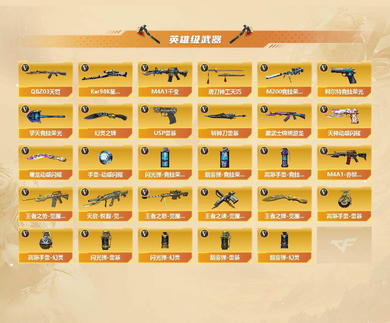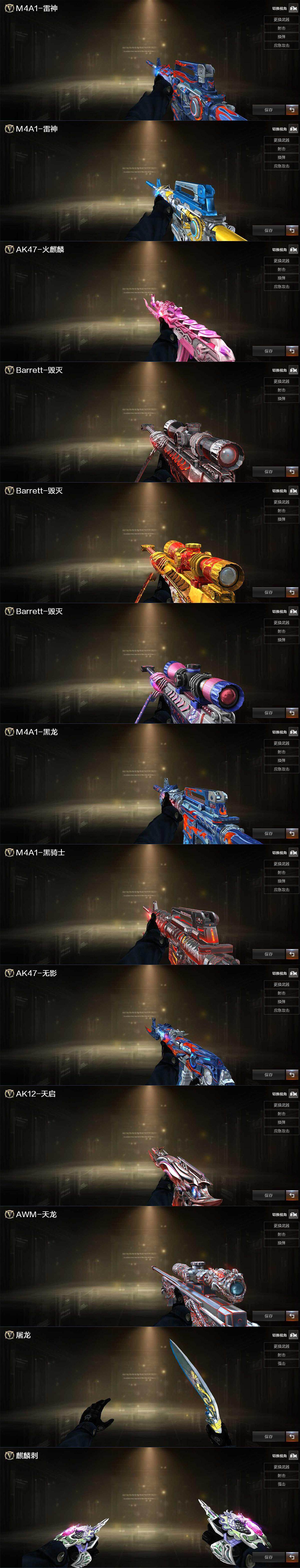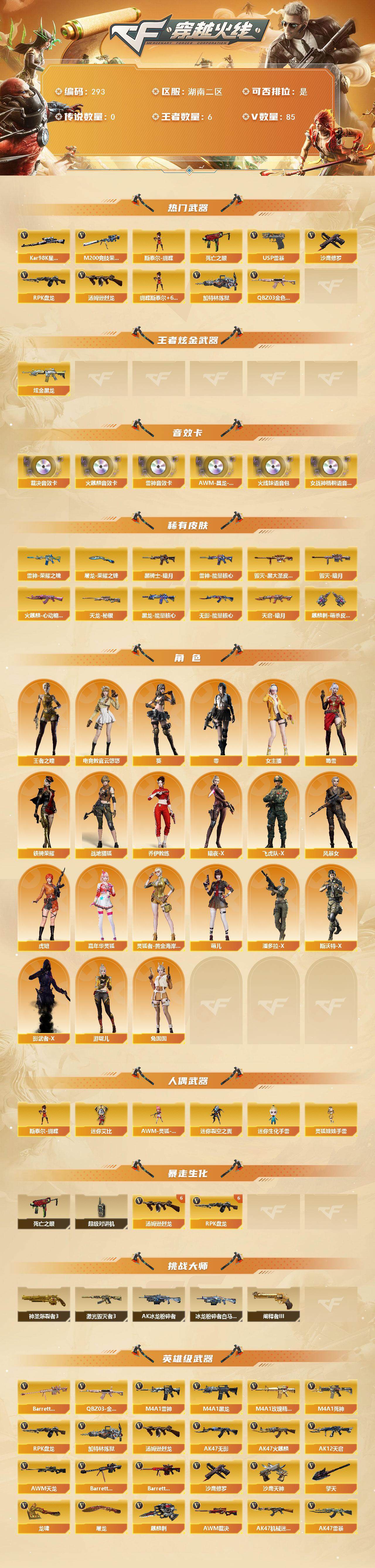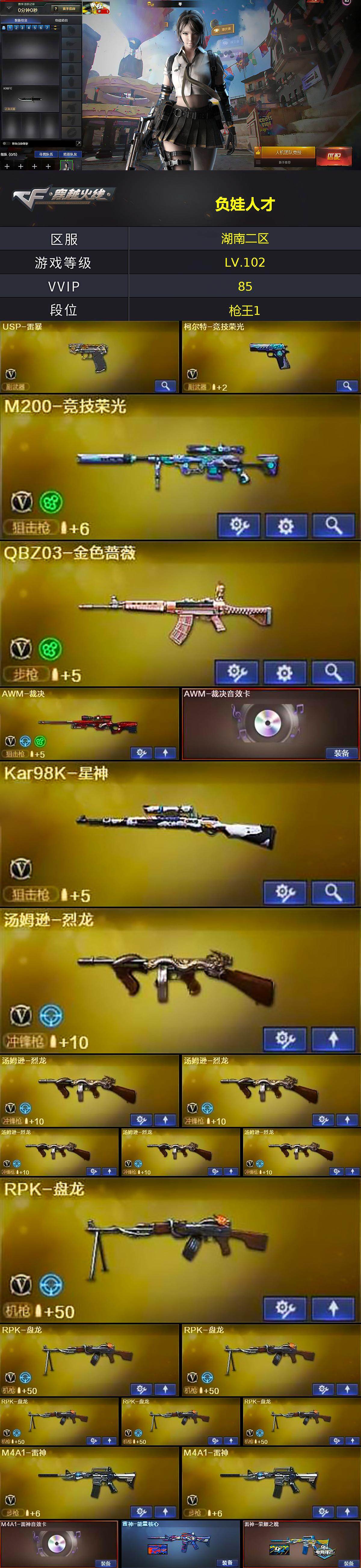 湖南二区-85v-6王者-1炫金 【热门武器】:q03-金色蔷薇,m200-竞技荣光,死亡之眼2,kar98k-星神,汤姆逊-烈龙6,rpk-盘龙6,加特林-炼狱,斯泰尔-蝴蝶,usp-雷暴,沙鹰-修罗6 【王者炫金武器】:炫金黑龙 【音效卡】:ak47-火麒麟音效卡,m4a1-雷神音效卡,awm-裁决音效卡,awm-昌龙-怀旧音效卡2,火线妹语音包,女战神梧桐语音包 【皮肤】: