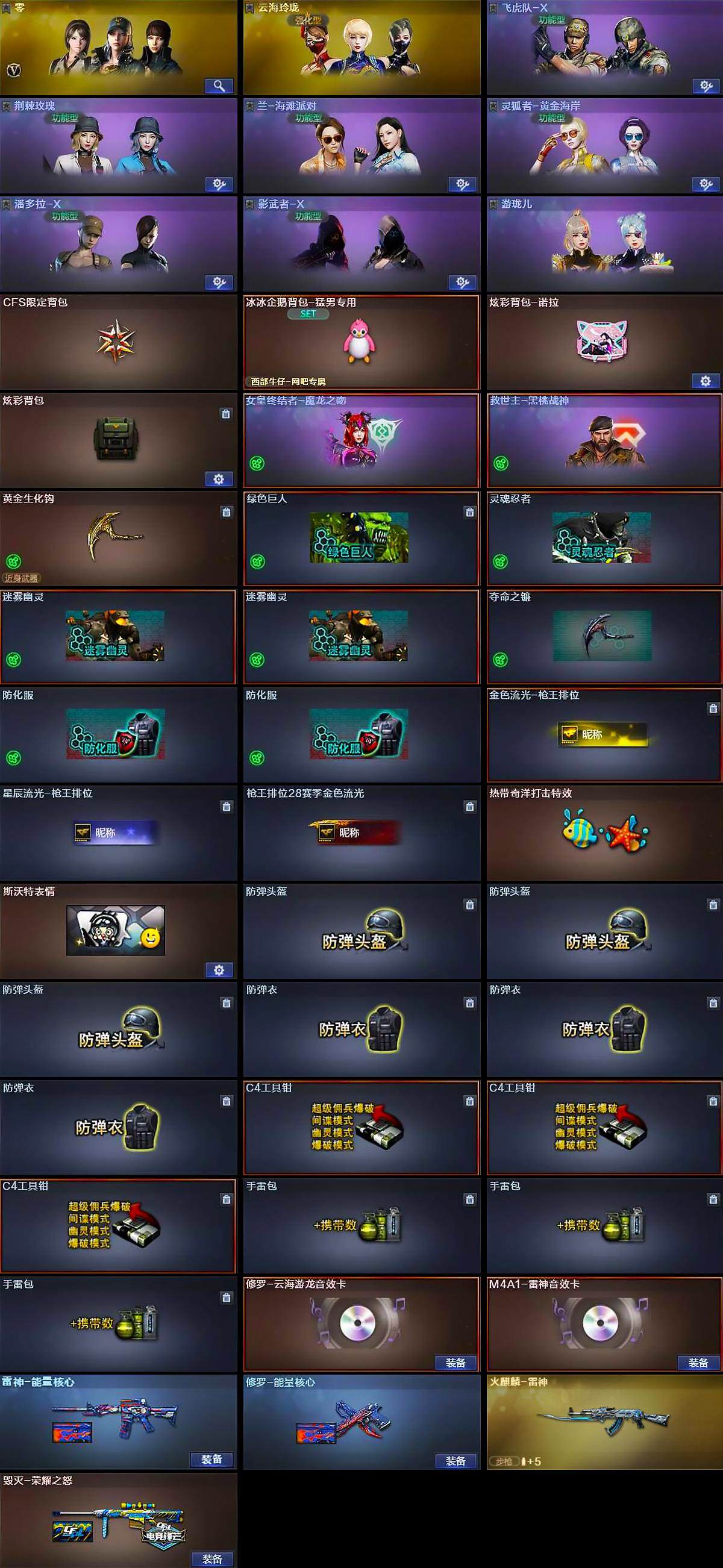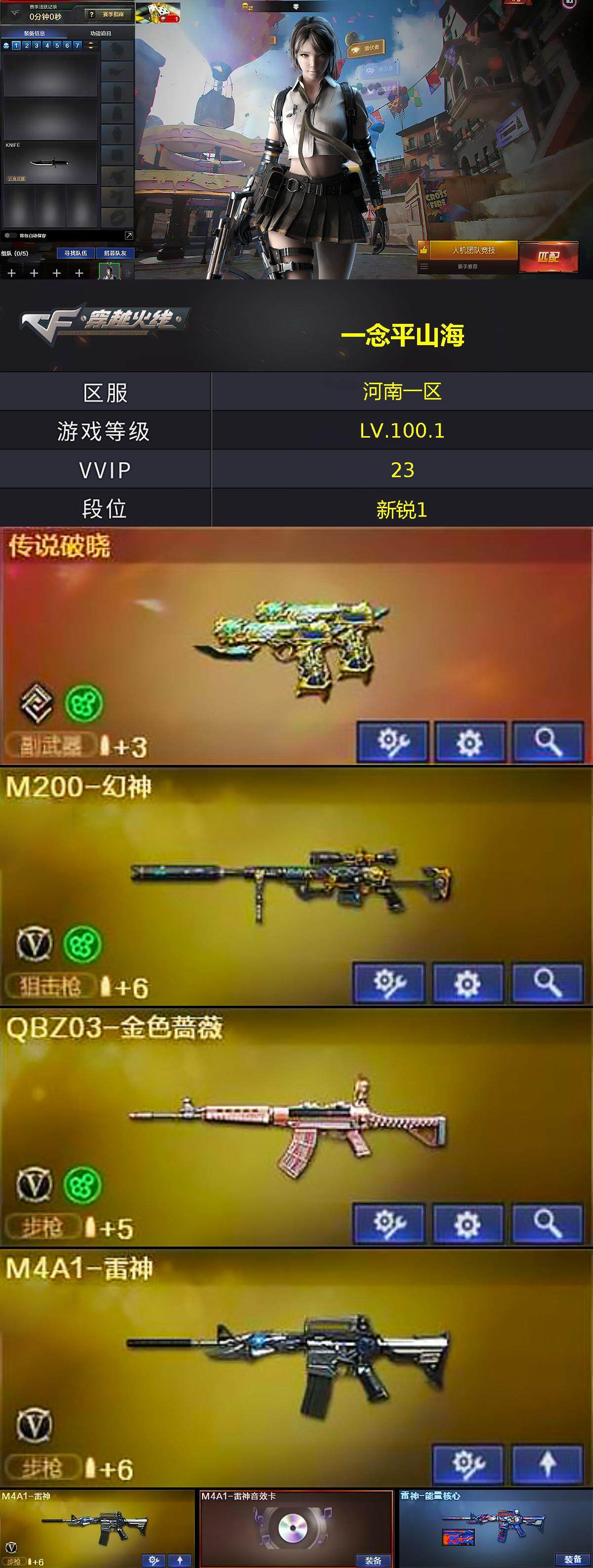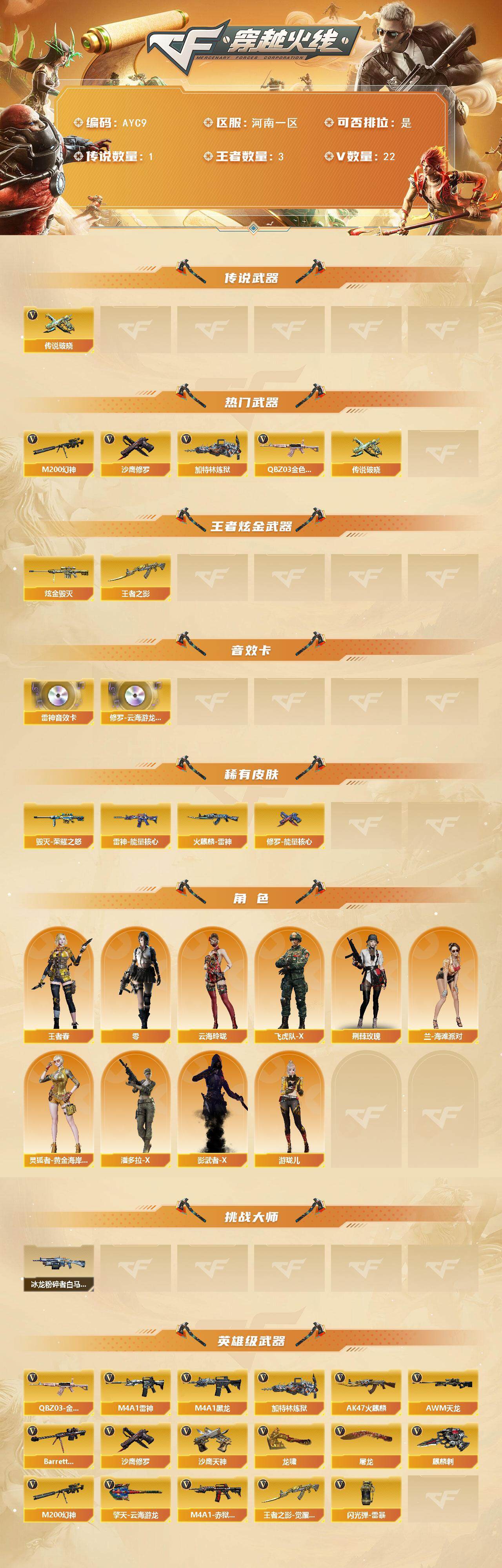 [14252738]【店主推荐捡漏号!可直接换绑】【河南一区-22v-3王者-1炫金 【传说武器】:传说破晓 【热门武器】:传说破晓,q03-金色蔷薇,m200-幻神,加特林-炼狱2,沙鹰-修罗3 【王者炫金武器】:王者之影,炫金毁灭 【音效卡】:修罗-云海游龙音效卡,m4a1-雷神音效卡 【皮肤】:雷神-能量核心,火麒麟-雷神,毁灭-荣耀之怒,修罗-能量核心 【角色】:零,王者春,云海玲珑,飞虎队-x,荆棘玫瑰,兰-海滩派对,灵狐者-黄金海岸,潘多拉-x,影武者-x,游珑儿 【挑战大师】:冰龙粉碎者-白马银呛 【英雄级武器】:ak47-火麒麟2,m4a1-黑龙,m4a1-雷神2,q03-金色蔷薇,王者之影-觉醒版,awm-天龙,barrett-毁灭,m200-幻神,加特林-炼狱2,沙鹰-修罗3,沙鹰-天神,屠龙,龙啸,麒麟刺,擎天-云海游龙,闪光丹-雷暴,m4a1-赤狱骑士 【道具】:cfs限定背包,冰冰企鹅背包-猛男专用,炫彩背包-诺拉,炫彩背包,女皇终结者-魔龙之吻,救世主-黑桃战神,黄金生化钩,绿色巨人,灵魂忍者,迷雾幽灵2,夺命之镰,防化服2,金色流光-呛王排位,星辰流光-呛王排位,呛王排位28赛季金色流光,热带奇洋打击特效,斯沃特表情,防弹头盔3,防弹衣3,c4工具钳3,手蕾包3 【特殊呛械】:2炼狱