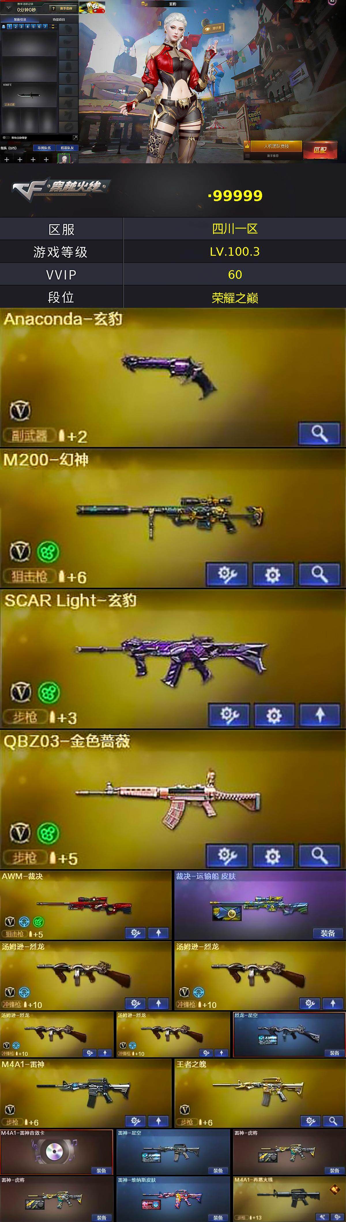 四川一区-60v-6王者-2炫金 【热门武器】:q03-金色蔷薇,m200-幻神,死亡之眼,m4a1-黑骑士,汤姆逊-烈龙4,沙鹰-修罗5 【王者炫金武器】:炫金火麒麟,炫金骑士 【音效卡】:ak47-火麒麟音效卡,m4a1-雷神音效卡,barrett-毁灭音效卡,炼狱-百战金芒-庆典舞曲音效卡,沙鹰-修罗-盛典舞曲音效卡,柯尔特-百战金芒-庆典舞曲音效卡 【皮肤】:裁决-运输船 皮肤