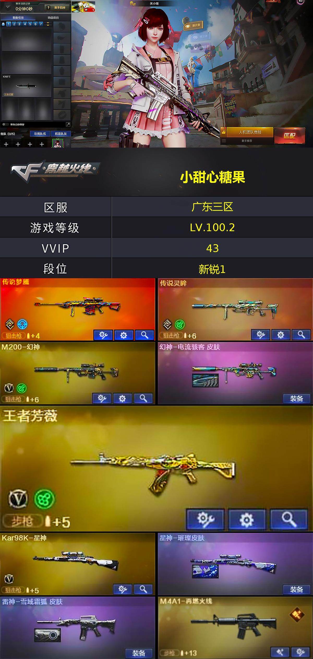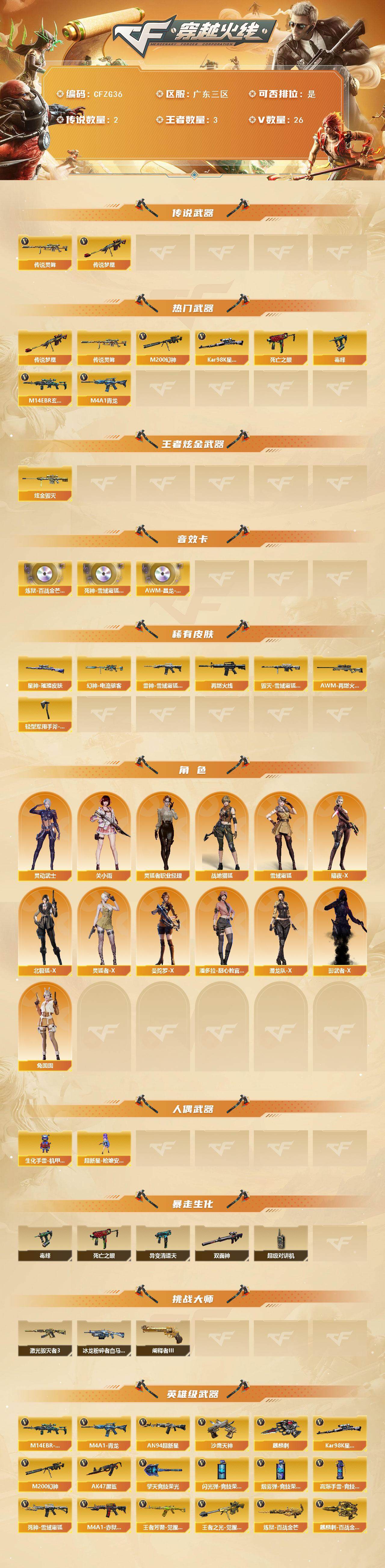 【cfzg36】23v/100级/元帅/2传说/3王者/1炫金/3英雄/传说梦魇/传说灵眸/m14ebr-玄武/m4a1-青龙/m200-幻神/死亡之眼/kar98k-星神/毒蜂/炫金毁灭/炼狱-百战金芒-庆典舞曲音效卡/死神-雪域霜狐-怀旧音效卡/awm-昌龙-怀旧音效卡/幻神-电流骇客 皮肤/星神-璀璨皮肤/雷神-雪域霜狐 皮肤/m4a1-再燃火线/毁灭-雪域霜狐 皮肤/awm-再燃火线/轻型军用手斧-再燃火线/关小雨/战地猎狐/雪域霜狐/暗夜-x/北极狐-x/灵动武士/灵狐者-x/灵狐者-职业经理/曼陀罗-x/潘多拉-甜心教官/潜龙队-x/兔囡囡/影武者-x/超新星-呛娘安琪儿/生化手蕾-机甲核心/异变清道夫/双面神/超级对讲机/冰龙粉碎者-白马银呛/激光毁灭者iii/阐释者iii/an94-超新星/ak47-黑鲨/死神-雪域霜狐/王者芳薇-觉醒版/王者之光-觉醒版/炼狱-百战金芒/沙鹰-天神/麒麟刺/擎天-竞技荣光/麒麟刺-百战金芒/高爆手蕾-竞技荣光/闪光丹-竞技荣光/盐雾蛋-竞技荣光/m4a1-赤狱骑士/bs战队炫彩背包/亚洲杯纪念炫彩背包/战舰背包/百战金芒炫彩背包/背包-洛丽塔/超级背包/雪域霜狐炫彩背包/女皇终结者-魔龙之吻/救世主-黑桃战神/黄金生化钩/绿色巨人/灵魂忍者/变异宝贝/迷雾幽灵/生化弹匣/夺命之镰/防化服/金色流光-呛王排位/星辰流光-呛王排位/流光-鎏金之域/流光-再燃火线/呛王排位28赛季金色流光/呛王排位29赛季金色流光/语音特效-盛典烟火/语音特效-怀旧/雪域霜狐表情/萌萌小葵表情/炽雪表情/c4-再燃火线/防弹头盔/防弹衣/c4工具钳/手蕾包