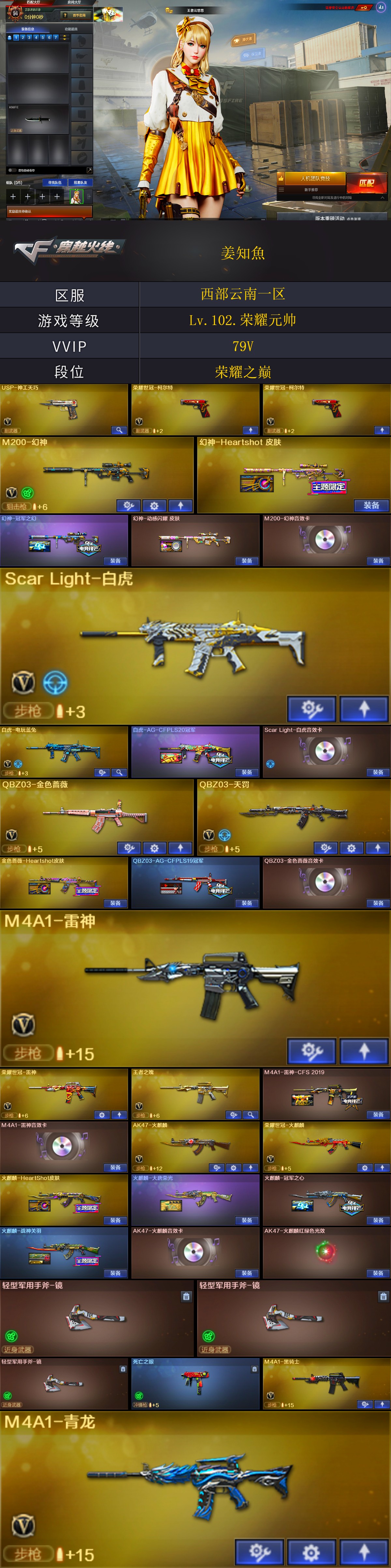 【★找回包赔★西部363】:西部云南一区-79v-可二次实名-【lv.102.荣耀元帅】-【段位:荣耀之巅】m200-幻神/幻神-heartshot皮肤/幻神-冠军之幻/幻神-动感闪耀皮肤/scarlight-白虎/白虎-电玩蓝兔/白虎-ag-cfpls20冠军/q03-金色蔷薇/q03-天罚/q03-ag-cfpls19冠军/金色蔷薇-heartshot皮肤/usp-神工天巧/荣耀世冠-柯尔特2/m4a1-青龙/m4a1-黑骑士/m4a1-雷神-cfs2019/火麒麟-大唐荣光/火麒麟-冠军之心/火麒麟-heartshot皮肤/毁灭-冠军之怒/毁灭-heartshot皮肤/m200-幻神音效卡/scar light-白虎音效卡/q03-金色蔷薇音效卡/barrett-毁灭音效卡(截图展示段位不代表实际段位,如赛季更新等不可抗拒因素发生变化,其余道具看截图或咨询客服)