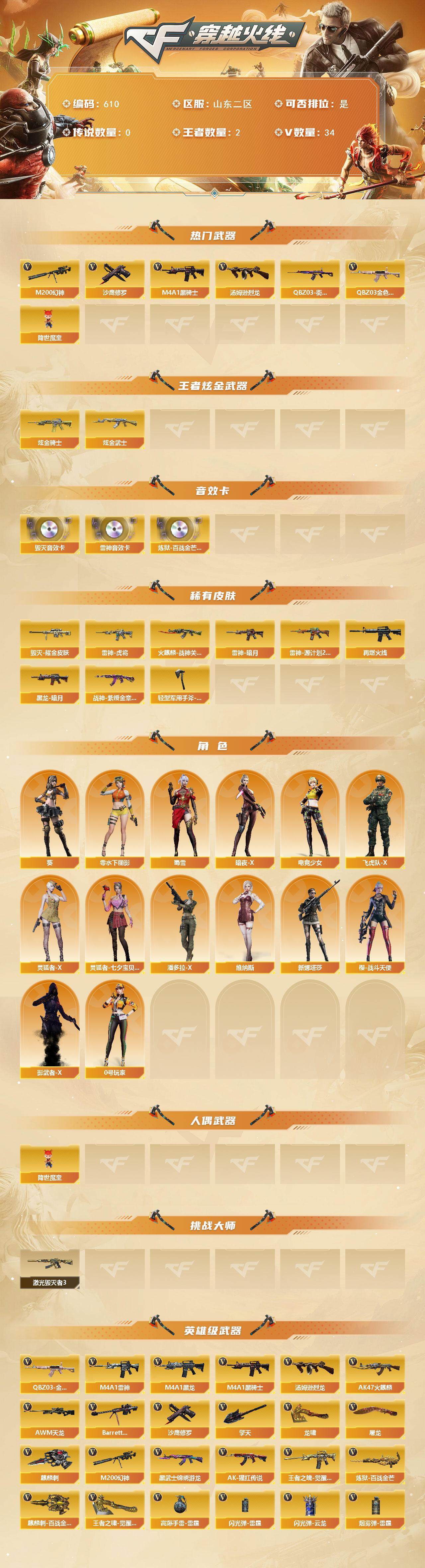 [14267764]山东二区-34v-2王者-2炫金 【热门武器】:q03-金色蔷薇,m200-幻神,q03-街机,m4a1-黑骑士,汤姆逊-烈龙3,降世魔童,沙鹰-修罗3 【王者炫金武器】:炫金骑士,炫金武士 【音效卡】:m4a1-雷神音效卡,barrett-毁灭音效卡,炼狱-百战金芒-庆典舞曲音效卡 【皮肤】:雷神-暗月,雷神-虎将,雷神-源计划2.0专属 皮肤,m4a1-再燃火线,火麒麟-战神关羽,毁灭耀金皮肤,黑龙-暗月,战神-紫绶金章皮肤,轻型军用手斧-再燃火线 【角色】:葵,暗夜-x,电竞少女,飞虎队-x,0号玩家,零-水下丽影,灵狐者-x,灵狐者-七夕宝贝,潘多拉-x,蜀雪,维纳斯,新娜塔莎,樱-战斗天使,影武者-x 【人偶武器】:降世魔童 【挑战大师】:激光毁灭者iii 【英雄级武器】:ak47-火麒麟,m4a1-黑龙,m4a1-雷神,m4a1-黑骑士,黑武士-锦绣游龙,q03-金色蔷薇,王者之魄-觉醒版,ak-47-猩红传说2,awm-天龙,barrett-毁灭,m200-幻神,炼狱-百战金芒,汤姆逊-烈龙3,沙鹰-修罗3,屠龙2,龙啸,擎天,麒麟刺,麒麟刺-百战金芒,王者之啸-觉醒版,高爆手蕾-雷霆,闪光丹-雷霆,闪光丹-云龙,盐雾蛋-雷霆 【道具】:cfs限定背包,战舰背包,炫彩背包,百战金芒炫彩背包,女皇终结者-魔龙之吻,妩媚妖姬,绿色巨人,灵魂忍者,迷雾幽灵,夺命之镰,防化服3,金色流光-呛王排位,呛王排位28赛季金色流光,语音特效-盛典烟火,萌萌小葵表情,ep战队名片,ep战队喷图,防弹头盔3,防弹衣4,c4工具钳3,手蕾包3 【特殊呛械】:1黑骑士,3烈龙