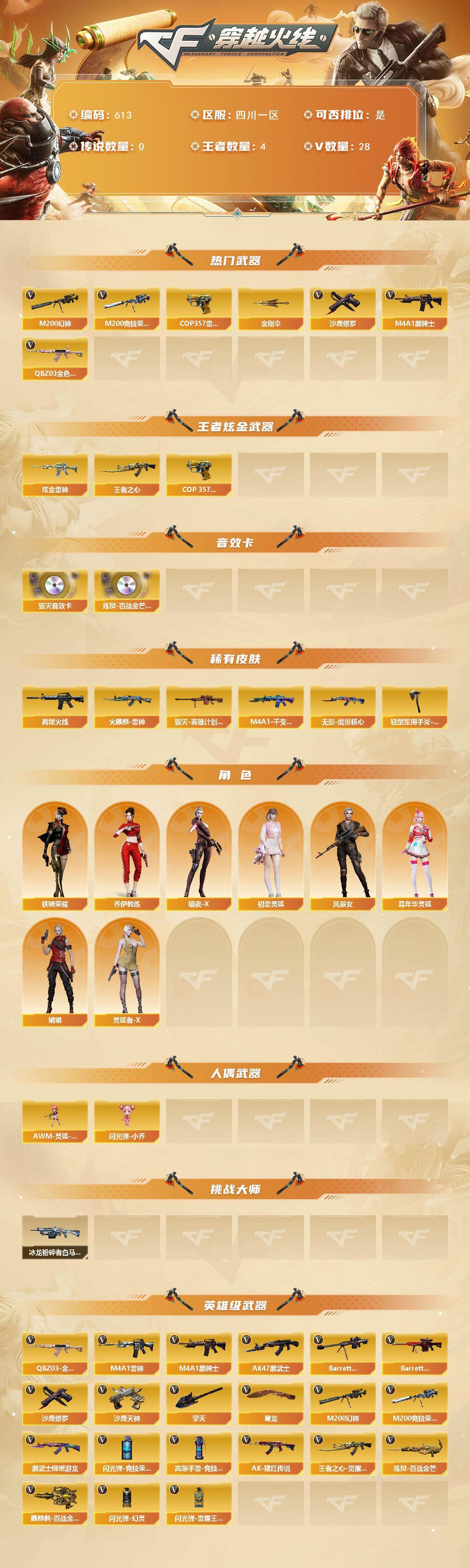 [14269605]四川一区-28v-4王者-2炫金 【热门武器】:q03-金色蔷薇,m200-幻神,m200-竞技荣光,m4a1-黑骑士,cop 357-雷霆王者,沙鹰-修罗2,金刚伞 【王者炫金武器】:王者之心,cop 357-雷霆王者,炫金雷神2 【音效卡】:barrett-毁灭音效卡,炼狱-百战金芒-庆典舞曲音效卡 【皮肤】:m4a1-再燃火线,火麒麟-雷神,毁灭-英雄计划 皮肤,m4a1-千变-孔明皮肤,无影-能量核心,轻型军用手斧-再燃火线 【角色】:乔伊教练,暗夜-x,初恋灵狐,风暴女2,嘉年华灵狐,娟娟,灵狐者-x,铁骑荣耀 【人偶武器】:awm-灵狐-15周年嘉年华,闪光丹-小乔 【挑战大师】:冰龙粉碎者-白马银呛 【英雄级武器】:m4a1-雷神2,m4a1-黑骑士,ak47-黑武士,黑武士-锦绣游龙,q03-金色蔷薇,王者之心-觉醒版,ak-47-猩红传说,barrett-毁灭,barrett-极光,m200-幻神,m200-竞技荣光,炼狱-百战金芒,沙鹰-修罗2,沙鹰-天神4,屠龙,擎天,麒麟刺-百战金芒,高爆手蕾-竞技荣光,闪光丹-幻灵,闪光丹-竞技荣光,闪光丹-雷霆王者-觉醒版 【道具】:百战金芒炫彩背包,虎牙炫彩背包,超级背包,女皇终结者-魔龙之吻,夺命之镰,防化服,金色流光-呛王排位2,星辰流光-呛王排位,呛王排位28赛季金色流光,呛王排位29赛季金色流光,语音特效-盛典烟火,萌萌小葵表情,防弹头盔,防弹衣,c4工具钳,手蕾包 【特殊呛械】:1黑骑士