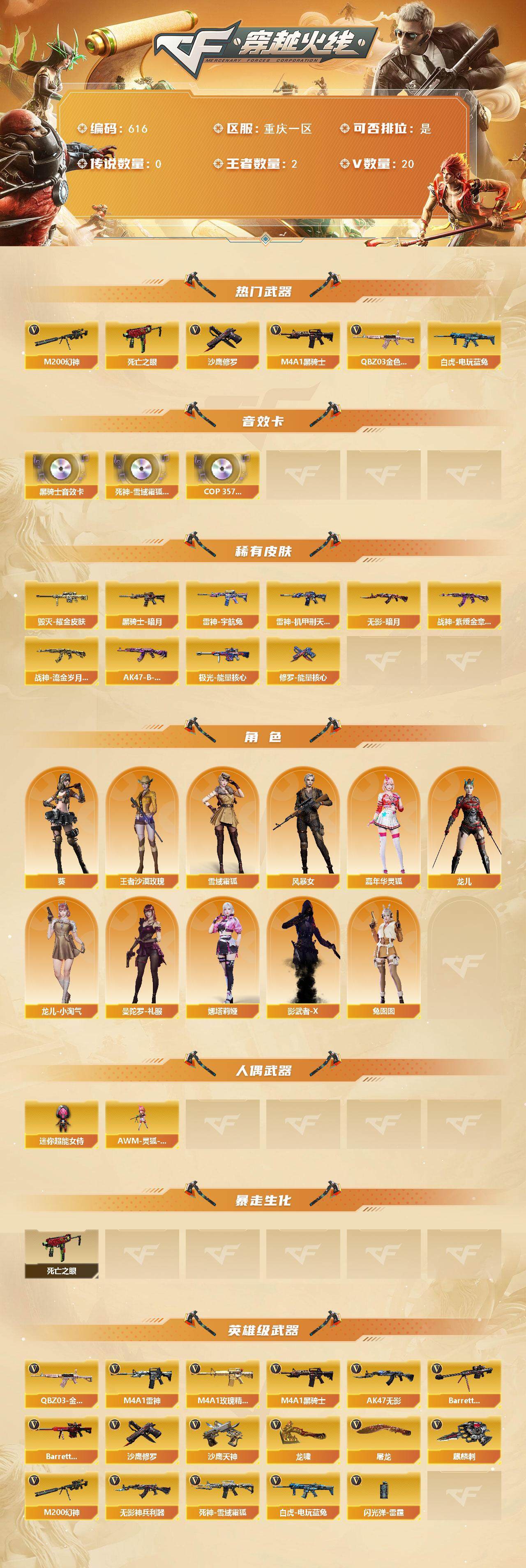 [14272292]重庆一区-20v-2王者-0炫金 【热门武器】:q03-金色蔷薇,m200-幻神,死亡之眼,白虎-电玩蓝兔,m4a1-黑骑士,沙鹰-修罗 【音效卡】:m4a1-黑骑士音效卡,死神-雪域霜狐-怀旧音效卡,cop 357-雪域霜狐-怀旧音效卡 【皮肤】:雷神-机甲刑天皮肤,雷神-宇航兔皮肤,毁灭耀金皮肤,黑骑士-暗月,无影-暗月,战神-紫绶金章皮肤,战神-流金岁月皮肤2,ak47-b-常胜将军-曹操,极光-能量核心,修罗-能量核心 【角色】:葵,王者沙漠玫瑰,雪域霜狐,风暴女,嘉年华灵狐,龙儿,龙儿-小淘气,曼陀罗-礼服,娜塔莉娅,兔囡囡,影武者-x 【人偶武器】:awm-灵狐-15周年嘉年华,迷你超能女侍 【暴走生化】:死亡之眼 【英雄级武器】:m4a1-雷神,m4a1-黑骑士,ak47-无影2,无影-神兵利器,死神-雪域霜狐,m4a1-玫瑰精灵,q03-金色蔷薇,白虎-电玩蓝兔,barrett-毁灭2,barrett-极光,m200-幻神,沙鹰-修罗,沙鹰-天神,屠龙,龙啸,麒麟刺,闪光丹-雷霆 【道具】:亚洲杯纪念炫彩背包,战舰背包,炫彩背包,雪域霜狐炫彩背包,救世主-黑桃战神,绿色巨人,灵魂忍者,迷雾幽灵,夺命之镰,防化服2,金色流光-呛王排位2,流光-再燃火线,呛王排位29赛季金色流光,语音特效-怀旧,雪域霜狐表情,电玩兔兔表情,c4-再燃火线,防弹头盔2,防弹衣2,c4工具钳2,手蕾包2 【特殊呛械】:1黑骑士
