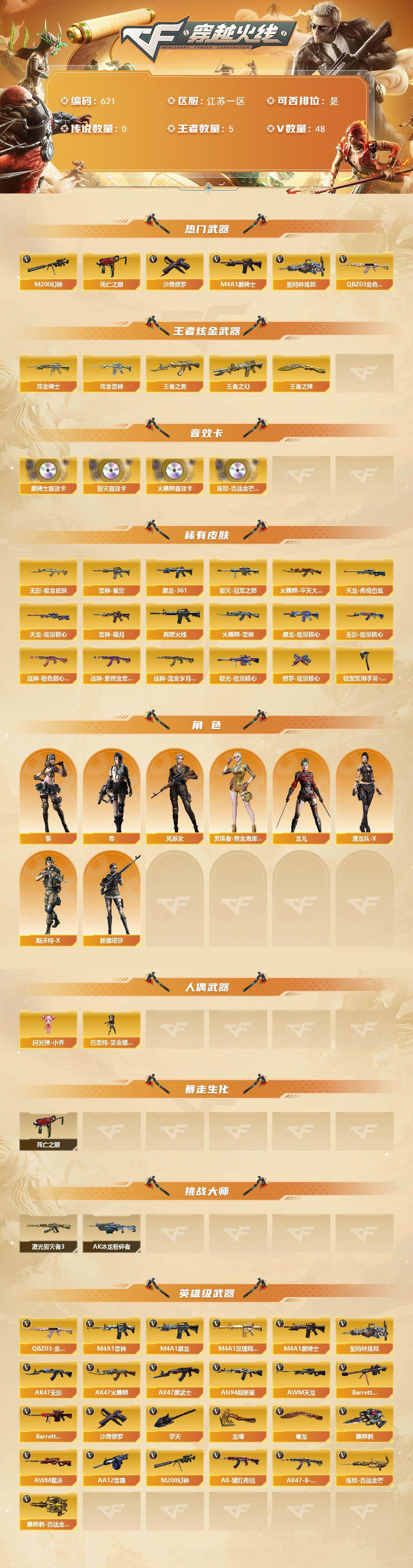 [14274965]江苏一区-48v-5王者-2炫金 【热门武器】:q03-金色蔷薇,m200-幻神,死亡之眼2,m4a1-黑骑士,加特林-炼狱,沙鹰-修罗 【王者炫金武器】:王者之幻2,王者之翼,王者之锋,炫金骑士,炫金雷神 【音效卡】:ak47-火麒麟音效卡,m4a1-黑骑士音效卡,barrett-毁灭音效卡,炼狱-百战金芒-庆典舞曲音效卡 【皮肤】:雷神-暗月,雷神-星空,m4a1-再燃火线,火麒麟-雷神,火麒麟-平天大圣,毁灭-冠军之怒,黑龙-能量核心,m4a1-黑龙-361,无影-能量核心,无影耀金皮肤,战神-粉色甜心皮肤,战神-紫绶金章皮肤5,战神-流金岁月皮肤,天龙-能量核心,awm-天龙-传奇白鲨,极光-能量核心,修罗-能量核心,轻型军用手斧-再燃火线 【角色】:零,葵,风暴女,灵狐者-黄金海岸,龙儿,潜龙队-x,斯沃特-x,新娜塔莎 【人偶武器】:闪光丹-小乔,芭蕾特-赏金猎人 【暴走生化】:死亡之眼2 【挑战大师】:ak47-冰龙粉碎者,激光毁灭者iii 【英雄级武器】:ak47-火麒麟,m4a1-黑龙,m4a1-雷神3,m4a1-黑骑士,ak47-无影2,ak47-黑武士,an94-超新星2,m4a1-玫瑰精灵,q03-金色蔷薇,ak-47-猩红传说8,ak47-b-战神,awm-天龙4,barrett-毁灭,barrett-极光,awm-裁决,m200-幻神,加特林-炼狱,炼狱-百战金芒,aa-12-雷霆,沙鹰-修罗,屠龙2,龙啸,擎天,麒麟刺2,麒麟刺-百战金芒 【道具】:bs战队炫彩背包,云山科技背包,炫彩背包,百战金芒炫彩背包,超级背包,女皇终结者-魔龙之吻,黄金生化钩,绿色巨人,灵魂忍者,迷雾幽灵,夺命之镰,防化服3,呛王排位29赛季金色流光,语音特效-盛典烟火,萌萌小葵表情,c4-沙漠,防弹头盔10,防弹衣12,c4工具钳9,手蕾包9 【特殊呛械】:1黑骑士,1炼狱