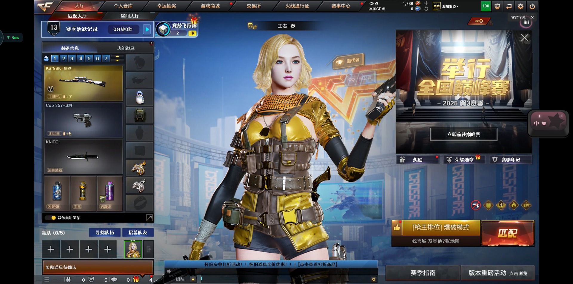 5王者武器 3炫金武器 22v武器 可二次 可修改实名 【排位资格】:有 【v武器】:ak47-火麒麟ak47-黑鲨ak47-机械迷城ak-47-猩红传说m4a1-雷神m4a1-龙血m4a1-玫瑰精灵barrett-毁灭barrett-暗月传说q03-金色蔷薇沙鹰-修罗屠