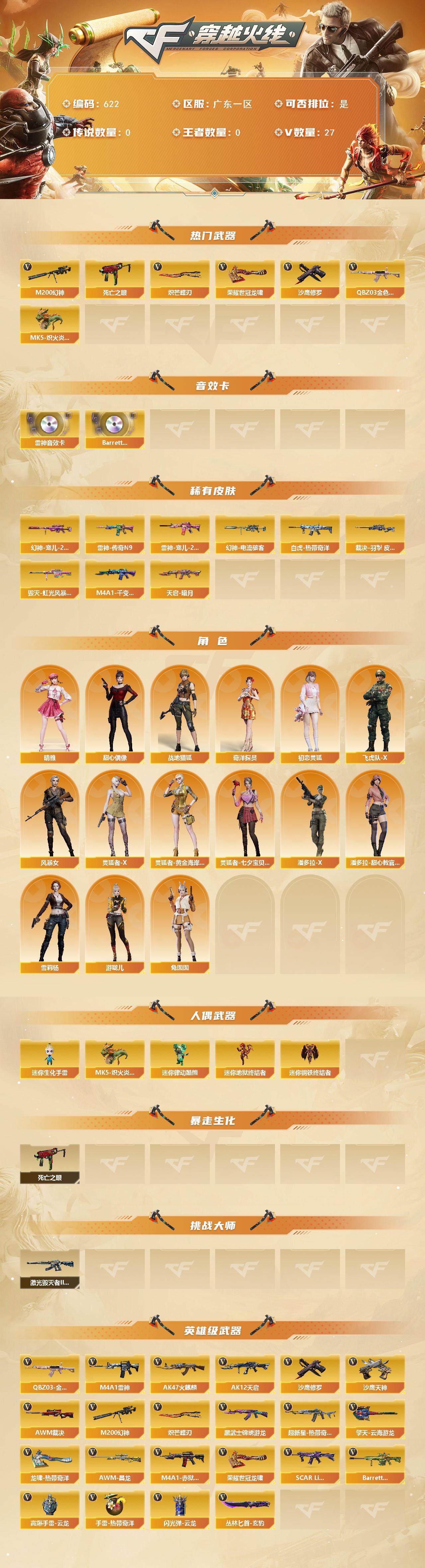 [14275682]广东一区-27v-0王者-0炫金 【热门武器】:q03-金色蔷薇,m200-幻神,死亡之眼,mk5-炽火炎龙,沙鹰-修罗2,炽芒蝶刃,荣耀世冠-龙啸 【音效卡】:m4a1-雷神音效卡,barrett-碧霄极光音效卡 【皮肤】:幻神-宠儿-2021mvp,幻神-电流骇客 皮肤,白虎-热带奇洋 皮肤,裁决-羽掣 皮肤,雷神-传奇n9,雷神-宠儿-2019mvp,毁灭-虹光风暴 皮肤,m4a1-千变-孔明皮肤,天启-暗月 【角色】:晴雅,战地猎狐,奇洋探员,初恋灵狐,飞虎队-x,风暴女,灵狐者-x,灵狐者-黄金海岸,灵狐者-七夕宝贝,潘多拉-x,潘多拉-甜心教官,甜心偶像,兔囡囡,雪莉杨,游珑儿 【人偶武器】:迷你钢铁终结者,mk5-炽火炎龙,迷你律动酷熊,迷你地狱终结者,迷你生化手蕾 【暴走生化】:死亡之眼 【挑战大师】:激光毁灭者iii-白马银呛 【英雄级武器】:ak47-火麒麟,m4a1-雷神,ak12-天启2,黑武士-锦绣游龙,超新星-热带奇洋,scar light-玄豹,q03-金色蔷薇,awm-裁决,m200-幻神,沙鹰-修罗2,沙鹰-天神2,炽芒蝶刃,擎天-云海游龙,龙啸-热带奇洋,荣耀世冠-龙啸,丛林匕首-玄豹,高爆手蕾-云龙2,手蕾-热带奇洋,闪光丹-云龙,m4a1-赤狱骑士,awm-昌龙,barrett-碧霄极光 【道具】:泡泡象背包,bs战队炫彩背包,cfs限定背包,云山科技背包,冰冰企鹅背包-猛男专用,冰冰企鹅背包,奇洋探员-海龟背包,炫彩背包-诺拉,热带奇洋炫彩背包,超级背包,女皇终结者-魔龙之吻,救世主-黑桃战神,绿色巨人,灵魂忍者2,变异宝贝,迷雾幽灵2,生化弹匣,夺命之镰,防化服3,金色流光-呛王排位,星辰流光-呛王排位,流光-再燃火线,呛王排位28赛季金色流光,呛王排位29赛季金色流光,芳心审判者表情,热带奇洋表情,炽雪表情,防弹头盔3,防弹衣3,c4工具钳3,手蕾包3 【特殊呛械】: