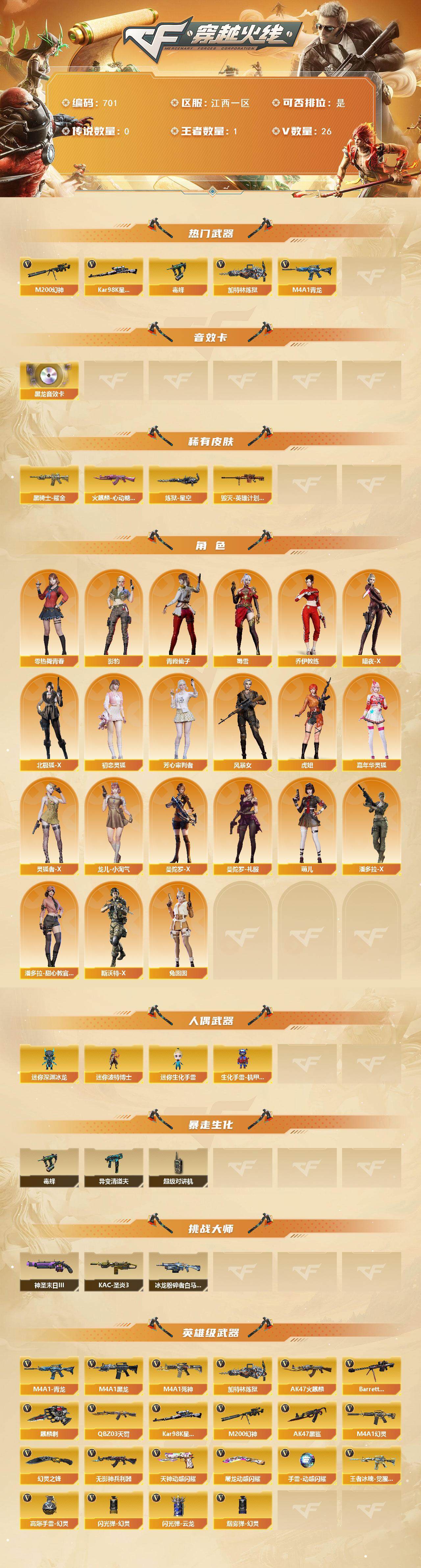 [14276364]江西一区-26v-1王者-0炫金 【热门武器】:m4a1-青龙,m200-幻神,kar98k-星神,毒蜂,加特林-炼狱2 【音效卡】:m4a1-黑龙音效卡 【皮肤】:火麒麟-心动糖果,毁灭-英雄计划 皮肤,黑骑士耀金皮肤,炼狱-星空 【角色】:影豹,乔伊教练,暗夜-x,北极狐-x,初恋灵狐,芳心审判者,风暴女,虎妞,嘉年华灵狐,零-热舞青春,灵狐者-x,龙儿-小淘气,曼陀罗-x,曼陀罗-礼服,萌儿,潘多拉-x,潘多拉-甜心教官,青霞仙子,斯沃特-x,蜀雪,兔囡囡 【人偶武器】:迷你深渊冰龙,迷你波特博士,迷你生化手蕾2,生化手蕾-机甲核心 【暴走生化】:毒蜂,异变清道夫,超级对讲机 【挑战大师】:冰龙粉碎者-白马银呛,kac-圣炎切割者iii,神圣爆裂者-末日iii 【英雄级武器】:ak47-火麒麟,m4a1-黑龙,m4a1-死神,ak47-黑鲨,m4a1-青龙,m4a1-幻灵,q03-天罚,无影-神兵利器,王者冰魄-觉醒版,barrett-毁灭,m200-幻神,kar98k-星神,加特林-炼狱2,天神-动感闪耀,麒麟刺,幻灵之锋,屠龙-动感闪耀,高爆手蕾-幻灵,手蕾-动感闪耀,闪光丹-幻灵,闪光丹-云龙,盐雾蛋-幻灵2 【道具】:炫彩背包,超级背包,救世主-黑桃战神,绿色巨人,灵魂忍者,迷雾幽灵,夺命之镰,防化服2,金色流光-呛王排位2,星辰流光-呛王排位,巅峰赛先锋-金色流光,呛王排位28赛季金色流光,呛王排位29赛季金色流光,动感闪耀表情,ep战队名片,ep战队喷图,防弹头盔2,防弹衣2,c4工具钳2,手蕾包2 【特殊呛械】:2炼狱