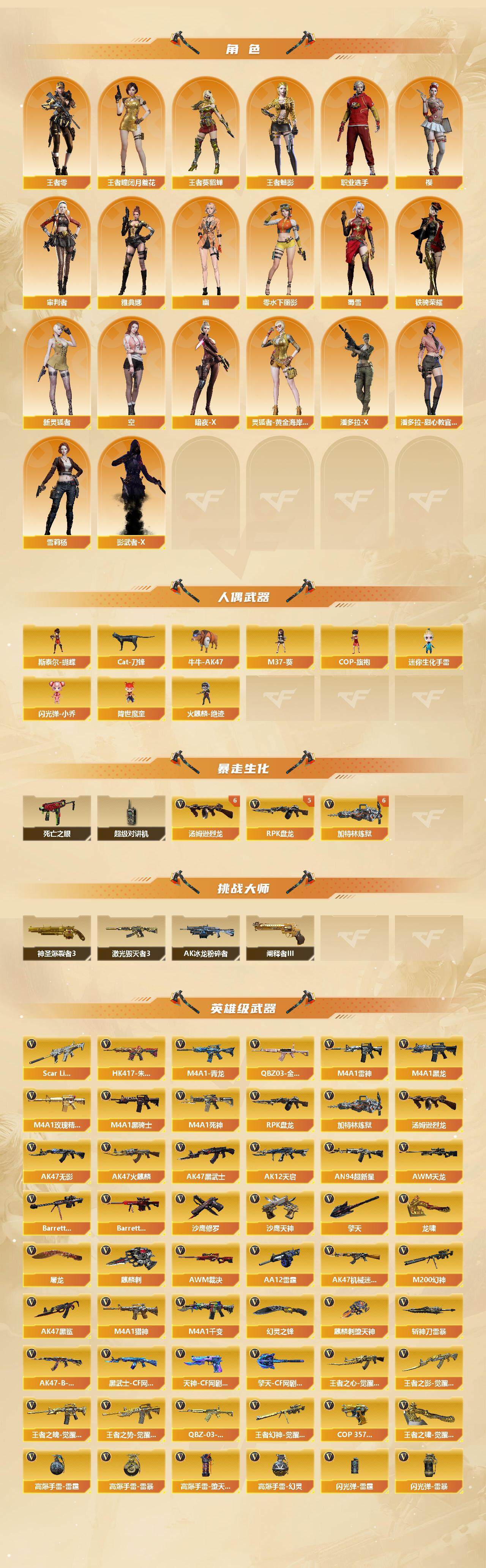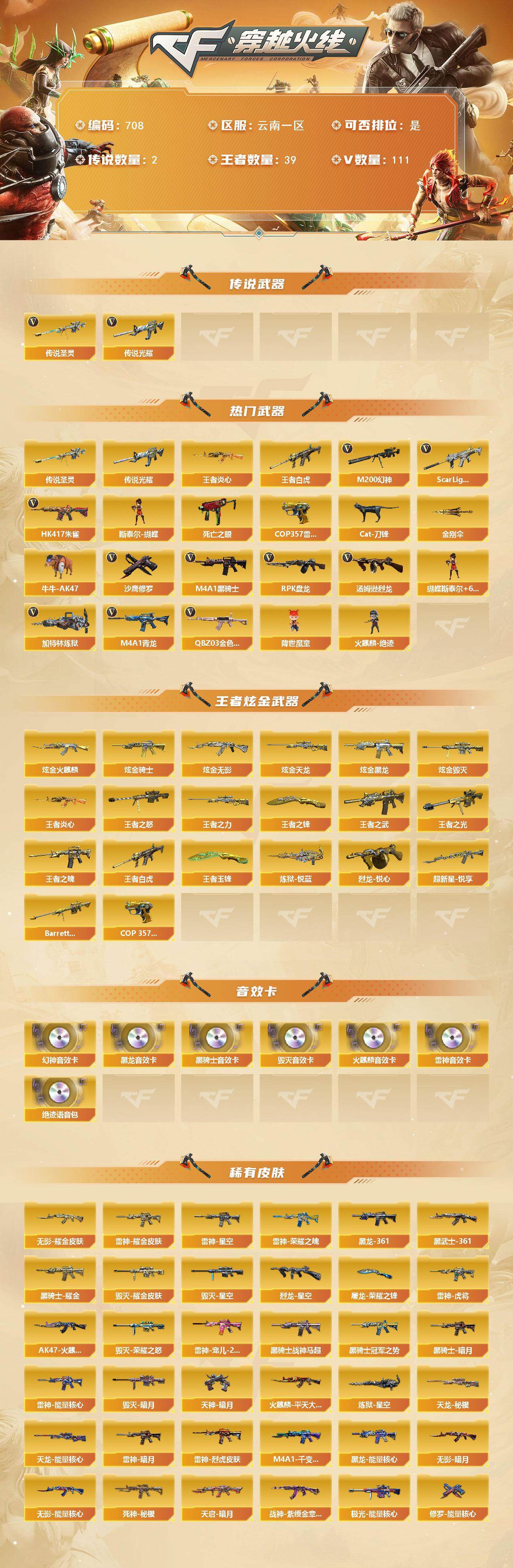 [14276852]云南一区-111v-39王者-7炫金 【传说武器】:传说光耀,传说圣灵 【热门武器】:传说光耀,传说圣灵,王者白虎,q03-金色蔷薇3,scar light-白虎,hk417-朱雀,m4a1-青龙,m200-幻神,死亡之眼4,王者炎心,cat-刀锋,牛牛-ak47,m4a1-黑骑士3,汤姆逊-烈龙7,rpk-盘龙5,加特林-炼狱6,斯泰尔-蝴蝶,降世魔童,火麒麟-绝迹,cop 357-雷霆王者,沙鹰-修罗4,金刚伞 【王者炫金武器】:王者炎心,超新星-悦享,王者之武3,王者之魄,王者白虎,王者之光2,王者之怒,王者之力2,barrett-雷霆王者,炼狱-悦蓝4,烈龙-悦心2,cop 357-雷霆王者,王者之锋2,王者玉锋,炫金火麒麟,炫金骑士,炫金无影,炫金黑龙,炫金毁灭2,炫金天龙 【音效卡】:m200-幻神音效卡,ak47-火麒麟音效卡,m4a1-雷神音效卡,m4a1-黑龙音效卡,m4a1-黑骑士音效卡,barrett-毁灭音效卡,绝迹语音包 【皮肤】:烈龙-星空,雷神-暗月,雷神-能量核心,雷神-荣耀之魄,雷神-星空,雷神-虎将,雷神-耀金皮肤,雷神-宠儿-2019mvp,雷神-烈虎皮肤,ak47-火麒麟-传奇even,火麒麟-平天大圣,毁灭-暗月3,毁灭-荣耀之怒,毁灭耀金皮肤,毁灭-星空,m4a1-千变-孔明皮肤,黑龙-能量核心2,m4a1-黑龙-361,黑骑士-暗月2,黑骑士耀金皮肤,黑骑士-冠军之势,黑骑士-战神马超,无影-暗月3,无影-能量核心4,无影耀金皮肤,死神-秘银3,ak47-黑武士-361,天启-暗月7,战神-紫绶金章皮肤,天龙-秘银,天龙-能量核心,极光-能量核心2,炼狱-星空,修罗-能量核心5,天神-暗月6,屠龙-荣耀之锋3 【角色】:樱,审判者,王者-瞳-闭月羞花,王者-葵-貂蝉,王者-零,王者-魅影,空,暗夜-x,零-水下丽影,灵狐者-黄金海岸,潘多拉-x,潘多拉-甜心教官,蜀雪,铁骑荣耀,新灵狐者,雪莉杨,影武者-x,幽,职业选手,雅典娜 【人偶武器】:火麒麟-绝迹,斯泰尔-蝴蝶,m37-葵,cop-旗袍,cat-刀锋,牛牛-ak47,迷你生化手蕾2,闪光丹-小乔,降世魔童 【暴走生化】:死亡之眼4,超级对讲机 【挑战大师】:神圣爆裂者iii,ak47-冰龙粉碎者,激光毁
