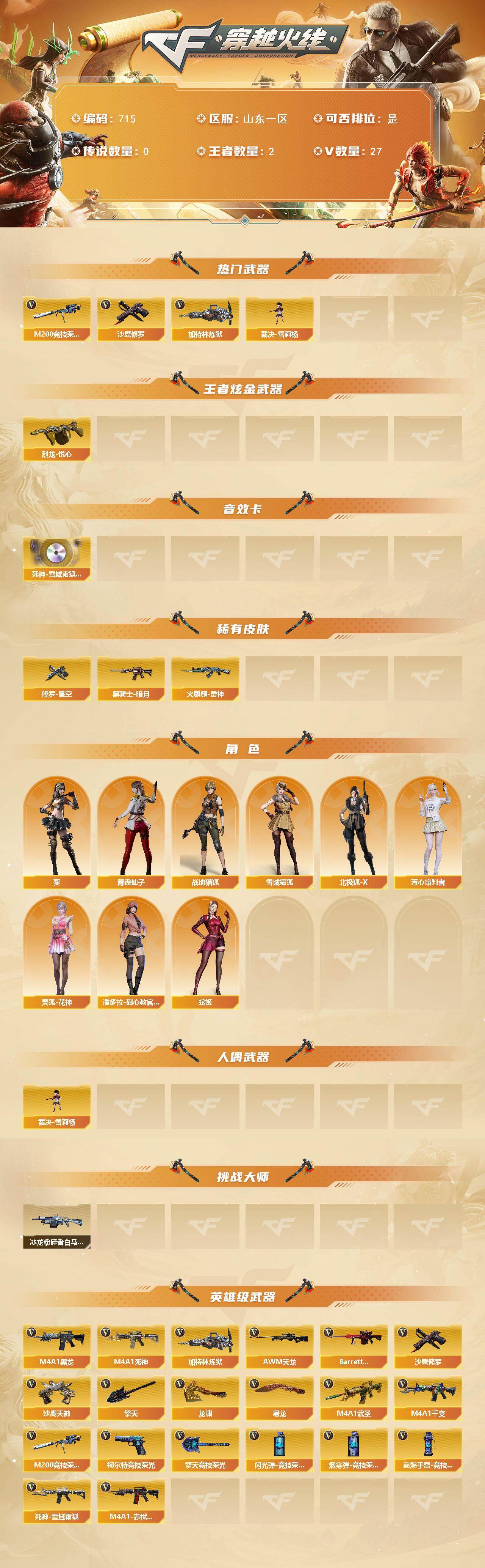 [14277244]山东一区-27v-2王者-0炫金 【热门武器】:m200-竞技荣光,加特林-炼狱,裁决-雪莉杨,沙鹰-修罗2 【王者炫金武器】:烈龙-悦心 【音效卡】:死神-雪域霜狐-怀旧音效卡 【皮肤】:火麒麟-雷神,黑骑士-暗月2,修罗-星空 【角色】:葵,战地猎狐,雪域霜狐,北极狐-x,芳心审判者,灵狐-花神,潘多拉-甜心教官,青霞仙子,蛇姬 【人偶武器】:裁决-雪莉杨 【挑战大师】:冰龙粉碎者-白马银呛 【英雄级武器】:m4a1-千变,m4a1-黑龙,m4a1-死神,m4a1-武圣,死神-雪域霜狐,awm-天龙2,barrett-极光,m200-竞技荣光,加特林-炼狱,沙鹰-修罗2,沙鹰-天神,柯尔特-竞技荣光2,屠龙,龙啸,擎天,擎天-竞技荣光,高爆手蕾-竞技荣光2,闪光丹-竞技荣光3,盐雾蛋-竞技荣光,m4a1-赤狱骑士 【道具】:云山科技背包,亚洲杯纪念炫彩背包,战舰背包,炫彩背包,雪域霜狐炫彩背包,女皇终结者-魔龙之吻,救世主-黑桃战神,绿色巨人,灵魂忍者,迷雾幽灵,夺命之镰,防化服3,呛王排位29赛季金色流光,语音特效-怀旧,雪域霜狐表情,c4-再燃火线2,防弹头盔4,防弹衣4,c4工具钳4,手蕾包4 【特殊呛械】:1炼狱