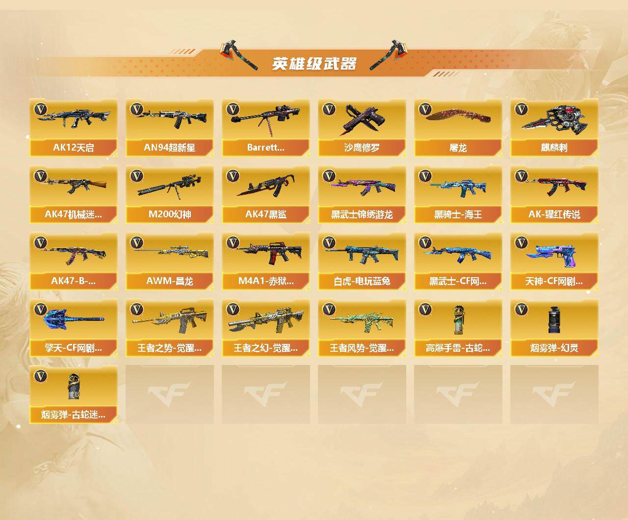 [14277283]山东一区-45v-3王者-1炫金 【热门武器】:q03-金色蔷薇,m200-幻神,修罗-古蛇迷踪,白虎-电玩蓝兔,m4a1-黑骑士,汤姆逊-烈龙,rpk-盘龙2,加特林-炼狱,沙鹰-修罗 【王者炫金武器】:炫金毁灭 【音效卡】:m4a1-黑骑士音效卡,awm-昌龙-怀旧音效卡 【皮肤】:雷神-星空,火麒麟-心动糖果,毁灭-星空,m4a1-千变-孔明皮肤,黑龙-能量核心,战神-粉色甜心皮肤,战神-紫绶金章皮肤7,战神-流金岁月皮肤5 【角色】:葵,战地猎狐,蛇隐宗,奇洋探员,乔伊教练,修道士,云海玲珑,电竞少女,芳心审判者,风暴女2,虎妞,嘉年华灵狐,娟娟,0号玩家,龙儿,潘多拉-x,潘多拉-甜心教官,潜龙队-x,青霞仙子,蛇姬,斯沃特-x,蜀雪,铁骑荣耀,雪莉杨,樱-战斗天使,影武者-x 【人偶武器】:芭蕾特-零-水下丽影,迷你深渊冰龙,迷你裂空之翼,迷你牛牛,生化手蕾-机甲核心,闪光丹-小乔,迷你艾比,迷你超能女侍 【暴走生化】:超级对讲机 【挑战大师】:ak47-冰龙粉碎者,激光毁灭者iii,试炼破坏者iii,阐释者iii2 【英雄级武器】:ak47-火麒麟2,m4a1-黑龙,m4a1-雷神2,m4a1-黑骑士,ak47-黑武士2,ak12-天启,an94-超新星,ak47-机械迷城,ak47-黑鲨,黑武士-锦绣游龙,m4a1-玫瑰精灵,q03-金色蔷薇,王者之势-觉醒版,王者之幻-觉醒版,ak-47-猩红传说4,ak47-b-战神,黑骑士-海王2,ak47-b-常胜将军,王者风势-觉醒版,白虎-电玩蓝兔,黑武士-cf网剧冠军,barrett-毁灭2,m200-幻神,rpk-盘龙2,加特林-炼狱,汤姆逊-烈龙,沙鹰-修罗,修罗-古蛇迷踪,天神-cf网剧冠军,屠龙2,麒麟刺2,擎天-cf网剧冠军,高爆手蕾-古蛇迷踪,盐雾蛋-幻灵,盐雾蛋-古蛇迷踪,m4a1-赤狱骑士,awm-昌龙 【道具】:cfs限定背包,云山科技背包,古蛇迷踪炫彩背包,炫彩背包,背包-洛丽塔,超级背包,女皇终结者-魔龙之吻,救世主-黑桃战神,黄金生化钩,绿色巨人,灵魂忍者,变异宝贝,迷雾幽灵,生化弹匣,夺命之镰,防化服3,星辰流光-呛王排位,流光-鎏金之域,流光-再燃火线,呛王排位28赛季金色流光,呛王排位29赛季金色流光,古蛇迷踪打击特效,蛇隐宗表情,电