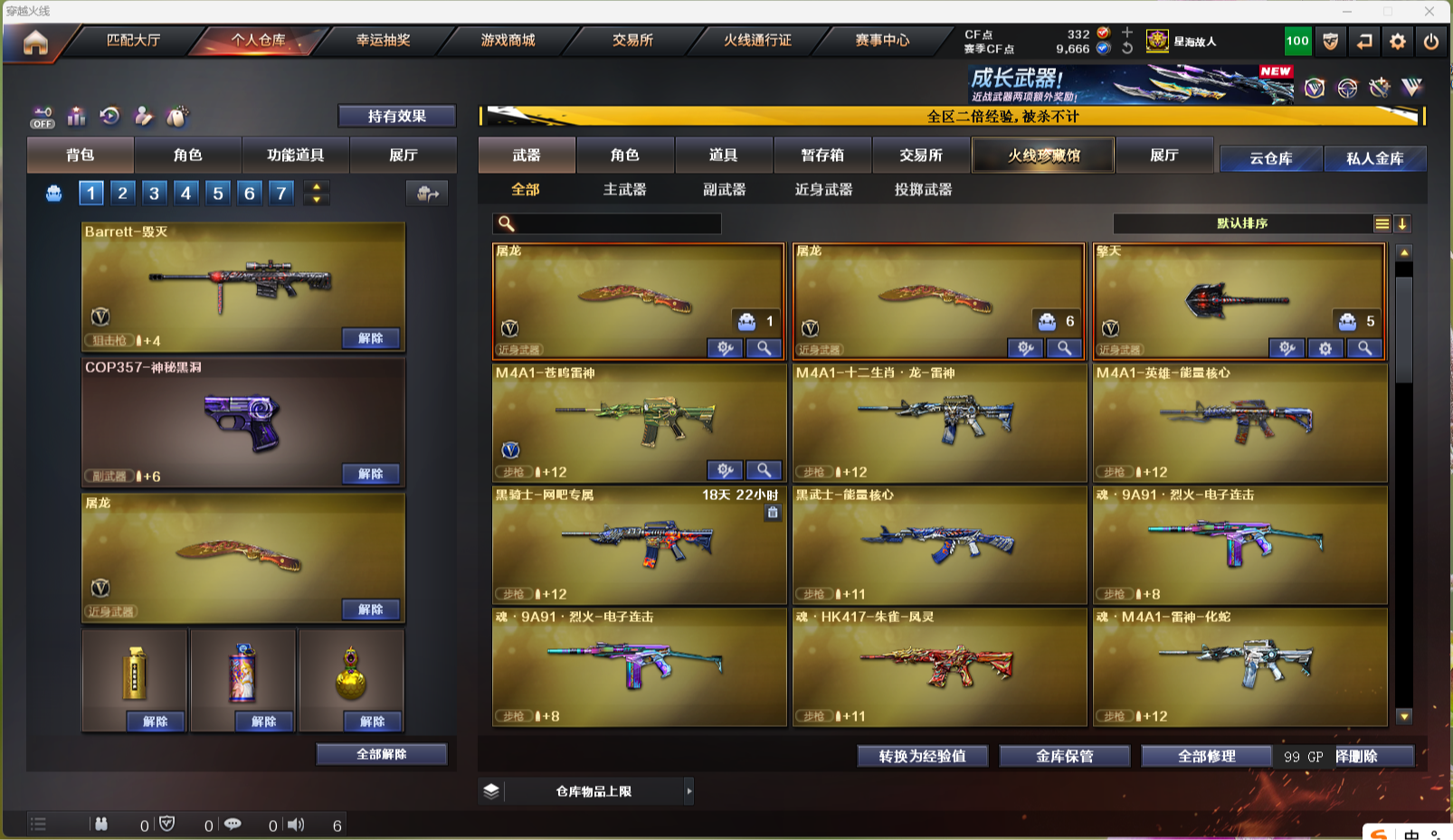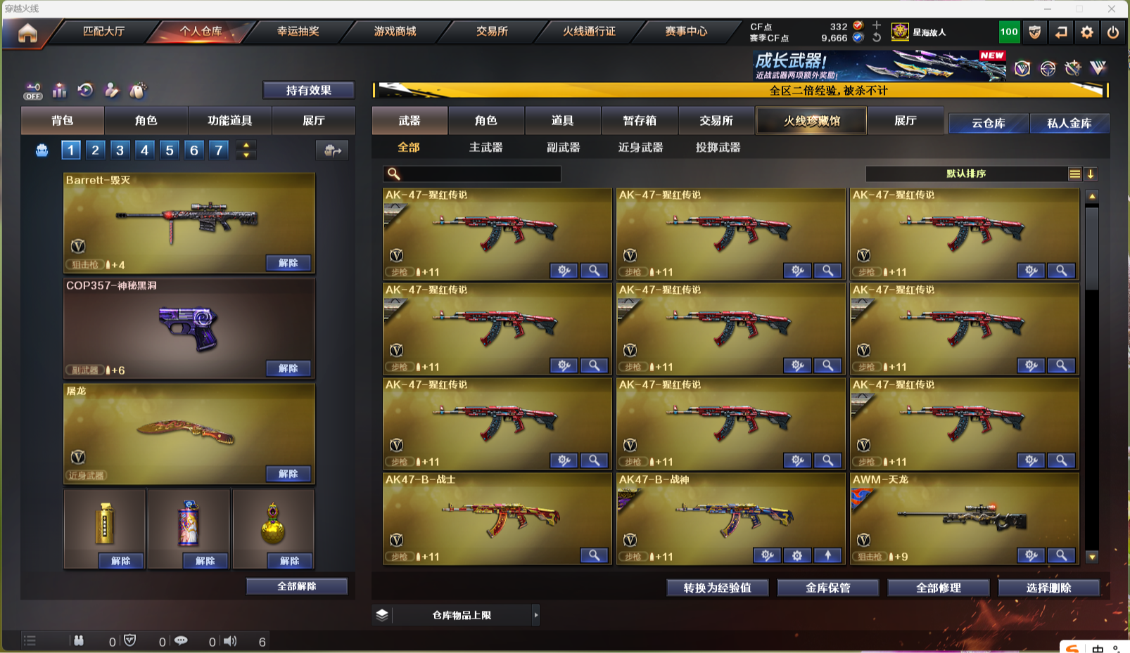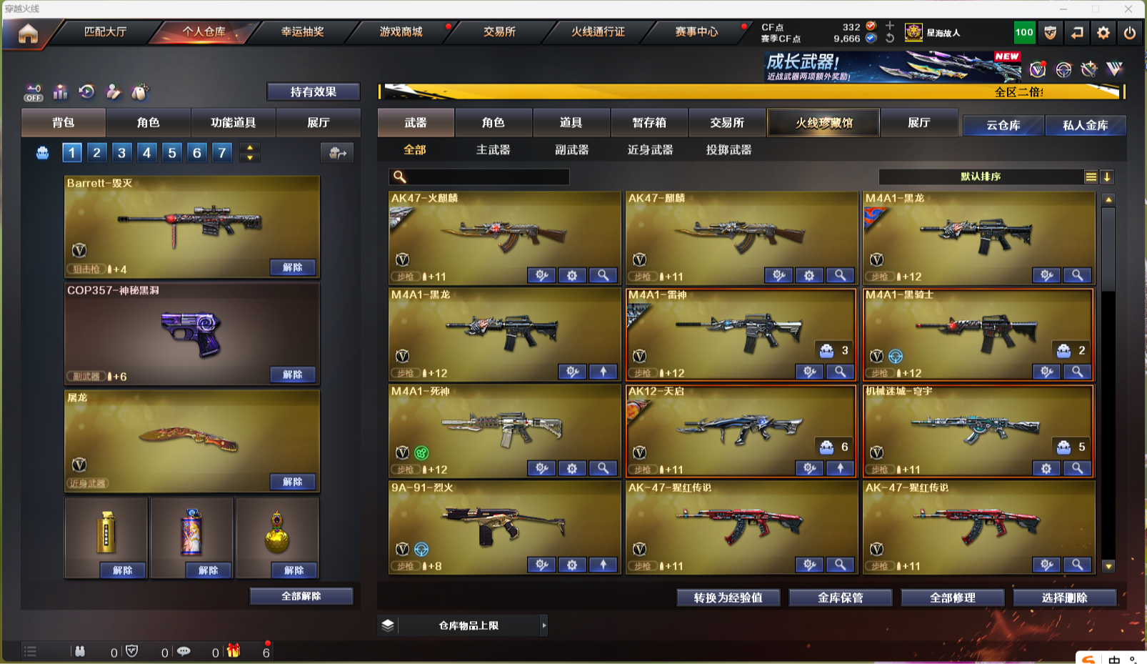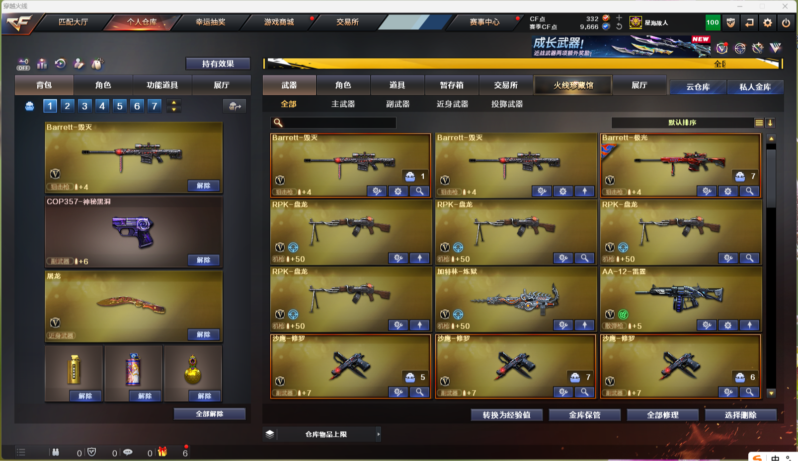 【北部战区 辽宁一区 39v】 ak47-火麒麟 m4a1-黑龙 m4a1-雷神 m4a1-黑骑士 m4a1-死神 ak12-天启 机械迷城-穹宇 9a-91-烈火 ak-47-猩红传说 ak47-b-战士 ak47-b-战神 awm-天龙 barrett-毁灭 barrett-极光 rpk-盘龙 加特林-炼狱 aa-12-雷霆 沙鹰-修罗 屠龙 擎天