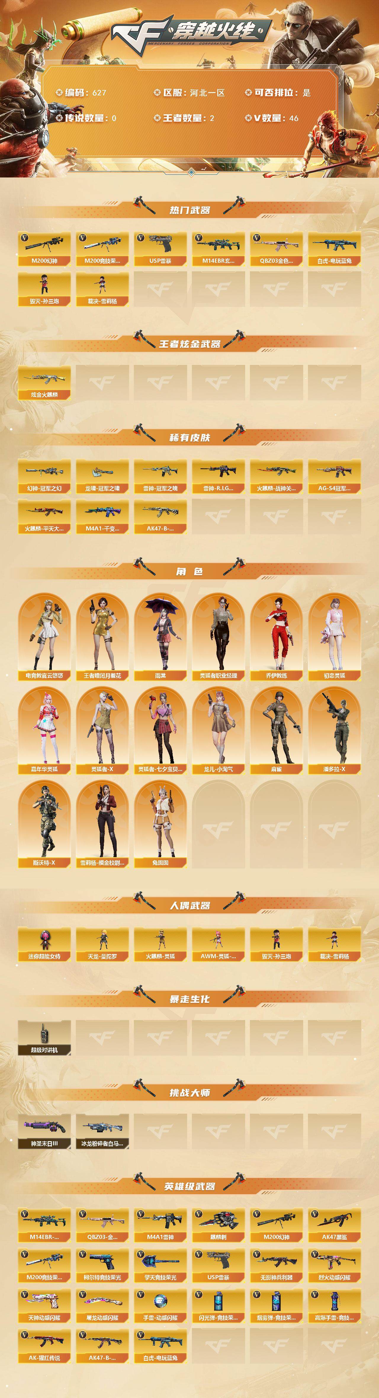 [14278096]河北一区-46v-2王者-1炫金 【热门武器】:q03-金色蔷薇,m14ebr-玄武,m200-幻神,m200-竞技荣光,白虎-电玩蓝兔,毁灭-孙三炮,裁决-雪莉杨,usp-雷暴 【王者炫金武器】:炫金火麒麟 【皮肤】:幻神-冠军之幻,雷神-冠军之魄,雷神-r.lgd-cfpls18冠军,火麒麟-战神关羽,火麒麟-平天大圣,m4a1-千变-孔明皮肤,黑骑士-ag-s4冠军典藏,ak47-b-常胜将军-刘备,龙啸-冠军之啸 【角色】:雨棠,电竞教官-云悠悠,王者-瞳-闭月羞花,乔伊教练,初恋灵狐,嘉年华灵狐,灵狐者-x,灵狐者-七夕宝贝,灵狐者-职业经理,龙儿-小淘气,麻雀,潘多拉-x,斯沃特-x,兔囡囡,雪莉杨-摸金校尉 【人偶武器】:毁灭-孙三炮,裁决-雪莉杨,天龙-曼陀罗,火麒麟-灵狐,awm-灵狐-15周年嘉年华,迷你超能女侍 【暴走生化】:超级对讲机 【挑战大师】:冰龙粉碎者-白马银呛2,神圣爆裂者-末日iii 【英雄级武器】:m4a1-雷神,ak47-黑鲨,m14ebr-玄武,无影-神兵利器,q03-金色蔷薇,烈火-动感闪耀,ak-47-猩红传说2,ak47-b-战神,白虎-电玩蓝兔,m200-幻神,m200-竞技荣光,usp-雷暴,柯尔特-竞技荣光,天神-动感闪耀,麒麟刺,擎天-竞技荣光2,屠龙-动感闪耀,高爆手蕾-竞技荣光7,手蕾-动感闪耀,闪光丹-竞技荣光7,盐雾蛋-竞技荣光8 【道具】:全能呛王背包,背包-洛丽塔,虎牙炫彩背包,迷你冰龙背包,绿色巨人,灵魂忍者,迷雾幽灵,夺命之镰,防化服2,金色流光-呛王排位2,星辰流光-呛王排位,呛王排位28赛季金色流光,呛王排位29赛季金色流光,电玩兔兔表情,动感闪耀表情,ep战队名片,防弹头盔4,防弹衣5,c4工具钳4,手蕾包4 【特殊呛械】: