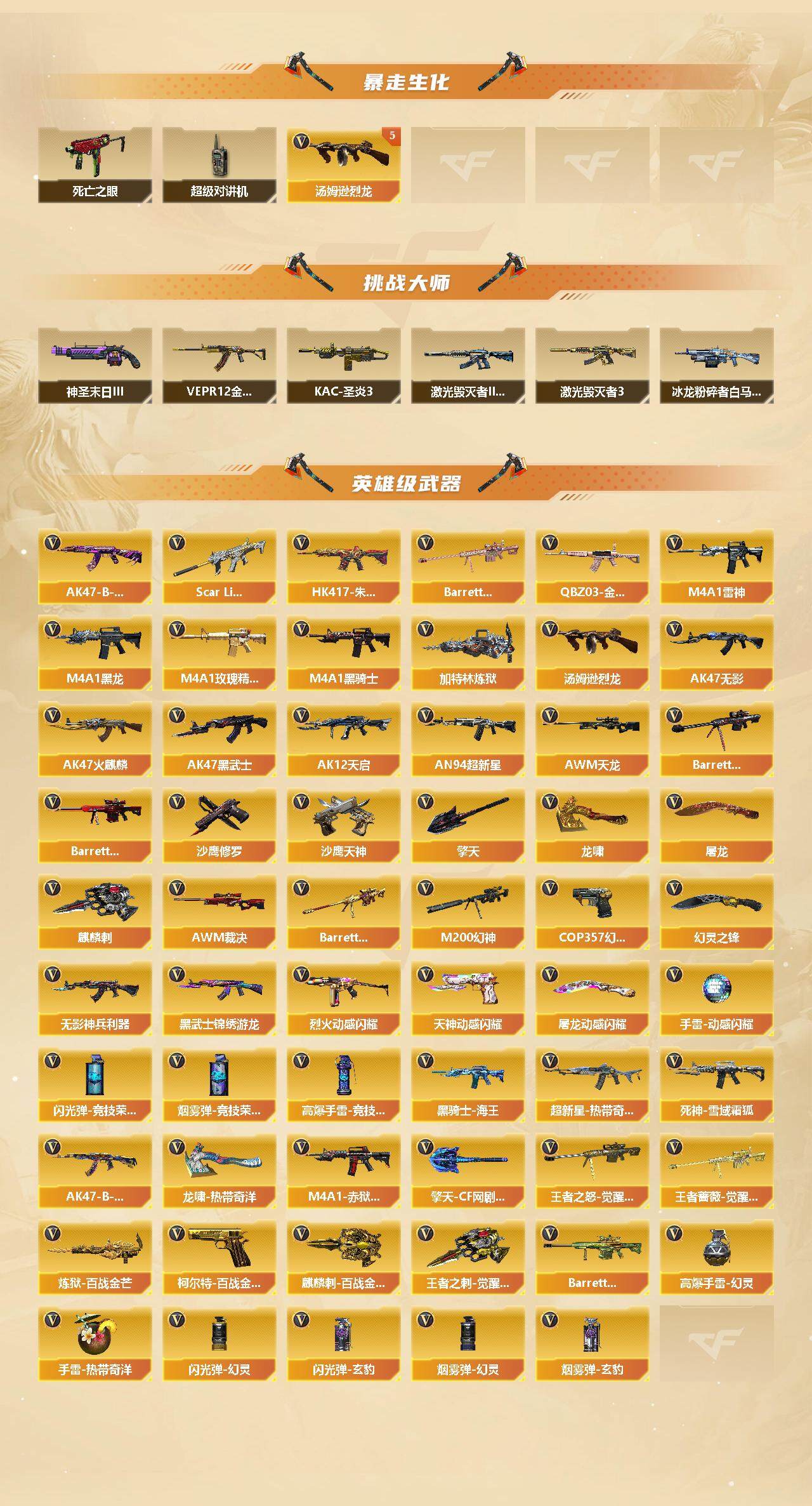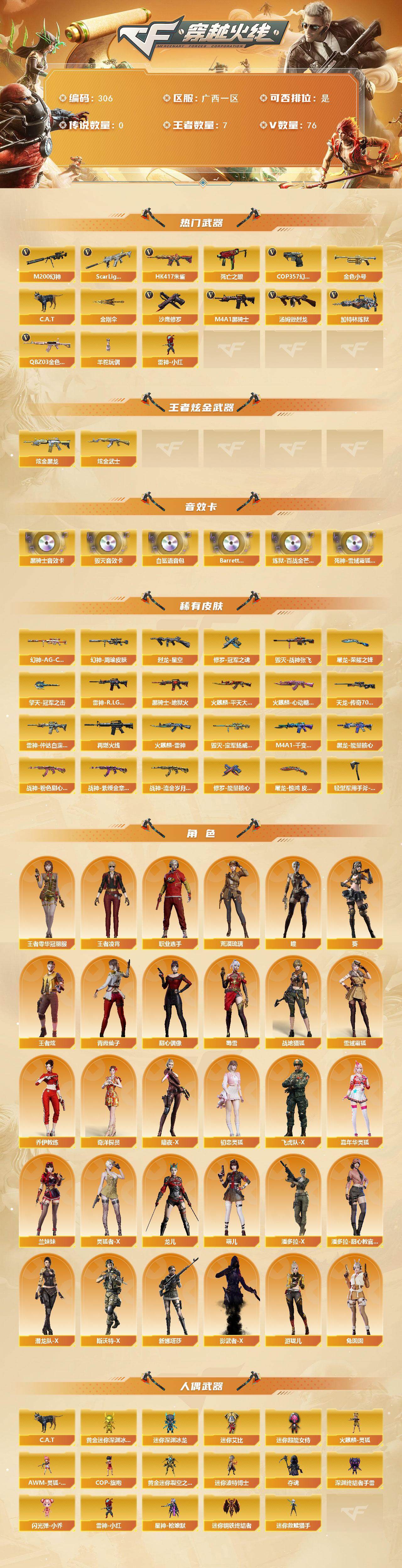 [14278255]广西一区-76v-7王者-2炫金 【热门武器】:q03-金色蔷薇,scar light-白虎,hk417-朱雀,m200-幻神,死亡之眼,金色小号,c.a.t,m4a1-黑骑士,汤姆逊-烈龙5,加特林-炼狱2,羊驼玩偶,雷神-小红,cop 357-幻灵,沙鹰-修罗2,金刚伞 【王者炫金武器】:炫金黑龙,炫金武士 【音效卡】:m4a1-黑骑士音效卡,barrett-毁灭音效卡,白鲨语音包,barrett-碧霄极光音效卡,炼狱-百战金芒-庆典舞曲音效卡,死神-雪域霜狐-怀旧音效卡 【皮肤】:幻神-周瑜皮肤,幻神-ag-cfpl s24冠军 皮肤,烈龙-星空,雷神-r.lgd-cfpls18冠军,雷神-仲达白露 皮肤,m4a1-再燃火线,火麒麟-雷神,火麒麟-平天大圣,火麒麟-心动糖果,毁灭-战神张飞,毁灭-定军扬威 皮肤,m4a1-千变-孔明皮肤,黑龙-能量核心,黑骑士-地狱火,战神-粉色甜心皮肤,战神-紫绶金章皮肤2,战神-流金岁月皮肤2,awm-天龙-传奇70kg,修罗-能量核心,修罗-冠军之魂,屠龙-荣耀之锋,屠龙-惊鸿 皮肤,轻型军用手斧-再燃火线,擎天-冠军之击 【角色】:葵,瞳,荒漠琉璃,战地猎狐,王者零-华冠丽服,王者炫,王者凌霄,雪域霜狐,奇洋探员,乔伊教练,暗夜-x,初恋灵狐,飞虎队-x,嘉年华灵狐,兰妹妹,灵狐者-x,龙儿,萌儿,潘多拉-x,潘多拉-甜心教官,潜龙队-x,青霞仙子,斯沃特-x,甜心偶像,蜀雪,兔囡囡,新娜塔莎,影武者-x,游珑儿,职业选手 【人偶武器】:雷神-小红,火麒麟-灵狐,星神-呛娘默,迷你钢铁终结者,迷你救赎猎手,awm-灵狐-15周年嘉年华2,cop-旗袍3,c.a.t,黄金迷你深渊冰龙,迷你深渊冰龙,黄金迷你裂空之翼,迷你波特博士,夺魂,深渊终结者手蕾,闪光丹-小乔,迷你艾比,迷你超能女侍 【暴走生化】:死亡之眼,超级对讲机 【挑战大师】:冰龙粉碎者-白马银呛2,激光毁灭者iii-白马银呛,vepr-12-金魔,激光毁灭者iii,kac-圣炎切割者iii,神圣爆裂者-末日iii 【英雄级武器】:ak47-火麒麟3,m4a1-黑龙2,m4a1-雷神4,m4a1-黑骑士,ak47-无影,ak47-黑武士,ak12-天启,an94-超新星,hk417-朱雀,scar light-白虎,无影-神兵利器,