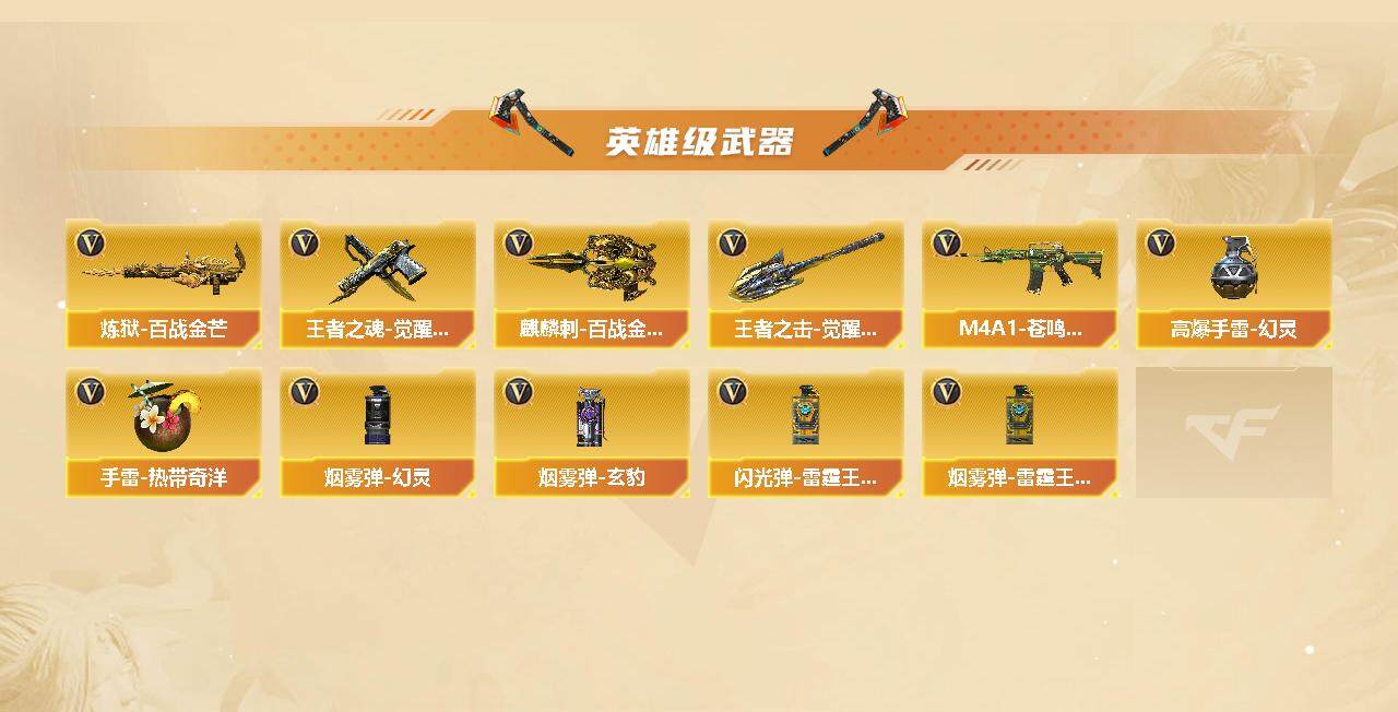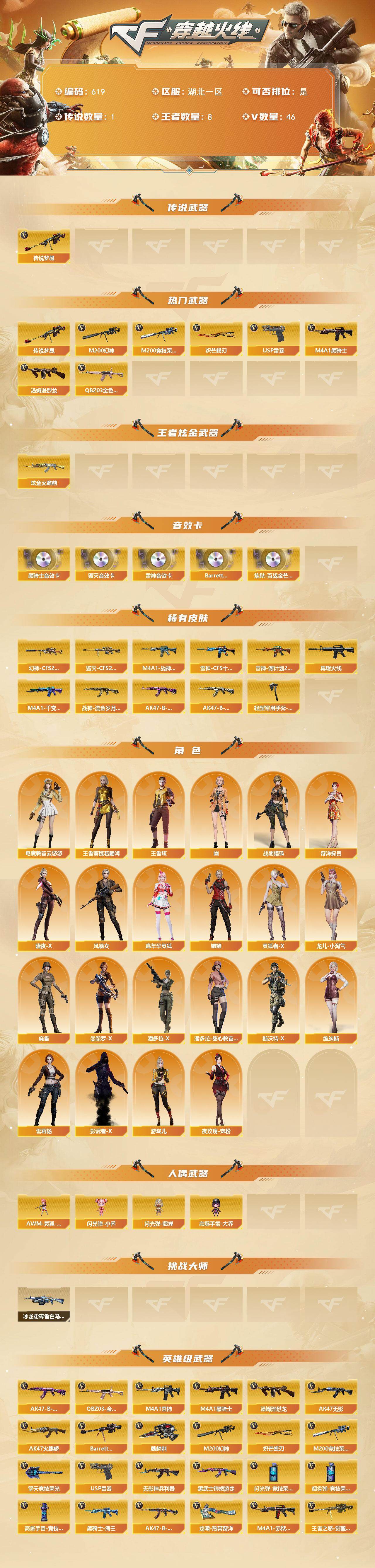 [14278990]湖北一区-46v-8王者-1炫金 【传说武器】:传说梦魇 【热门武器】:传说梦魇,q03-金色蔷薇,m200-幻神,m200-竞技荣光,m4a1-黑骑士,汤姆逊-烈龙,usp-雷暴,炽芒蝶刃 【王者炫金武器】:炫金火麒麟 【音效卡】:m4a1-雷神音效卡,m4a1-黑骑士音效卡,barrett-毁灭音效卡,barrett-碧霄极光音效卡,炼狱-百战金芒-庆典舞曲音效卡 【皮肤】:幻神-cfs2022,m4a1-战神赵云,雷神-cfs十周年纪念版 皮肤,雷神-源计划2.0专属 皮肤,m4a1-再燃火线,毁灭-cfs2020,m4a1-千变-孔明皮肤,战神-流金岁月皮肤,ak47-b-常胜将军-曹操,ak47-b-常胜将军-刘备,轻型军用手斧-再燃火线 【角色】:电竞教官-云悠悠,战地猎狐,王者葵-惊若翩鸿,王者炫,奇洋探员,暗夜-x,风暴女,嘉年华灵狐,娟娟,灵狐者-x,龙儿-小淘气,麻雀,曼陀罗-x,潘多拉-x,潘多拉-甜心教官,斯沃特-x,维纳斯,雪莉杨,夜玫瑰-宠粉,影武者-x,幽,游珑儿 【人偶武器】:awm-灵狐-15周年嘉年华,闪光丹-小乔,闪光丹-貂蝉,高爆手蕾-大乔 【挑战大师】:冰龙粉碎者-白马银呛 【英雄级武器】:ak47-火麒麟,m4a1-雷神2,m4a1-黑骑士,ak47-无影,无影-神兵利器,黑武士-锦绣游龙,q03-金色蔷薇,ak47-b-战神,黑骑士-海王,ak47-b-常胜将军,barrett-毁灭,m200-幻神,m200-竞技荣光,王者之怒-觉醒版,炼狱-百战金芒,汤姆逊-烈龙,usp-雷暴,王者之魂-觉醒版,麒麟刺,擎天-竞技荣光,炽芒蝶刃,龙啸-热带奇洋,麒麟刺-百战金芒,王者之击-觉醒版,高爆手蕾-幻灵,高爆手蕾-竞技荣光5,手蕾-热带奇洋,闪光丹-竞技荣光3,闪光丹-雷霆王者-觉醒版,盐雾蛋-幻灵,盐雾蛋-竞技荣光4,盐雾蛋-玄豹2,盐雾蛋-雷霆王者-觉醒版,m4a1-赤狱骑士,m4a1-苍鸣雷神 【道具】:bs战队炫彩背包,亚洲杯纪念炫彩背包,奇洋探员-海龟背包,百战金芒炫彩背包,超级背包,女皇终结者-魔龙之吻,救世主-黑桃战神,绿色巨人,灵魂忍者3,变异宝贝,迷雾幽灵,夺命之镰,防化服3,金色流光-呛王排位2,星辰流光-呛王排位,巅峰赛先锋-金色流光,呛王排位28赛季金色流光,呛王排位29赛季金