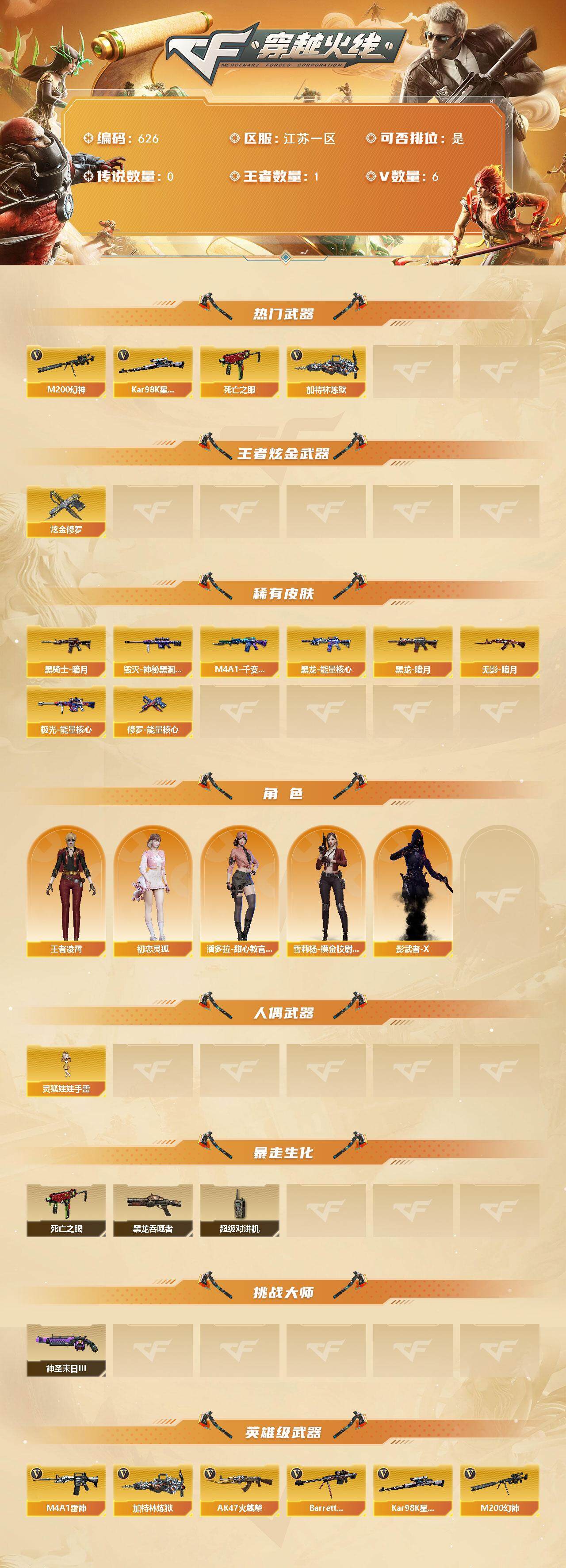 [14280068]江苏一区-6v-1王者-1炫金 【热门武器】:m200-幻神,死亡之眼2,kar98k-星神,加特林-炼狱 【王者炫金武器】:炫金修罗 【皮肤】:毁灭-神秘黑洞皮肤,m4a1-千变-孔明皮肤,黑龙-能量核心,黑龙-暗月,黑骑士-暗月,无影-暗月,极光-能量核心,修罗-能量核心 【角色】:王者凌霄,初恋灵狐,潘多拉-甜心教官,雪莉杨-摸金校尉,影武者-x 【人偶武器】:灵狐娃娃手蕾 【暴走生化】:黑龙吞噬者,死亡之眼2,超级对讲机 【挑战大师】:神圣爆裂者-末日iii 【英雄级武器】:ak47-火麒麟,m4a1-雷神,barrett-毁灭,m200-幻神,kar98k-星神,加特林-炼狱 【道具】:we炫彩背包,战舰背包,灵魂忍者,生化弹匣,夺命之镰,防化服,呛王排位28赛季金色流光,防弹头盔2,防弹衣2,c4工具钳2,手蕾包2 【特殊呛械】:1炼狱