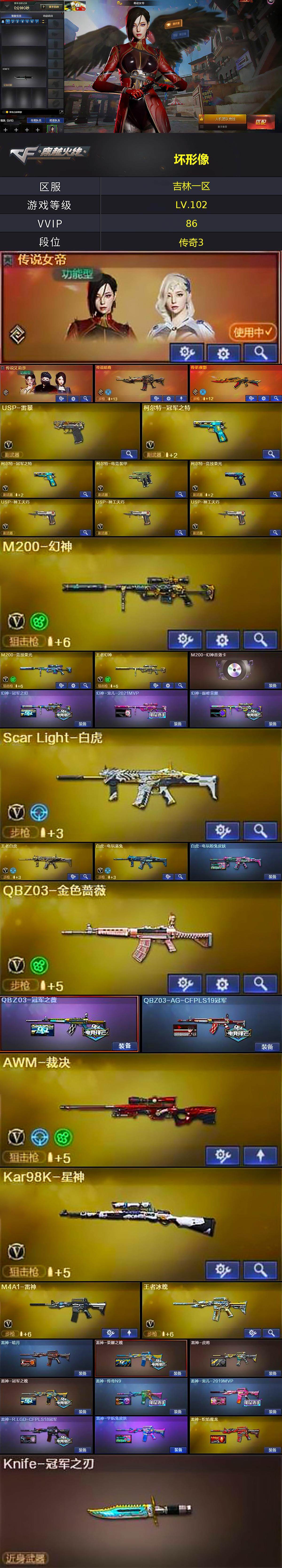 吉林一区-82v-14王者-2炫金 【传说武器】:传说暗裔,传说夜影 【传说角色】:传说女帝,传说艾莉莎 【热门武器】:传说暗裔,传说夜影,q03-金色蔷薇,scar light-白虎,m200-幻神,m200-竞技荣光,白虎-电玩蓝兔,柯尔特-冠军之特2,kar98k-星神,m4a1-黑骑士,加特林-炼狱,火麒麟-绝迹,cop-白鲨,usp-雷暴,沙鹰-修罗,knife-冠军之刃2,荣耀世冠-龙啸 【王者炫金武器】:王者雷怒,炫金黑龙,炫金天龙 【音效卡】:m200-幻神音效卡,m4a1-黑骑士音效卡,barrett-毁灭音效卡 【皮肤】:幻神-冠军之幻,幻神-宠儿-2021mvp,幻神-巅峰荣耀,白虎-电玩粉兔皮肤,q03-冠军之薇,q03-ag-cfpls19冠军,雷神-暗月,雷神-荣耀之魄,雷神-虎将,雷神-冠军之魄,雷神-传奇n9,雷神-宠儿-2019mvp,雷神-r.lgd-cfpls18冠军,雷神-宇航兔皮肤,雷神-炽焰魔龙,火麒麟-ag战队皮肤,火麒麟-冠军之心,火麒麟-华夏之心2,火麒麟-平天大圣,火麒麟-百城,火麒麟-大唐荣光,毁灭-sv-cfpls16冠军,毁灭-黑大圣皮肤,m4a1-千变-孔明皮肤,m4a1-黑龙-361,黑骑士-冠军之势2,ak47-黑武士-361,烈火-动感闪耀 皮肤,战神-粉色甜心皮肤,战神-流金岁月皮肤,ak47-b-常胜将军-曹操,ak47-b-常胜将军-孙权2,炼狱-星空,炼狱-玩具呛皮肤,修罗-能量核心,修罗-冠军之魂,屠龙-荣耀之锋2,屠龙-荣耀世冠ag,麒麟刺-甜蜜糖果 皮肤 【角色】:电竞教官-云悠悠,兰-巾帼英雄,王者樱-热浪之夏,王者玲珑,乔伊教练,暗夜-x,初恋灵狐,芳心审判者,风暴女,嘉年华灵狐,娟娟,灵狐-花神,灵狐者-x,灵狐者-七夕宝贝,龙儿-小淘气,麻雀,曼陀罗-x,曼陀罗-礼服,女战神,女主播,潘多拉-x,潘多拉-甜心教官,斯沃特-x,铁骑荣耀,兔囡囡,维纳斯,雪莉杨-摸金校尉 【人偶武器】:火麒麟-绝迹,cop-白鲨,火麒麟-灵狐,awm-灵狐-15周年嘉年华,闪光丹-貂蝉,高爆手蕾-大乔,m4a1-斯沃特,迷你超能女侍 【暴走生化】:超级对讲机 【英雄级武器】:m4a1-千变,ak47-火麒麟,m4a1-黑龙,m4a1-雷神,m4a1-黑骑士,ak47-无影,ak47-黑武士,an94-超新星,m4a1-武圣,ak47-机械迷城,scar light-白虎,m4a1-神工天巧,无影-神兵利器,黑武士-锦绣游龙,q03-金色蔷薇,烈火-动感闪耀,王者之势-觉醒版,王者之戮-觉醒版,王者冰魄-觉醒版,黑骑士-海王,ak47-b-常胜将军,王者白虎-觉醒版,白虎-电玩蓝兔,awm-天龙,barrett-毁灭,awm-裁决,m200-幻神,kar98k-星神,m200-竞技荣光,王者之怒-觉醒版,王者幻神-觉醒版,加特林-炼狱,沙鹰-修罗,沙鹰-天神,usp-雷暴,柯尔特-冠军之特2,柯尔特-电竞装甲,柯尔特-竞技荣光,usp-神工天巧3,glock18-武圣,天神-动感闪耀,屠龙,龙啸,擎天,麒麟刺,幻灵之锋,擎天-竞技荣光,唐刀-神工天巧,屠龙-动感闪耀,荣耀世冠-龙啸,雷霆王者之锋-觉醒版,高爆手蕾-幻灵,高爆手蕾-竞技荣光,高爆手蕾-神工天巧7,手蕾-动感闪耀,闪光丹-幻灵,闪光丹-竞技荣光,闪光丹-神工天巧7,闪光丹-雷霆王者-觉醒版,盐雾蛋-竞技荣光2,盐雾蛋-神工天巧7,盐雾蛋-雷霆王者-觉醒版,m4a1-赤狱骑士 【道具】:ag战队炫彩背包,bs战队炫彩背包,ep战队炫彩背包,q9战队炫彩背包,全能呛王背包,背包-洛丽塔,背包-葫芦兄弟,虎牙炫彩背包,超级背包,哔哩哔哩名片,绿色巨人,灵魂忍者,迷雾幽灵,夺命之镰2,防化服3,金色流光-呛王排位2,星辰流光-呛王排位,呛王排位28赛季金色流光,电玩兔兔表情,动感闪耀表情,ep战队收纳包,ep战队击杀图标,c4-红龙,防弹头盔3,防弹衣3,c4工具钳3,手蕾包3 【特殊呛械】:1白虎,1黑骑士,1炼狱