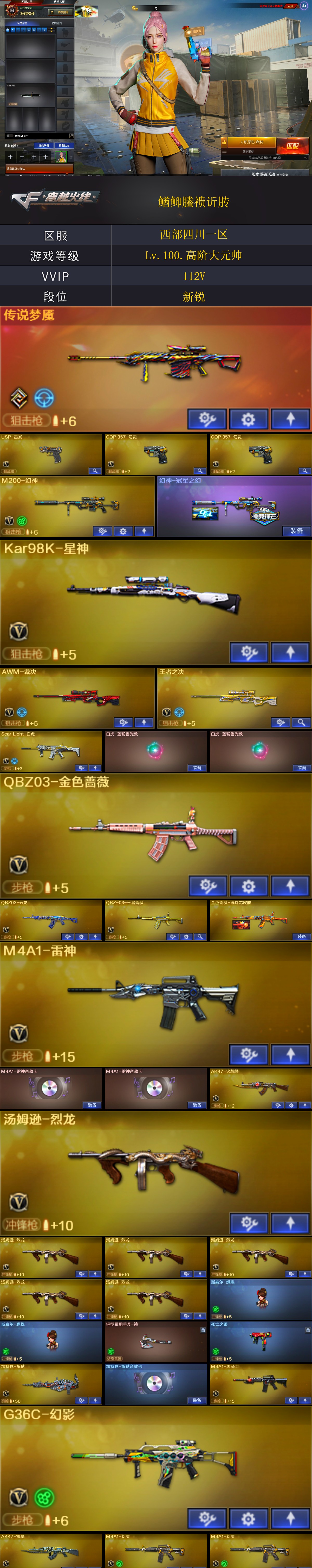 【★找回包赔★西部365】:西部四川一区-112v-可二次实名-【lv.100.高阶大元帅】-【段位:新锐】传说梦魇/m200-幻神/幻神-冠军之幻/kar98k-星神/awm-裁决2/王者之决-觉醒版/scarlight-白虎/q03-金色蔷薇/q03-云龙/q-03-王者蔷薇-觉醒版/金色蔷薇-纸灯龙皮肤/usp-雷暴/cop357-幻灵2/g36c-幻影/汤姆逊-烈龙6/斯泰尔-蝴蝶2/加特林-炼狱/m4a1-黑骑士/加特林-炼狱音效卡/barrett-毁灭音效卡/鹰/春/高爆手蕾-雷暴8/闪光丹-雷暴7/盐雾蛋-雷暴7(截图展示段位不代表实际段位,如赛季更新等不可抗拒因素发生变化,其余道具看截图或咨询客服)