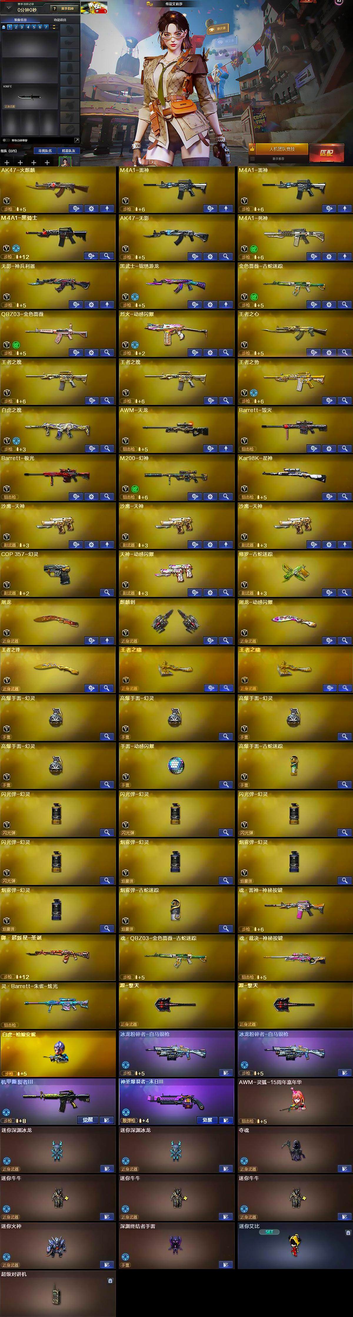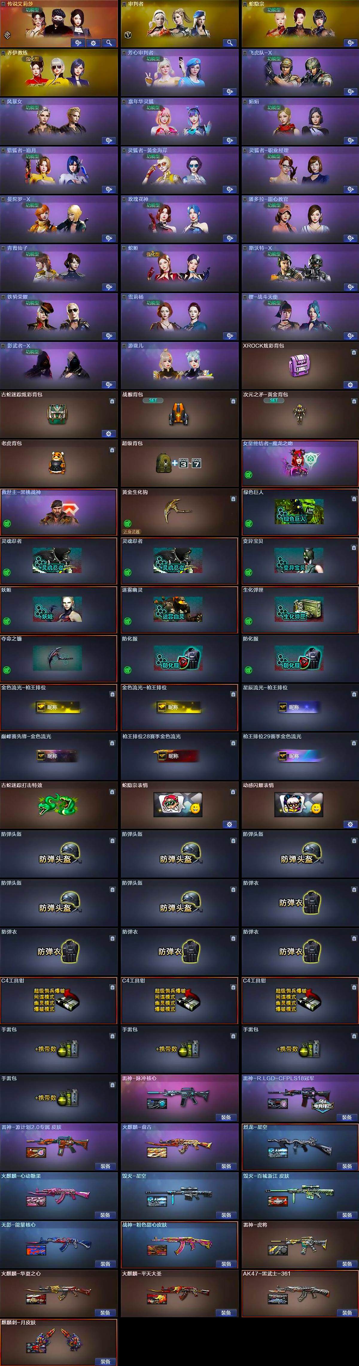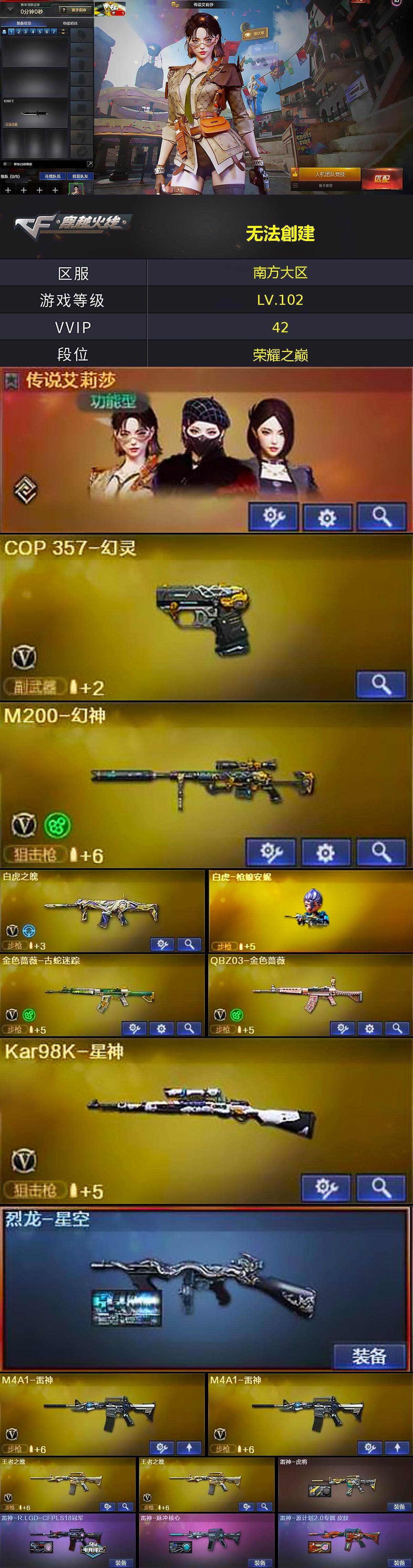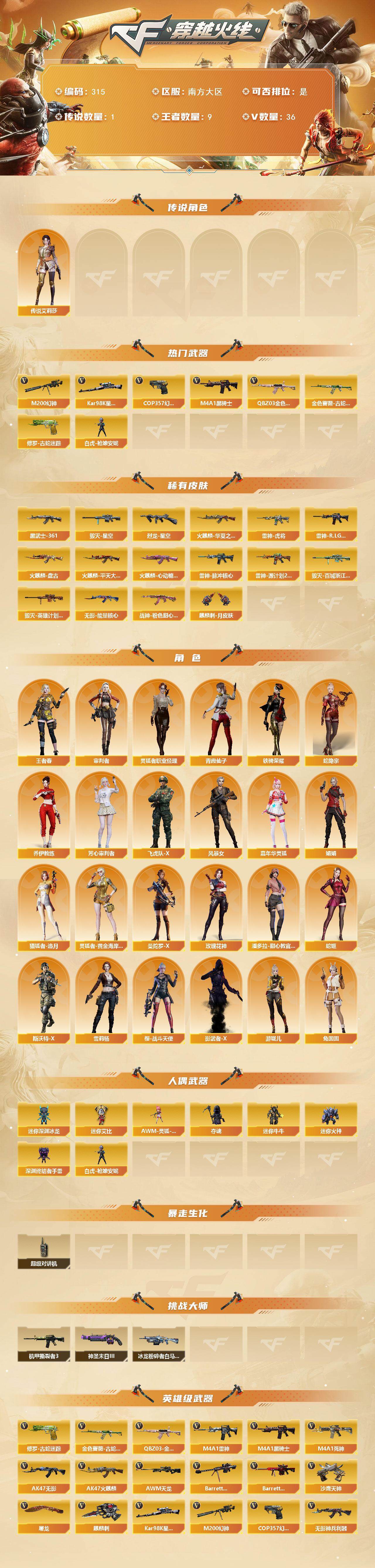 南方大区-36v-9王者-0炫金 【传说角色】:传说艾莉莎 【热门武器】:q03-金色蔷薇,m200-幻神,金色蔷薇-古蛇迷踪,修罗-古蛇迷踪,kar98k-星神,m4a1-黑骑士,白虎-呛娘安妮,cop 357-幻灵 【皮肤】:烈龙-星空,雷神-虎将,雷神-r.lgd-cfpls18冠军,雷神-脉冲核心,雷神-源计划2.0专属 皮肤,火麒麟-华夏之心,火麒麟-平天大圣,火麒麟-盘古,火麒麟-心动糖果,毁灭-星空,毁灭-百城浙江 皮肤,毁灭-英雄计划 皮肤,无影-能量核心,ak47-黑武士-361,战神-粉色甜心皮肤,麒麟刺-月皮肤 【角色】:审判者,王者春,蛇隐宗,乔伊教练,芳心审判者,飞虎队-x,风暴女,嘉年华灵狐,娟娟,猎狐者-追月,灵狐者-黄金海岸,灵狐者-职业经理,曼陀罗-x,玫瑰花神,潘多拉-甜心教官,青霞仙子,蛇姬,斯沃特-x,铁骑荣耀,兔囡囡,雪莉杨,樱-战斗天使,影武者-x,游珑儿 【人偶武器】:白虎-呛娘安妮,awm-灵狐-15周年嘉年华,迷你深渊冰龙2,夺魂,迷你牛牛3,迷你火种,深渊终结者手蕾,迷你艾比 【暴走生化】:超级对讲机 【挑战大师】:冰龙粉碎者-白马银呛2,机甲撕裂者iii,神圣爆裂者-末日iii 【英雄级武器】:ak47-火麒麟,m4a1-雷神2,m4a1-黑骑士,ak47-无影,m4a1-死神,无影-神兵利器,黑武士-锦绣游龙,金色蔷薇-古蛇迷踪,q03-金色蔷薇,烈火-动感闪耀,王者之心-觉醒版,王者之魄-觉醒版2,王者之势-觉醒版,白虎之魄-觉醒版,awm-天龙,barrett-毁灭,barrett-极光,m200-幻神,kar98k-星神,沙鹰-天神3,cop 357-幻灵,天神-动感闪耀,修罗-古蛇迷踪,屠龙,麒麟刺,屠龙-动感闪耀,王者之锋-觉醒版,王者之啸-觉醒版2,高爆手蕾-幻灵4,手蕾-动感闪耀,高爆手蕾-古蛇迷踪,闪光丹-幻灵4,盐雾蛋-幻灵3,盐雾蛋-古蛇迷踪 【道具】:xrock炫彩背包,古蛇迷踪炫彩背包,战舰背包,次元之矛-黄金背包,老虎背包,超级背包,女皇终结者-魔龙之吻,救世主-黑桃战神,黄金生化钩,绿色巨人,灵魂忍者2,变异宝贝,妖姬,迷雾幽灵,生化弹匣,夺命之镰,防化服2,金色流光-呛王排位2,星辰流光-呛王排位,巅峰赛先锋-金色流光,呛王排位28赛季金色流光,呛王排位29赛季金色流光,古蛇迷踪打击特效,蛇隐宗表情,动感闪耀表情,防弹头盔5,防弹衣4,c4工具钳3,手蕾包4 【特殊呛械】:1黑骑士