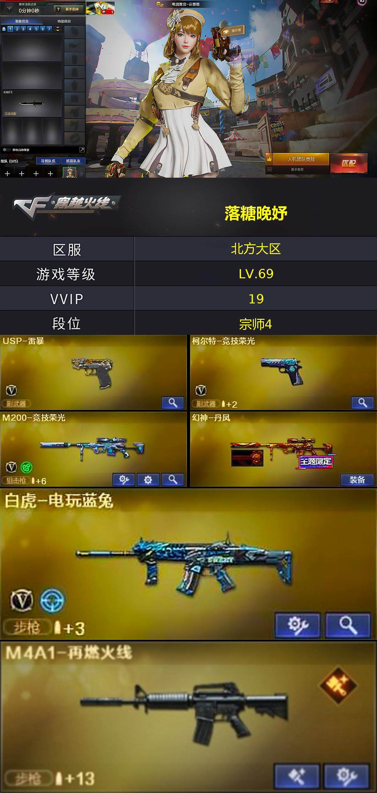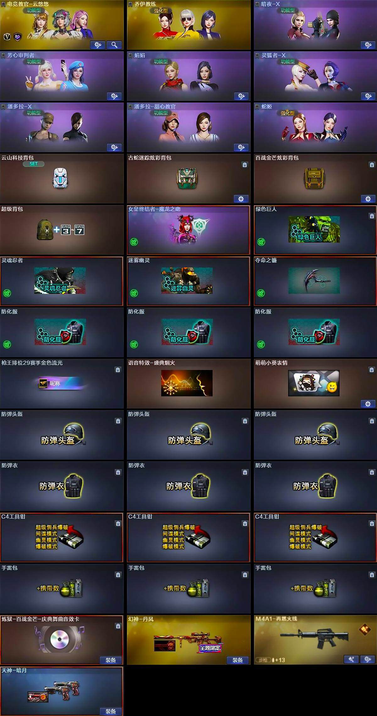 [14306320]北方大区-18v-2王者-0炫金 【热门武器】:m200-竞技荣光,白虎-电玩蓝兔,c.a.t,usp-雷暴 【王者炫金武器】:王者玉锋 【音效卡】:炼狱-百战金芒-庆典舞曲音效卡 【皮肤】:幻神-丹凤,m4a1-再燃火线,天神-暗月,轻型军用手斧-再燃火线 【角色】:电竞教官-云悠悠,乔伊教练,暗夜-x,芳心审判者,娟娟,卡塔琳娜,灵狐者-x,潘多拉-x,潘多拉-甜心教官,蛇姬 【人偶武器】:m4a1-雷神-精英刀锋,c.a.t,迷你艾比 【挑战大师】:冰龙粉碎者-白马银呛,试炼破坏者iii 【英雄级武器】:王者之圣-觉醒版,白虎-电玩蓝兔,barrett-极光,m200-竞技荣光,炼狱-百战金芒,usp-雷暴,柯尔特-竞技荣光,擎天-竞技荣光,麒麟刺-百战金芒,高爆手蕾-竞技荣光,闪光丹-竞技荣光2,盐雾蛋-竞技荣光2 【道具】:云山科技背包,古蛇迷踪炫彩背包,百战金芒炫彩背包,超级背包,女皇终结者-魔龙之吻,绿色巨人,灵魂忍者,迷雾幽灵,夺命之镰,防化服3,呛王排位29赛季金色流光,语音特效-盛典烟火,萌萌小葵表情,防弹头盔3,防弹衣3,c4工具钳3,手蕾包3 【特殊呛械】: