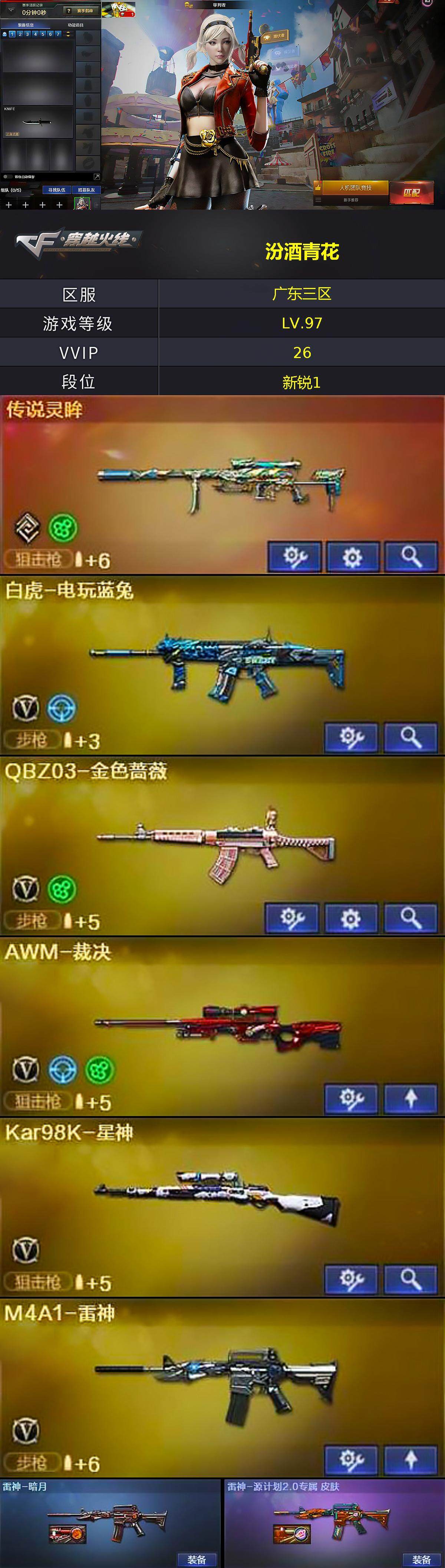 广东三区-25v-0王者-0炫金 【传说武器】:传说灵眸 【热门武器】:传说灵眸,q03-金色蔷薇,m14ebr-玄武,白虎-电玩蓝兔,kar98k-星神,m4a1-黑骑士 【音效卡】:m4a1-黑骑士音效卡,barrett-毁灭音效卡 【皮肤】:雷神-暗月,雷神-源计划2.0专属 皮肤,火麒麟-平天大圣,毁灭耀金皮肤,黑骑士-电玩青兔皮肤,战神-紫绶金章皮肤2,ak47-b-常胜将军-