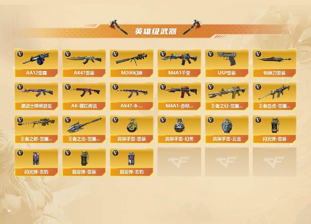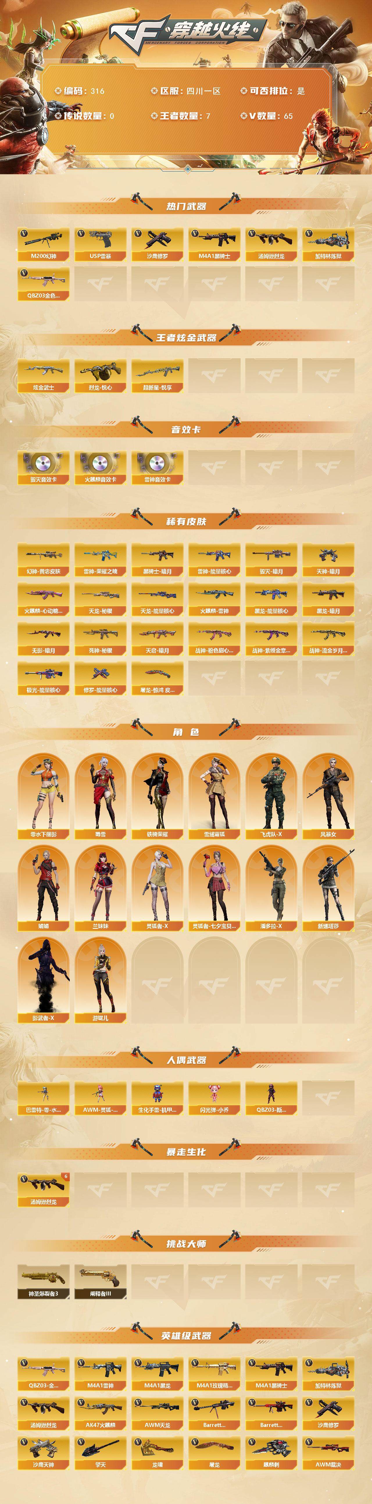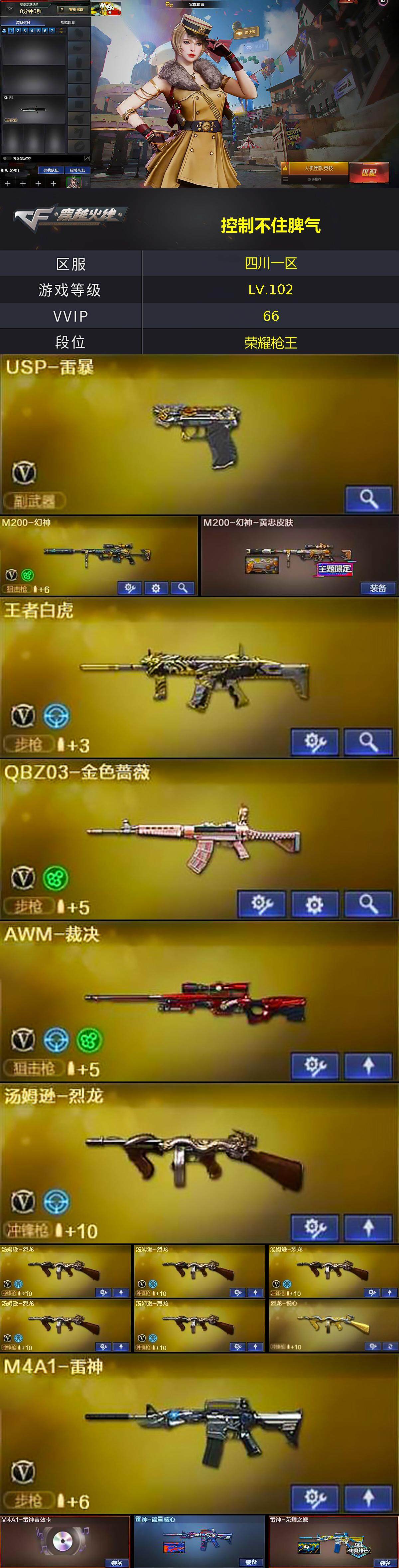 四川一区-65v-7王者-1炫金 【热门武器】:q03-金色蔷薇,m200-幻神,m4a1-黑骑士,汤姆逊-烈龙6,加特林-炼狱,usp-雷暴,沙鹰-修罗2 【王者炫金武器】:超新星-悦享,烈龙-悦心,炫金武士 【音效卡】:ak47-火麒麟音效卡,m4a1-雷神音效卡,barrett-毁灭音效卡 【皮肤】:m200-幻神-黄忠皮肤,雷神-能量核心,雷神-荣耀之魄,火麒麟-雷神,火麒麟-