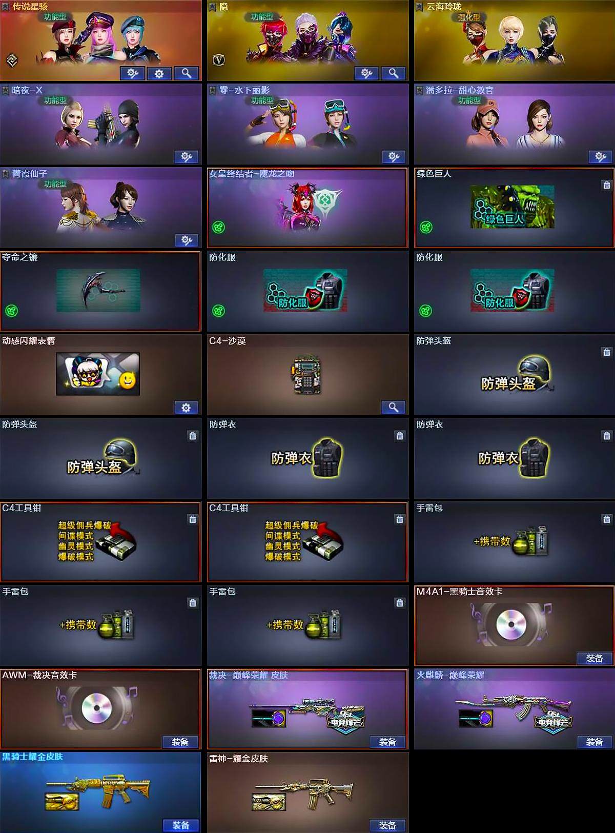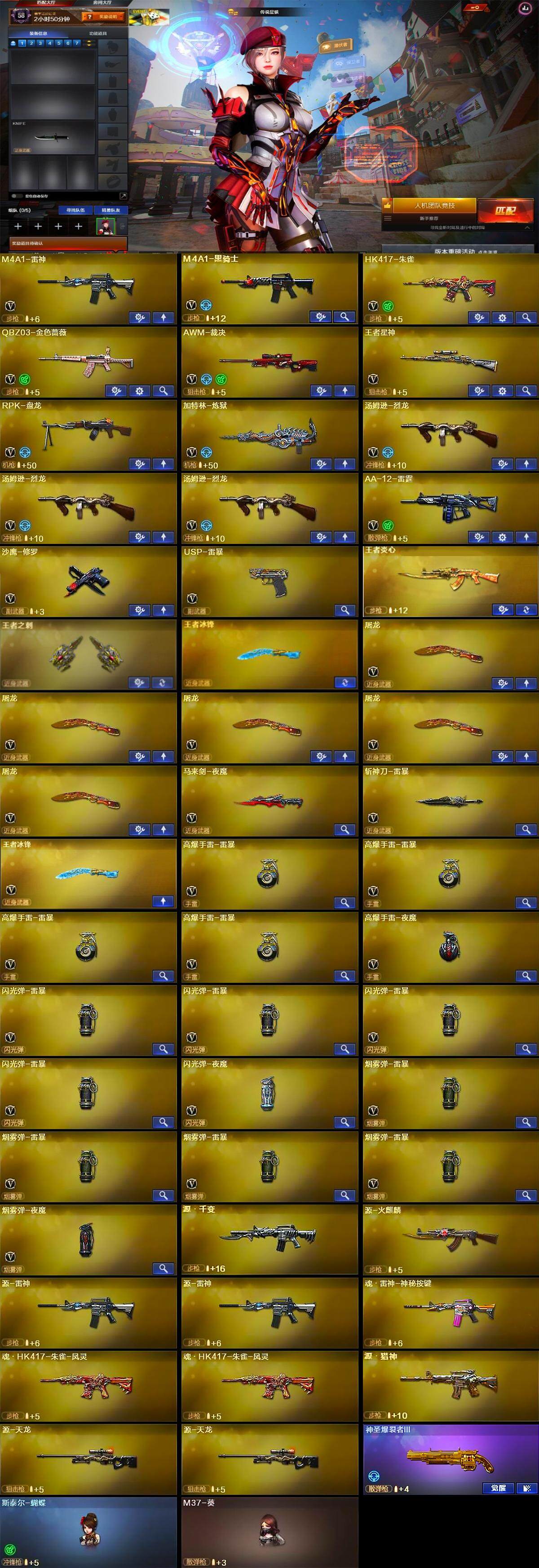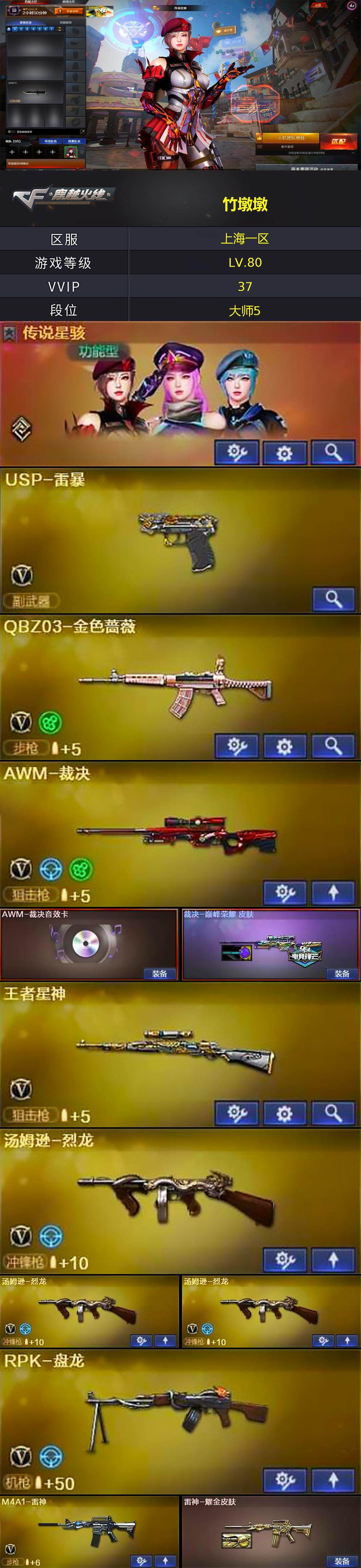 上海一区-36v-4王者-0炫金 【传说角色】:传说星骇 【热门武器】:q03-金色蔷薇,hk417-朱雀,王者炎心,m4a1-黑骑士,汤姆逊-烈龙3,rpk-盘龙,加特林-炼狱,斯泰尔-蝴蝶,usp-雷暴,沙鹰-修罗 【王者炫金武器】:王者炎心,王者之刺 【音效卡】:m4a1-黑骑士音效卡,awm-裁决音效卡 【皮肤】:裁决-巅峰荣耀 皮肤,雷神-耀金皮肤,火麒麟-巅峰荣耀,黑骑士耀金