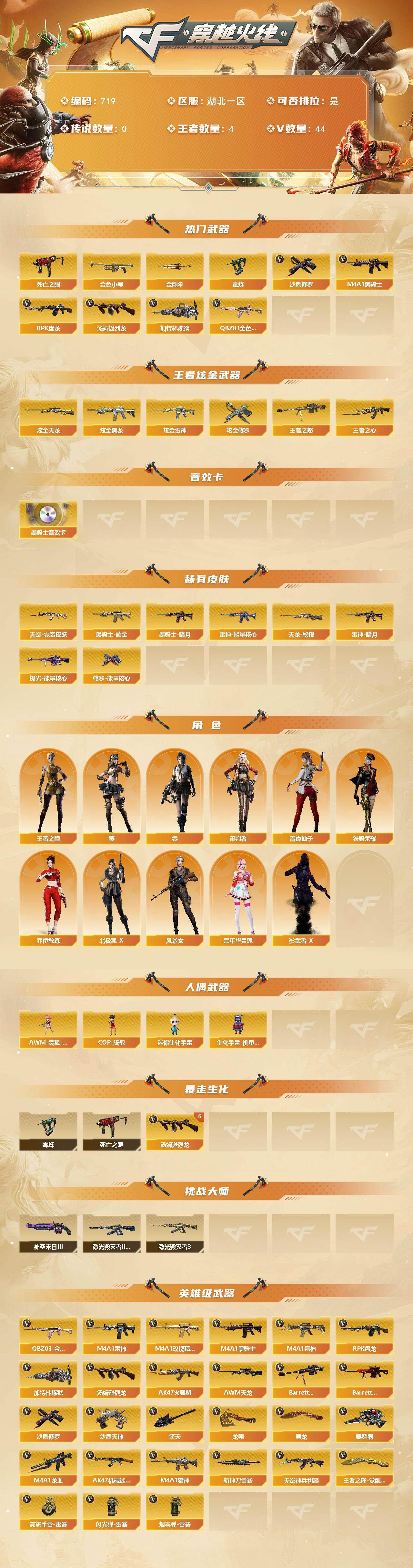[14332049]湖北一区-44v-4王者-4炫金 【热门武器】:q03-金色蔷薇,死亡之眼4,金色小号,毒蜂,m4a1-黑骑士,汤姆逊-烈龙6,rpk-盘龙,加特林-炼狱2,沙鹰-修罗5,金刚伞 【王者炫金武器】:王者之心,王者之怒,炫金黑龙,炫金雷神,炫金天龙,炫金修罗 【音效卡】:m4a1-黑骑士音效卡 【皮肤】:雷神-暗月,雷神-能量核心,黑骑士-暗月,黑骑士耀金皮肤,无影-霓裳皮肤,天龙-秘银,极光-能量核心4,修罗-能量核心 【角色】:零,葵,审判者,王者之瞳,乔伊教练,北极狐-x,风暴女,嘉年华灵狐,青霞仙子,铁骑荣耀,影武者-x 【人偶武器】:awm-灵狐-15周年嘉年华,cop-旗袍,迷你生化手蕾,生化手蕾-机甲核心 【暴走生化】:毒蜂,死亡之眼4 【挑战大师】:激光毁灭者iii-白马银呛,激光毁灭者iii,神圣爆裂者-末日iii 【英雄级武器】:ak47-火麒麟,m4a1-雷神,m4a1-黑骑士,m4a1-死神,ak47-机械迷城,m4a1-龙血2,无影-神兵利器,m4a1-玫瑰精灵,q03-金色蔷薇,m4a1-猎神,awm-天龙,barrett-毁灭,barrett-极光,rpk-盘龙,加特林-炼狱2,汤姆逊-烈龙6,沙鹰-修罗5,沙鹰-天神2,屠龙2,龙啸,擎天,麒麟刺2,斩神刀-雷暴,王者之锋-觉醒版,高爆手蕾-雷暴,闪光丹-雷暴,盐雾蛋-雷暴 【道具】:云山科技背包,女皇终结者-背包,战舰背包,炫彩背包,超级背包2,女皇终结者-魔龙之吻,救世主-黑桃战神,绿色巨人,灵魂忍者,变异宝贝,迷雾幽灵,生化弹匣,夺命之镰,防化服3,金色流光-呛王排位,星辰流光-呛王排位,流光-鎏金之域,流光-再燃火线,呛王排位28赛季金色流光,呛王排位29赛季金色流光,防弹头盔3,防弹衣3,c4工具钳3,手蕾包3 【特殊呛械】:1黑骑士,6烈龙,1盘龙,2炼狱