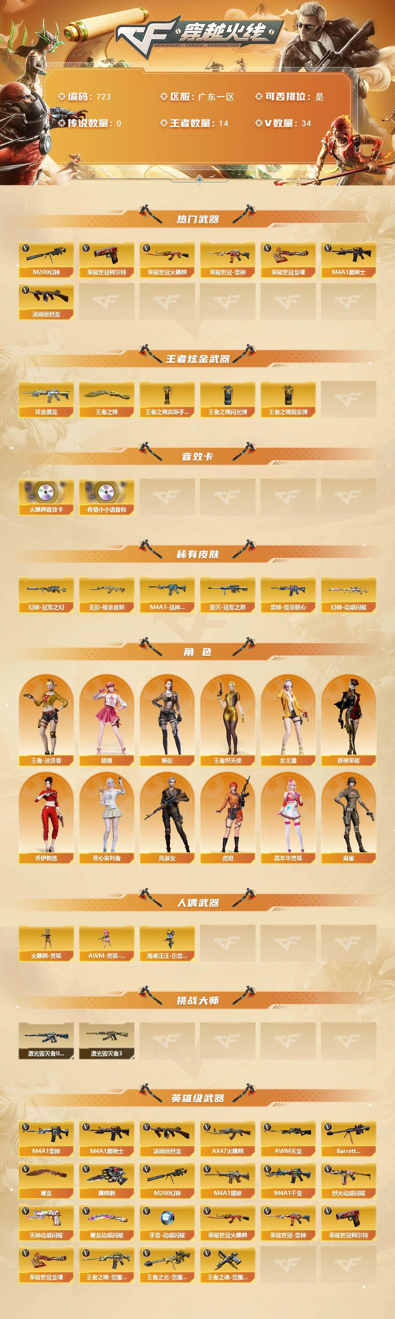 [14332237]广东一区-34v-14王者-2炫金 【热门武器】:m200-幻神,荣耀世冠-火麒麟,荣耀世冠-雷神,荣耀世冠-柯尔特,m4a1-黑骑士,汤姆逊-烈龙3,荣耀世冠-龙啸 【王者炫金武器】:王者之锋2,炫金黑龙2,王者之魄高爆手蕾2,王者之魄闪光丹3,王者之魄盐雾蛋2 【音效卡】:ak47-火麒麟音效卡,传情小小语音包 【皮肤】:幻神-冠军之幻,幻神-动感闪耀 皮肤,雷神-能量核心,m4a1-战神赵云,毁灭-冠军之怒,无影耀金皮肤 【角色】:魅影,晴雅,王者-迷迭香,王者炽天使,乔伊教练,芳心审判者,风暴女,虎妞,嘉年华灵狐,麻雀,女主播,铁骑荣耀 【人偶武器】:火麒麟-灵狐,awm-灵狐-15周年嘉年华,海滩汪汪-芭蕾特 【挑战大师】:激光毁灭者iii-白马银呛,激光毁灭者iii 【英雄级武器】:m4a1-千变,ak47-火麒麟5,m4a1-雷神5,m4a1-黑骑士,m4a1-猎神3,烈火-动感闪耀,王者之魄-觉醒版,荣耀世冠-火麒麟,荣耀世冠-雷神,awm-天龙2,barrett-毁灭,m200-幻神,王者之光-觉醒版,汤姆逊-烈龙3,荣耀世冠-柯尔特,王者之魂-觉醒版,天神-动感闪耀,屠龙,麒麟刺,屠龙-动感闪耀,荣耀世冠-龙啸,手蕾-动感闪耀 【道具】:全能呛王背包,炫彩背包,背包-葫芦兄弟,女皇终结者-魔龙之吻,夺命之镰,防化服,金色流光-呛王排位2,星辰流光-呛王排位,呛王排位28赛季金色流光,呛王排位29赛季金色流光,语音特效-机器人,动感闪耀表情,防弹头盔2,防弹衣2,c4工具钳2,手蕾包2 【特殊呛械】:1黑骑士,3烈龙
