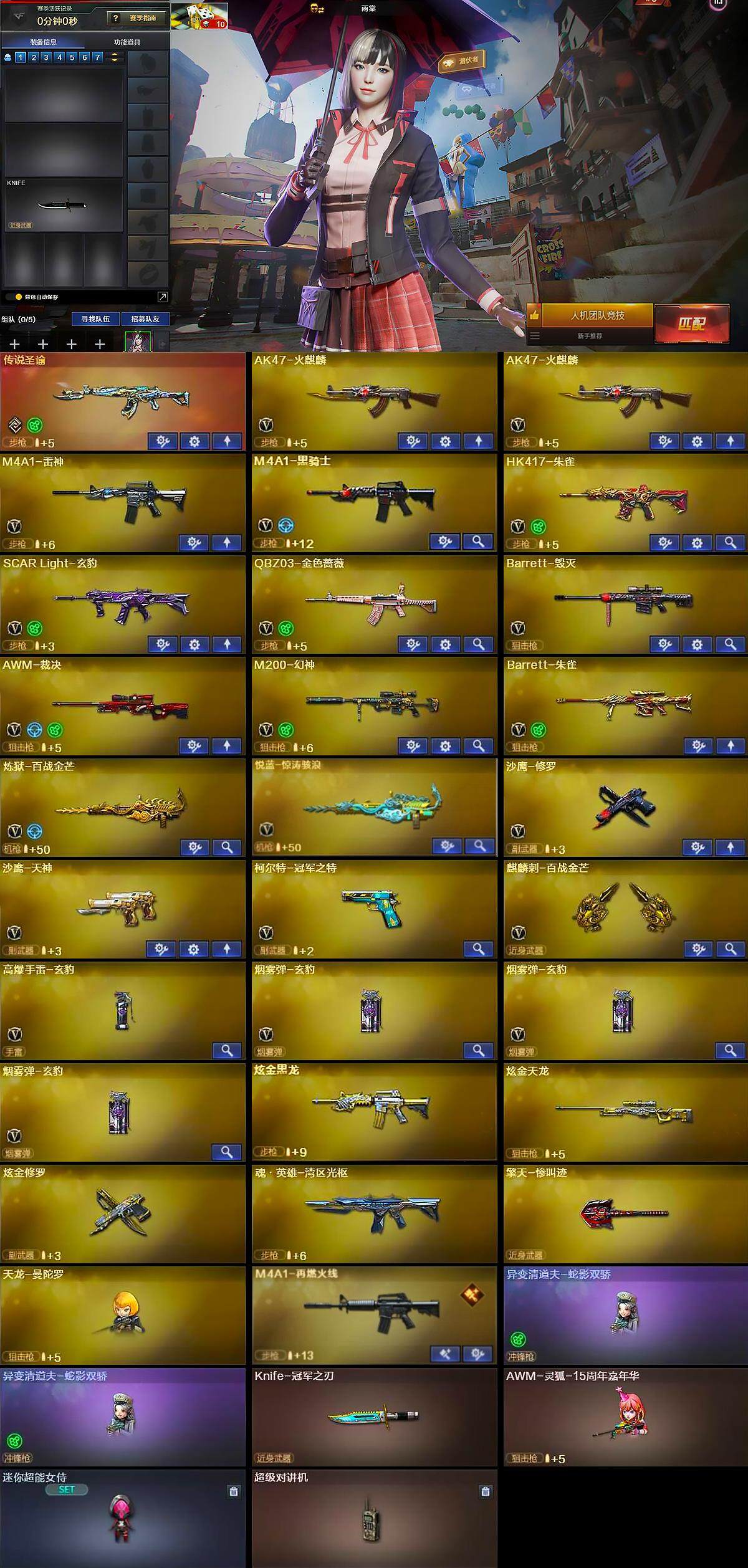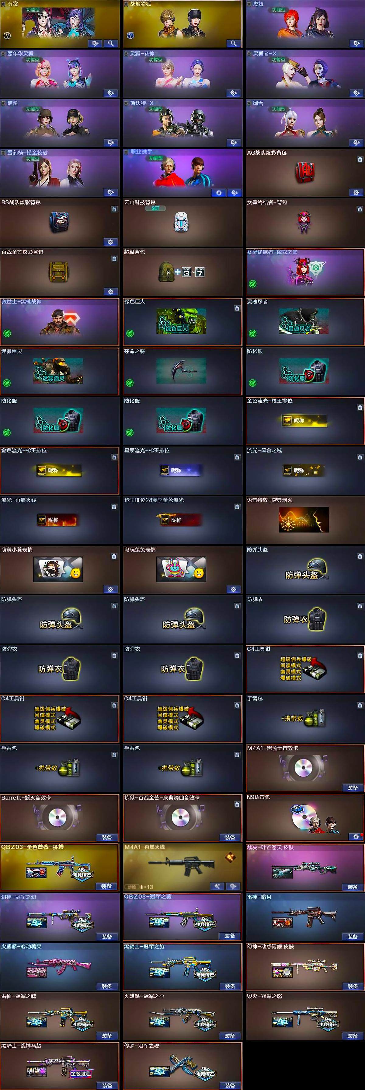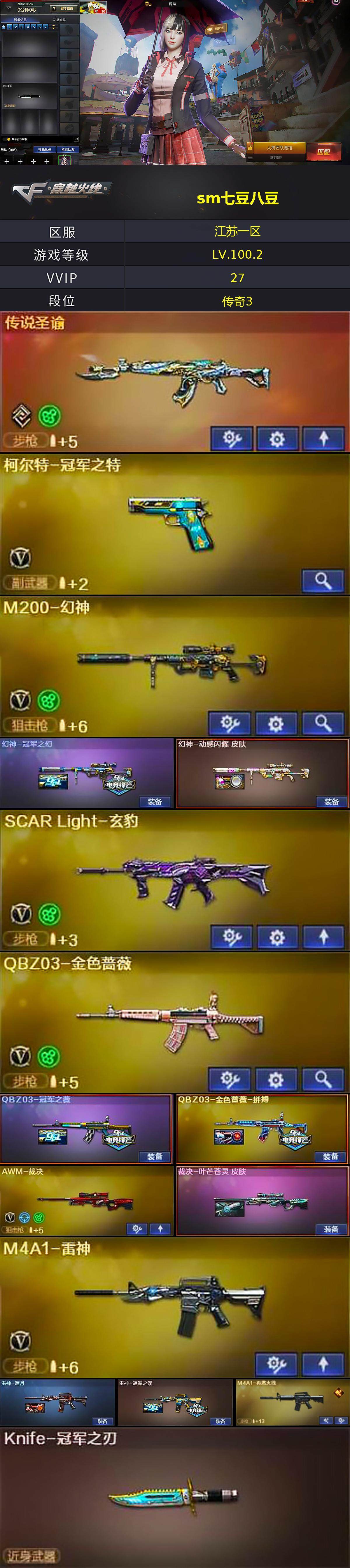 江苏一区-26v-1王者-3炫金 【传说武器】:传说圣谕 【热门武器】:传说圣谕,q03-金色蔷薇,hk417-朱雀,m200-幻神,柯尔特-冠军之特,m4a1-黑骑士,羊驼玩偶,沙鹰-修罗,knife-冠军之刃2,黄金猫猫手套-白鲨 【王者炫金武器】:炫金黑龙,炫金天龙,炫金修罗 【音效卡】:m4a1-黑骑士音效卡,barrett-毁灭音效卡,n9语音包,炼狱-百战金芒-庆典舞曲音效卡 【皮肤】:幻神-冠军之幻,幻神-动感闪耀 皮肤,q03-冠军之薇,q03-金色蔷薇-拼搏,裁决-叶芒苍灵 皮肤,雷神-暗月,雷神-冠军之魄,m4a1-再燃火线,火麒麟-冠军之心,火麒麟-心动糖果,毁灭-冠军之怒,黑骑士-冠军之势,黑骑士-战神马超,ak47-b-常胜将军-孙权3,修罗-冠军之魂,轻型军用手斧-再燃火线 【角色】:雨棠,战地猎狐,虎妞,嘉年华灵狐,疾风,灵狐-花神,灵狐者-x,麻雀,斯沃特-x,蜀雪,雪莉杨-摸金校尉,职业选手 【人偶武器】:天龙-曼陀罗,异变清道夫-蛇影双骄2,awm-灵狐-15周年嘉年华,迷你超能女侍 【暴走生化】:超级对讲机 【英雄级武器】:ak47-火麒麟2,m4a1-雷神,m4a1-黑骑士,hk417-朱雀,scar light-玄豹,q03-金色蔷薇,barrett-毁灭,awm-裁决,m200-幻神,barrett-朱雀,炼狱-百战金芒,悦蓝-惊涛骇浪-觉醒版,沙鹰-修罗,沙鹰-天神,柯尔特-冠军之特,麒麟刺-百战金芒,高爆手蕾-玄豹,盐雾蛋-玄豹3 【道具】:ag战队炫彩背包,bs战队炫彩背包,云山科技背包,女皇终结者-背包,百战金芒炫彩背包,超级背包,女皇终结者-魔龙之吻,救世主-黑桃战神,绿色巨人,灵魂忍者,迷雾幽灵,夺命之镰,防化服3,金色流光-呛王排位2,星辰流光-呛王排位,流光-鎏金之域,流光-再燃火线,呛王排位28赛季金色流光,语音特效-盛典烟火,萌萌小葵表情,电玩兔兔表情,防弹头盔3,防弹衣3,c4工具钳3,手蕾包3 【特殊呛械】:1黑骑士