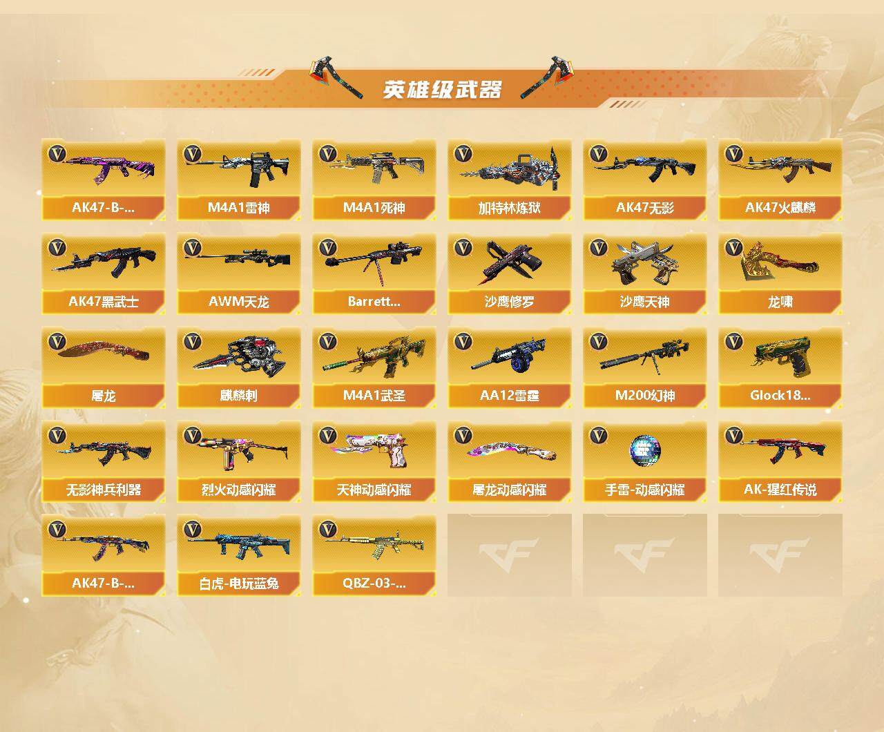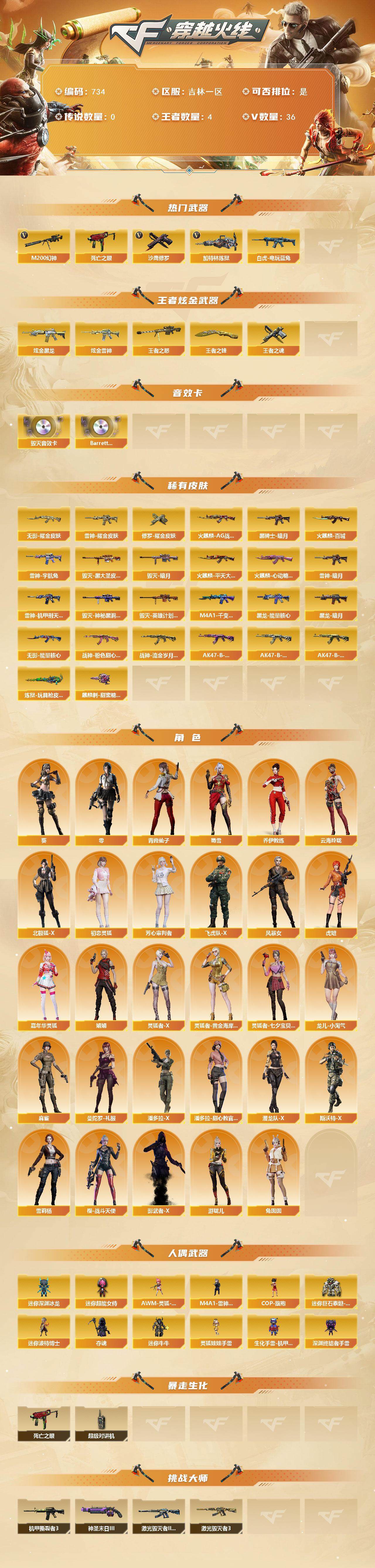 [14333172]吉林一区-36v-4王者-3炫金 【热门武器】:m200-幻神,死亡之眼2,白虎-电玩蓝兔,加特林-炼狱2,沙鹰-修罗3 【王者炫金武器】:王者之怒,王者之魂,王者之锋,炫金黑龙2,炫金雷神 【音效卡】:barrett-毁灭音效卡,barrett-碧霄极光音效卡 【皮肤】:雷神-暗月,雷神-耀金皮肤,雷神-机甲刑天皮肤,雷神-宇航兔皮肤,火麒麟-ag战队皮肤,火麒麟-平天大圣,火麒麟-百城,火麒麟-心动糖果,毁灭-暗月,毁灭-黑大圣皮肤,毁灭-神秘黑洞皮肤,毁灭-英雄计划 皮肤,m4a1-千变-孔明皮肤,黑龙-能量核心,黑龙-暗月,黑骑士-暗月,无影-能量核心,无影耀金皮肤,战神-粉色甜心皮肤,战神-流金岁月皮肤,ak47-b-常胜将军-曹操,ak47-b-常胜将军-刘备,ak47-b-常胜将军-孙权,炼狱-玩具呛皮肤,修罗耀金皮肤,麒麟刺-甜蜜糖果 皮肤 【角色】:零,葵,乔伊教练,云海玲珑,北极狐-x,初恋灵狐,芳心审判者,飞虎队-x,风暴女,虎妞,嘉年华灵狐,娟娟,灵狐者-x,灵狐者-黄金海岸,灵狐者-七夕宝贝,龙儿-小淘气,麻雀,曼陀罗-礼服,潘多拉-x,潘多拉-甜心教官,潜龙队-x,青霞仙子,斯沃特-x,蜀雪,兔囡囡,雪莉杨,樱-战斗天使,影武者-x,游珑儿 【人偶武器】:m4a1-雷神-精英刀锋,awm-灵狐-15周年嘉年华2,cop-旗袍,迷你深渊冰龙,迷你波特博士,夺魂2,迷你牛牛2,生化手蕾-机甲核心3,深渊终结者手蕾,迷你超能女侍,迷你巨石泰坦-魔花研究所,灵狐娃娃手蕾 【暴走生化】:死亡之眼2,超级对讲机 【挑战大师】:激光毁灭者iii-白马银呛,激光毁灭者iii,机甲撕裂者iii,神圣爆裂者-末日iii 【英雄级武器】:ak47-火麒麟2,m4a1-雷神,ak47-无影2,m4a1-死神,ak47-黑武士,m4a1-武圣,无影-神兵利器,烈火-动感闪耀,ak-47-猩红传说,ak47-b-战神,ak47-b-常胜将军,q-03-王者蔷薇-觉醒版,白虎-电玩蓝兔,awm-天龙,barrett-毁灭,m200-幻神,加特林-炼狱2,aa-12-雷霆,沙鹰-修罗3,沙鹰-天神,glock18-武圣,天神-动感闪耀,屠龙3,龙啸,麒麟刺,屠龙-动感闪耀,手蕾-动感闪耀 【道具】:bs战队炫彩背包,炫彩背包-诺拉,炫彩