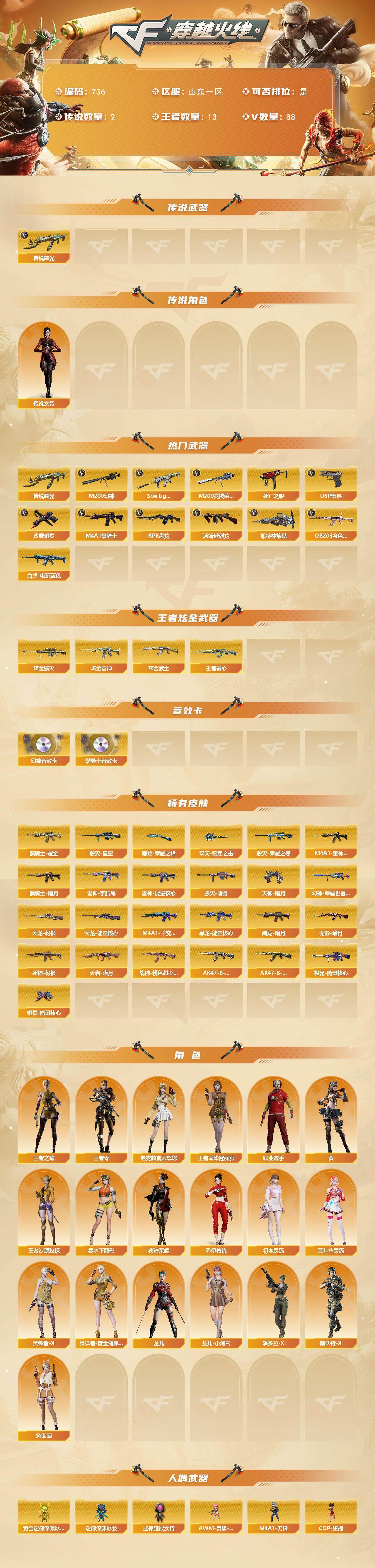 [14333262]山东一区-88v-13王者-3炫金 【传说武器】:传说辉光 【传说角色】:传说女帝 【热门武器】:传说辉光,q03-金色蔷薇,scar light-白虎,m200-幻神,m200-竞技荣光,死亡之眼,白虎-电玩蓝兔,m4a1-黑骑士,汤姆逊-烈龙6,rpk-盘龙,加特林-炼狱,usp-雷暴,沙鹰-修罗4 【王者炫金武器】:王者霜心,炫金雷神,炫金武士,炫金毁灭 【音效卡】:m200-幻神音效卡,m4a1-黑骑士音效卡 【皮肤】:m200-幻神-荣耀世冠白鲨,雷神-能量核心,m4a1-雷神-cfs 2019,雷神-宇航兔皮肤,毁灭-暗月2,毁灭-荣耀之怒,毁灭-星空,m4a1-千变-孔明皮肤,黑龙-能量核心,黑龙-暗月,黑骑士-暗月,黑骑士耀金皮肤,无影-暗月3,死神-秘银2,天启-暗月2,战神-粉色甜心皮肤,ak47-b-常胜将军-刘备,ak47-b-常胜将军-孙权,天龙-秘银2,天龙-能量核心,极光-能量核心,修罗-能量核心,天神-暗月3,屠龙-荣耀之锋,擎天-冠军之击 【角色】:葵,电竞教官-云悠悠,王者零-华冠丽服,王者-零,王者之瞳,王者沙漠玫瑰,乔伊教练,初恋灵狐,嘉年华灵狐,零-水下丽影,灵狐者-x,灵狐者-黄金海岸,龙儿,龙儿-小淘气,潘多拉-x,斯沃特-x,铁骑荣耀,兔囡囡,职业选手 【人偶武器】:awm-灵狐-15周年嘉年华,cop-旗袍,m4a1-刀锋,黄金迷你深渊冰龙,迷你深渊冰龙,迷你裂空之翼,迷你牛魔王,迷你波特博士,夺魂3,迷你牛牛,迷你火种2,迷你生化手蕾,迷你超能女侍 【暴走生化】:死亡之眼,超级对讲机 【挑战大师】:冰龙粉碎者-白马银呛2,激光毁灭者iii,机甲撕裂者iii,神圣爆裂者-末日iii 【英雄级武器】:m4a1-千变,ak47-火麒麟3,m4a1-黑龙,m4a1-雷神,m4a1-黑骑士,m4a1-死神2,ak47-黑武士,ak12-天启3,an94-超新星,m4a1-武圣,ak47-机械迷城,m4a1-龙血2,scar light-白虎,无影-神兵利器,m4a1-玫瑰精灵,q03-金色蔷薇,烈火-动感闪耀,王者之心-觉醒版,王者之翼-觉醒版,王者之幻-觉醒版,ak-47-猩红传说3,ak47-b-常胜将军,白虎-电玩蓝兔,awm-天龙2,barrett-毁灭3,barrett