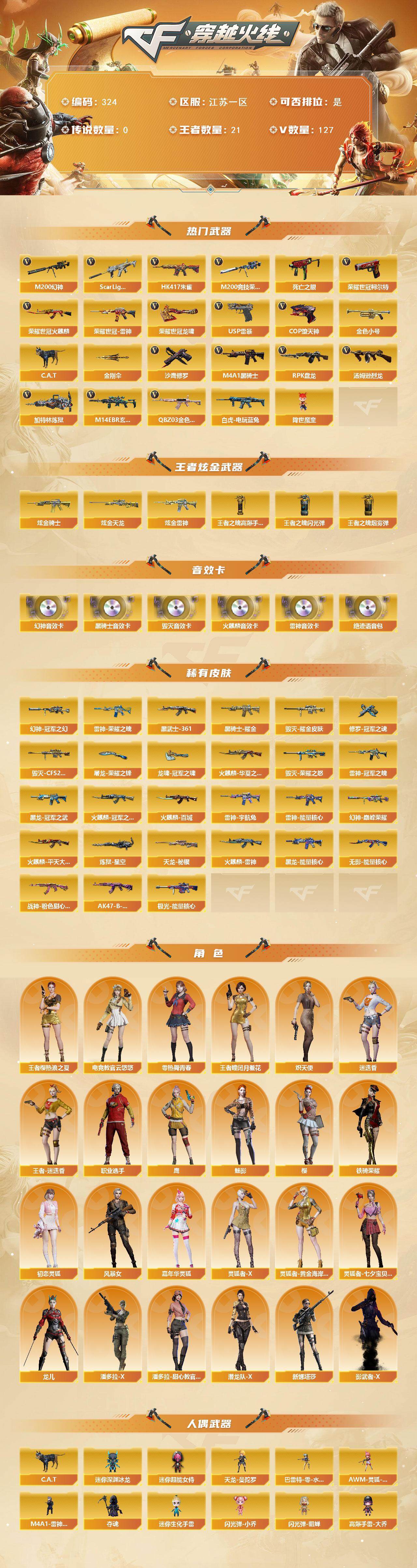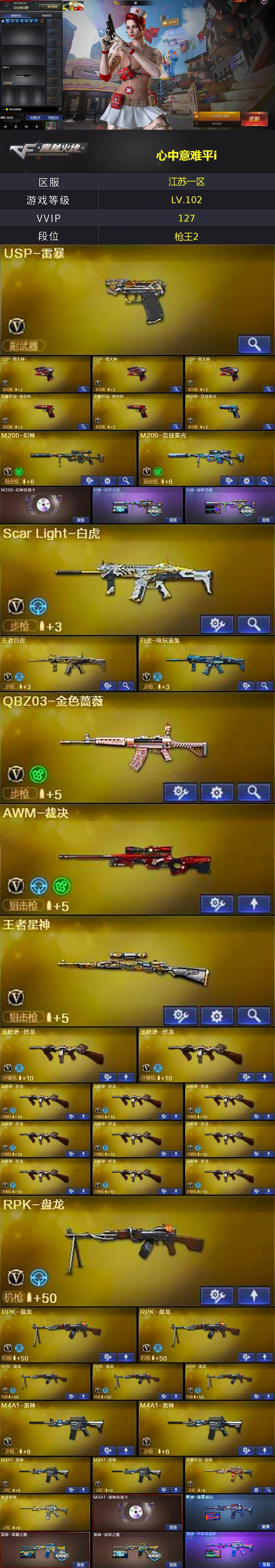 江苏一区-127v-21王者-3炫金 【热门武器】:q03-金色蔷薇,m14ebr-玄武,scar light-白虎,hk417-朱雀,m200-幻神,m200-竞技荣光,死亡之眼,荣耀世冠-火麒麟,荣耀世冠-雷神,白虎-电玩蓝兔,荣耀世冠-柯尔特2,金色小号,c.a.t,m4a1-黑骑士6,汤姆逊-烈龙11,rpk-盘龙6,加特林-炼狱2,降世魔童,usp-雷暴,cop-堕天神