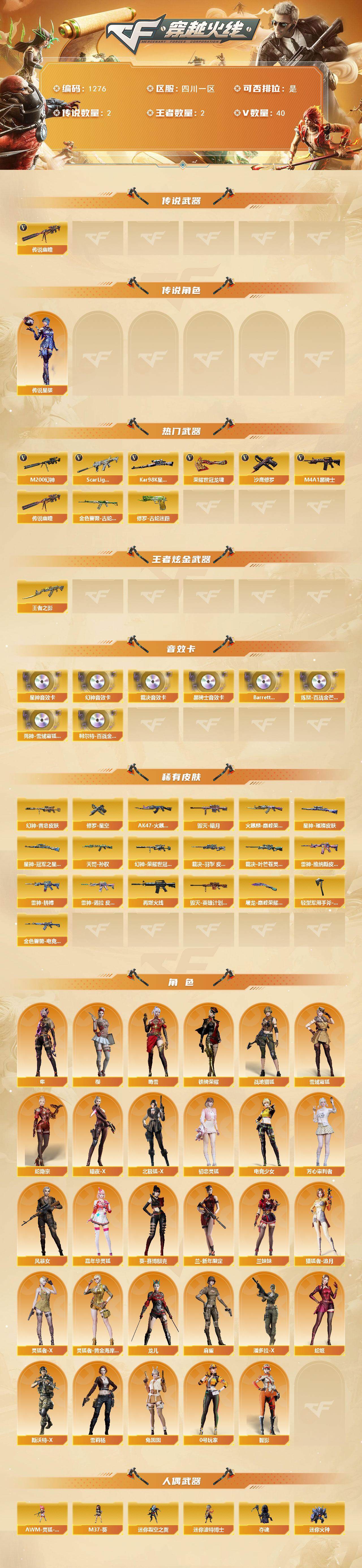 【1276】特13677西部四川一区可排位可二次【四川一区/40v/vip3/2传说】【纯白无封号/传说幽瞳/传说星骇/幻神三件套/星神三件套/裁决三件套/四防隼/ab背包拓展】【m200-幻神/m200-幻神音效卡/m200-幻神-黄忠皮肤/幻神-荣耀世冠白鲨2023 皮肤】【kar98k-星神/kar98k-星神音效卡/kar98k-星神-冠军之星皮肤/星神-璀璨皮肤】【awm-裁决/awm-裁决音效卡/裁决-叶芒苍灵 皮肤/裁决-羽掣 皮肤】【scar light-白虎】【m4a1-雷神/m4a1-雷神-拼搏/雷神-维纳斯皮肤】【barrett-毁灭/毁灭-青帝皮肤/毁灭-暗月】【ak47-火麒麟/火麒麟-巅峰荣耀/ak47-火麒麟-传奇even/火麒麟-cfstar】【m4a1-黑骑士3/m4a1-黑骑士音效卡/黑骑士-海王2】【无影-神兵利器】【天龙-cfstar】【m4a1-千变】【迷你生化手蕾2】【沙鹰-修罗/修罗-cfstar/修罗-星空】【沙鹰-天神】【荣耀世冠-龙啸】【龙儿/暗夜-x/葵-赛博朋克/木兰/兔囡囡/超能特工/兰-新年限定/麻雀/灵狐者-黄金海岸/妲己/雪莉杨/蜀雪/潘多拉-x/斯沃特-x/救世主-x/铁骑荣耀】【colt1911-小故障2/colt 1911-大黄蜂/新usp-呛王排位奖励3】【神圣爆裂者iii2/神圣爆裂者-末日iii/机甲撕裂者iii2/vepr-12-紫魔/kac-圣炎切割者iii2/激光毁灭者iii-白马银呛/激光毁灭者iii2/巨龙咆哮-深渊金/阐释者iii】【斯泰尔-巧克力2】【猫猫手套/m37-葵/迷你裂空之翼2/夺魂2】【王者之影】【超级护目镜/烟雾保护头盔/闪光护目镜/超级背包/防弹头盔3/防弹衣3/c4工具钳3/手蕾包3/防化服3】赛季更新段位可能更新/源武器多多皮肤多多底价处理机会难得手慢无