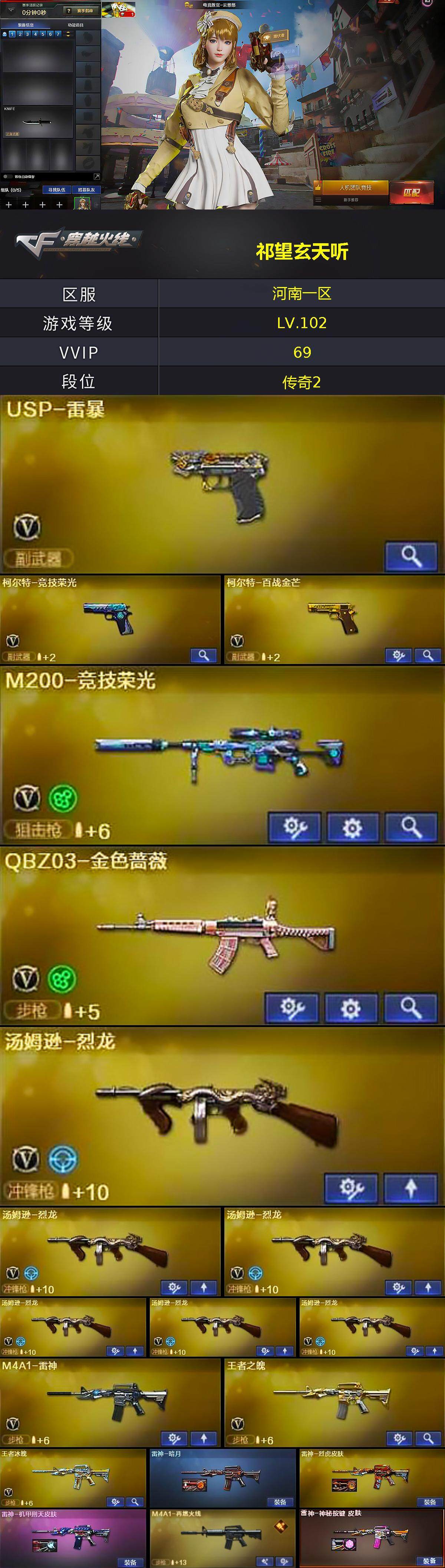 河南一区-69v-2王者-0炫金 【热门武器】:q03-金色蔷薇,m200-竞技荣光,死亡之眼,m4a1-黑骑士,汤姆逊-烈龙6,usp-雷暴,沙鹰-修罗2 【音效卡】:m4a1-黑骑士音效卡,barrett-毁灭音效卡,barrett-碧霄极光音效卡,麒麟刺-百战金芒-盛典舞曲音效卡,炼狱-百战金芒-庆典舞曲音效卡,柯尔特-百战金芒-庆典舞曲音效卡 【皮肤】:雷神-暗月,雷神-烈虎皮肤,雷神-机甲刑天皮肤,m4a1-再燃火线,雷神-神秘按键 皮肤,火麒麟-平天大圣,毁灭-黑大圣皮肤,毁灭-英雄计划 皮肤,m4a1-千变-孔明皮肤2,黑龙-能量核心,awm-天龙-传奇70kg,屠龙-春桃 皮肤,轻型军用手斧-再燃火线 【角色】:电竞教官-云悠悠,暗夜-x,初恋灵狐,风暴女,虎妞,嘉年华灵狐,娟娟,灵狐者-七夕宝贝,龙儿-小淘气,潘多拉-甜心教官,青霞仙子,铁骑荣耀,雪莉杨-摸金校尉,樱-战斗天使 【人偶武器】:awm-灵狐-15周年嘉年华2,迷你深渊冰龙,夺魂,迷你生化手蕾,深渊终结者手蕾2 【暴走生化】:死亡之眼,超级对讲机 【挑战大师】:激光毁灭者iii-白马银呛,激光毁灭者iii,神圣爆裂者-末日iii2 【英雄级武器】:m4a1-雷神,m4a1-黑骑士,ak47-无影,无影-神兵利器,q03-金色蔷薇,王者之魄-觉醒版,王者冰魄-觉醒版,黑骑士-海王,barrett-毁灭,m200-竞技荣光,炼狱-百战金芒,汤姆逊-烈龙6,沙鹰-修罗2,沙鹰-天神3,usp-雷暴,柯尔特-竞技荣光,柯尔特-百战金芒,屠龙,擎天-竞技荣光2,麒麟刺-百战金芒,高爆手蕾-幻灵,高爆手蕾-竞技荣光7,闪光丹-幻灵,闪光丹-竞技荣光9,盐雾蛋-幻灵,盐雾蛋-竞技荣光12,m4a1-苍鸣雷神,barrett-碧霄极光 【道具】:冰冰企鹅背包,女皇终结者-背包,炫彩背包,百战金芒炫彩背包,虎牙炫彩背包,超级背包,圣拳猎手-炽雪,女皇终结者-魔龙之吻,绿色巨人,灵魂忍者,变异宝贝,妖姬,迷雾幽灵,夺命之镰,防化服3,金色流光-呛王排位2,星辰流光-呛王排位,流光-鎏金之域,语音特效-盛典烟火,萌萌小葵表情,c4-红龙,防弹头盔6,防弹衣7,c4工具钳5,手蕾包6 【特殊呛械】:1黑骑士,6烈龙