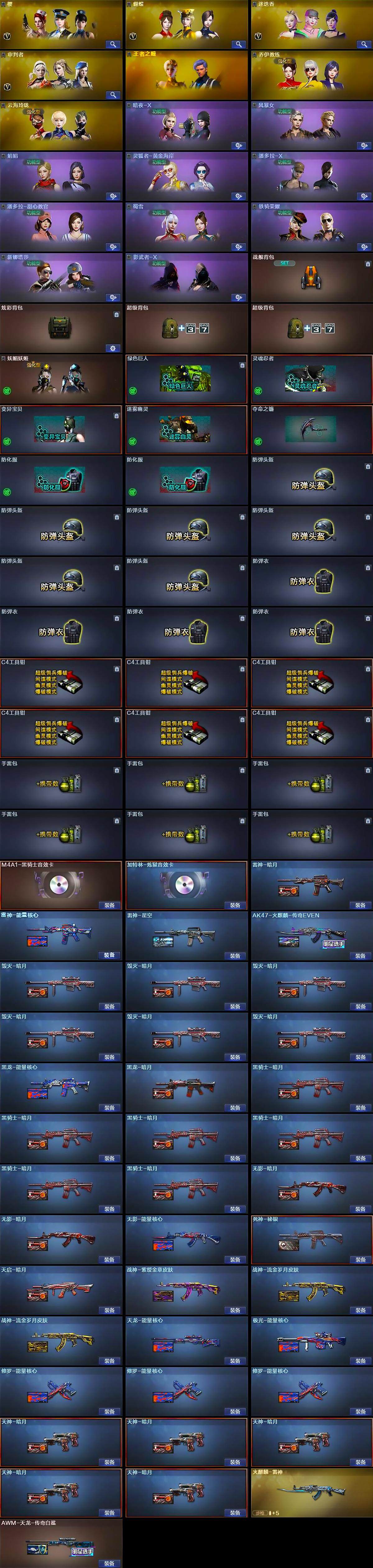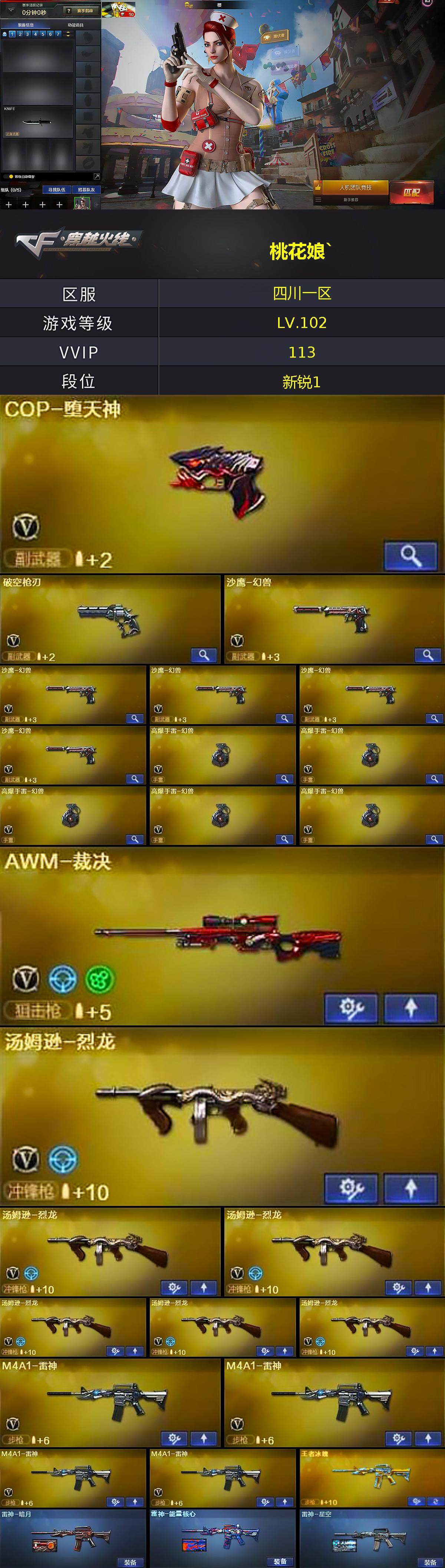 四川一区-113v-8王者-2炫金 【热门武器】:死亡之眼,m4a1-黑骑士,汤姆逊-烈龙6,加特林-炼狱7,cop-堕天神,沙鹰-修罗6,高爆手蕾-幻兽5 【王者炫金武器】:王者之势,王者之魄,王者之心,王者之怒,王者之魂,炫金天龙,炫金天神 【音效卡】:m4a1-黑骑士音效卡 【皮肤】:雷神-暗月,雷神-能量核心,雷神-星空,火麒麟-雷神,ak47-火麒麟-传奇even,毁灭-暗月