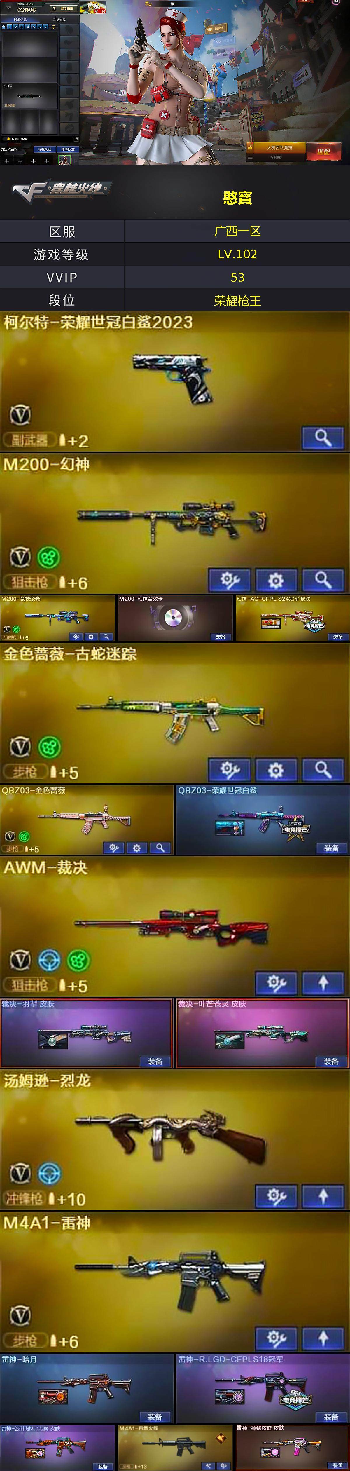 [14358917]广西一区-46v-5王者-0炫金 【热门武器】:q03-金色蔷薇,m200-幻神,柯尔特-荣耀世冠白鲨2023,金色蔷薇-古蛇迷踪,修罗-古蛇迷踪,m200-竞技荣光,死亡之眼,c.a.t,汤姆逊-烈龙,加特林-炼狱,羊驼玩偶,沙鹰-修罗3,炽芒蝶刃,炽芒蝶刃-破浪逐光 皮肤 【王者炫金武器】:王者云击 【音效卡】:m200-幻神音效卡,加特林-炼狱音效卡,炼狱-百战金芒-庆典舞曲音效卡,死神-雪域霜狐-怀旧音效卡 【皮肤】:幻神-ag-cfpl s24冠军 皮肤,q03-荣耀世冠白鲨,裁决-羽掣 皮肤,裁决-叶芒苍灵 皮肤,雷神-暗月,雷神-r.lgd-cfpls18冠军,雷神-源计划2.0专属 皮肤,m4a1-再燃火线,雷神-神秘按键 皮肤,毁灭-风暴,毁灭-秦师 皮肤,毁灭-英雄计划 皮肤,黑龙-能量核心,无影-暗月,极光-能量核心2,极光-高能霹雳 皮肤,天神-暗月,屠龙-破浪逐光 皮肤,轻型军用手斧-再燃火线,炽芒蝶刃-破浪逐光 皮肤,炽芒蝶刃-巅峰荣耀 皮肤 【角色】:樱,魅影,华,战地猎狐,雪域霜狐,蛇隐宗,奇洋探员,乔伊教练,暗夜-x,电竞少女,飞虎队-x,风暴女,曼陀罗-x,潘多拉-甜心教官,蛇姬,铁骑荣耀,兔囡囡,维纳斯,夜玫瑰-宠粉,游珑儿,智影 【人偶武器】:王者barrett-英勇金戈,scar light-马呛,awm-灵狐-15周年嘉年华,c.a.t,迷你牛牛,迷你深渊冰龙-王绿豆 【暴走生化】:死亡之眼 【挑战大师】:冰龙粉碎者-白马银呛 【英雄级武器】:m4a1-雷神,ak12-天启,黑武士-锦绣游龙,超新星-热带奇洋,金色蔷薇-古蛇迷踪,死神-雪域霜狐,q03-金色蔷薇,王者之势-觉醒版,awm-天龙,barrett-毁灭,awm-裁决,m200-幻神,m200-竞技荣光,加特林-炼狱,炼狱-百战金芒,炼狱-悦蓝-觉醒版,汤姆逊-烈龙,沙鹰-修罗3,柯尔特-荣耀世冠白鲨2023,修罗-古蛇迷踪,屠龙2,炽芒蝶刃,龙啸-热带奇洋,麒麟刺-百战金芒,王者之锋-觉醒版,高爆手蕾-竞技荣光2,高爆手蕾-云龙2,手蕾-热带奇洋,高爆手蕾-古蛇迷踪,闪光丹-云龙2,盐雾蛋-竞技荣光,盐雾蛋-云龙2,盐雾蛋-古蛇迷踪,盐雾蛋-玄豹,盐雾蛋-荣耀世冠ep2,m4a1-赤狱骑士,m4a1-苍鸣雷神,awm-昌龙,ba