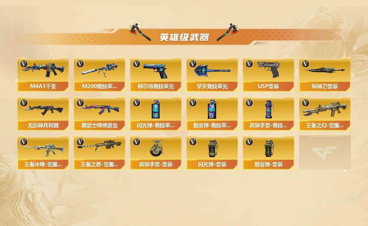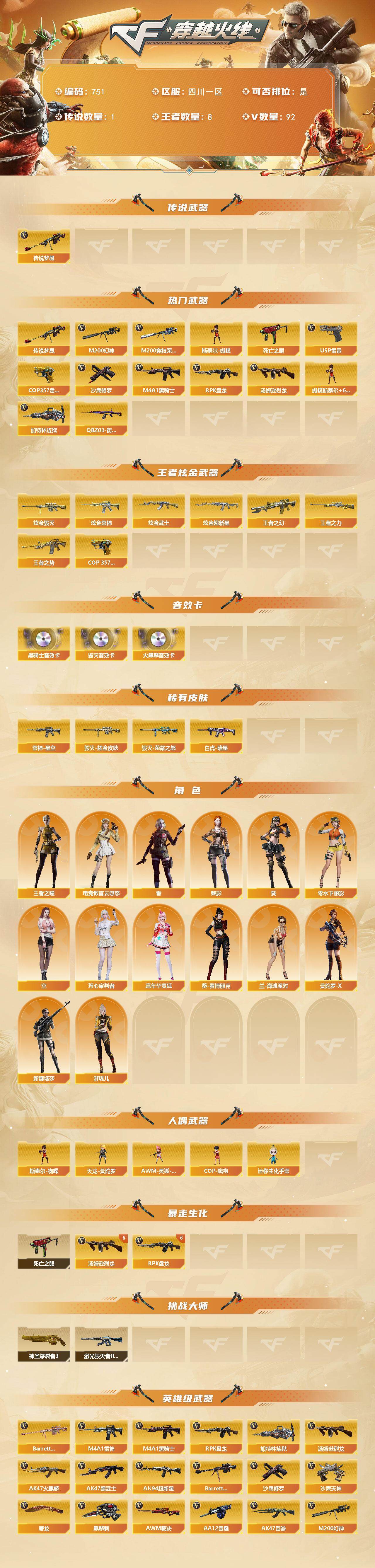 [14361476]四川一区-92v-8王者-4炫金 【传说武器】:传说梦魇 【热门武器】:传说梦魇,m200-幻神,m200-竞技荣光,死亡之眼,q03-街机,m4a1-黑骑士,汤姆逊-烈龙6,rpk-盘龙6,加特林-炼狱2,斯泰尔-蝴蝶,usp-雷暴2,cop 357-雷霆王者,沙鹰-修罗3 【王者炫金武器】:王者之幻,王者之势,王者之力,cop 357-雷霆王者,炫金雷神,炫金武士,炫金超新星,炫金毁灭 【音效卡】:ak47-火麒麟音效卡,m4a1-黑骑士音效卡,barrett-毁灭音效卡 【皮肤】:scar light-白虎-暗星,雷神-星空,毁灭-荣耀之怒,毁灭耀金皮肤 【角色】:葵,魅影,春,电竞教官-云悠悠,王者之瞳,空,芳心审判者,嘉年华灵狐,葵-赛博朋克,兰-海滩派对,零-水下丽影,曼陀罗-x,新娜塔莎,游珑儿 【人偶武器】:天龙-曼陀罗,斯泰尔-蝴蝶,awm-灵狐-15周年嘉年华,cop-旗袍,迷你生化手蕾 【暴走生化】:死亡之眼 【挑战大师】:神圣爆裂者iii,激光毁灭者iii-白马银呛 【英雄级武器】:m4a1-千变,ak47-火麒麟,m4a1-雷神,m4a1-黑骑士,ak47-黑武士,an94-超新星2,ak47-雷暴,无影-神兵利器,黑武士-锦绣游龙,王者之幻-觉醒版,王者冰魄-觉醒版,barrett-毁灭4,awm-裁决2,m200-幻神,m200-竞技荣光,barrett-金色蔷薇,王者之怒-觉醒版,rpk-盘龙6,加特林-炼狱2,汤姆逊-烈龙6,aa-12-雷霆2,沙鹰-修罗3,沙鹰-天神5,usp-雷暴2,柯尔特-竞技荣光,屠龙5,麒麟刺3,擎天-竞技荣光,斩神刀-雷暴,高爆手蕾-雷暴7,高爆手蕾-竞技荣光4,闪光丹-雷暴7,闪光丹-竞技荣光4,盐雾蛋-雷暴7,盐雾蛋-竞技荣光3 【道具】:超级背包,变异宝贝,夺命之镰,防化服,金色流光-呛王排位,星辰流光-呛王排位,呛王排位28赛季金色流光,c4-沙漠,防弹头盔,防弹衣,c4工具钳,手蕾包 【特殊呛械】:蝴蝶斯泰尔6烈龙,1黑骑士,6烈龙,6盘龙,2炼狱,1蝴蝶斯泰尔