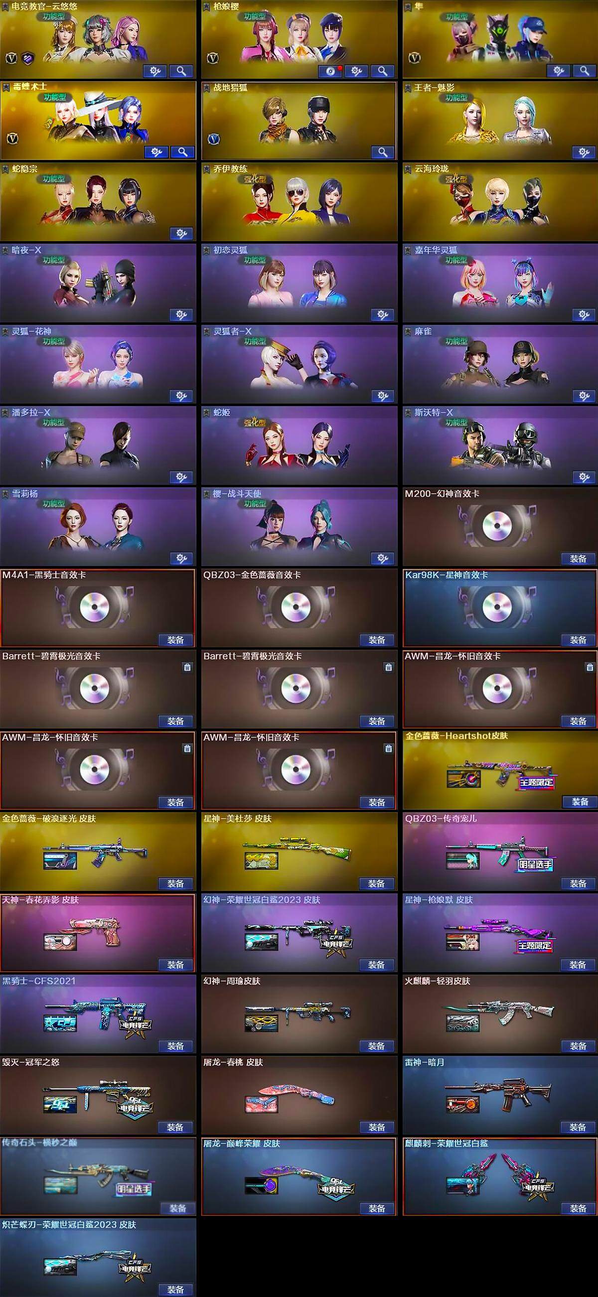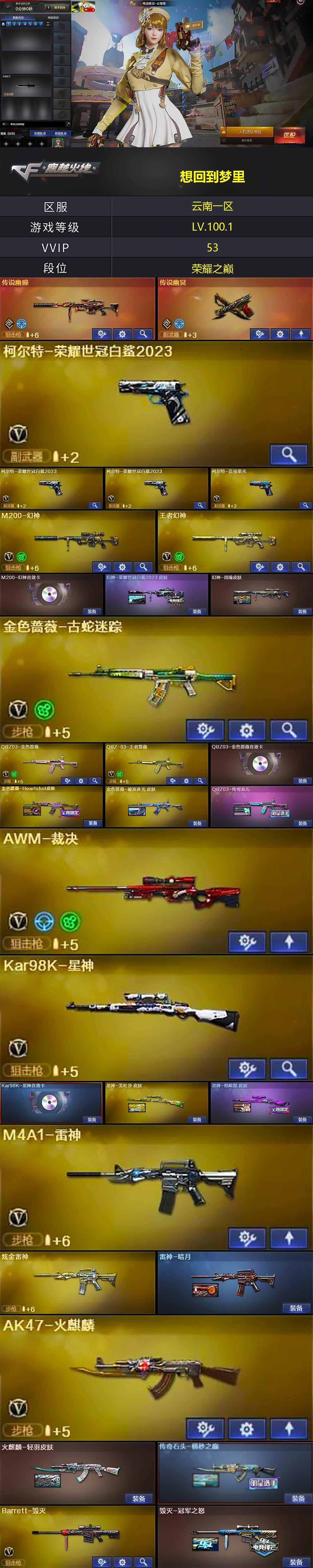 [14370377]云南一区-46v-5王者-1炫金 【传说武器】:传说幽瞳,传说幽冥 【热门武器】:传说幽瞳,传说幽冥,q03-金色蔷薇,hk417-朱雀,m200-幻神,柯尔特-荣耀世冠白鲨20233,金色蔷薇-古蛇迷踪,修罗-古蛇迷踪,kar98k-星神,m4a1-黑骑士,玄武-呛娘火莲,幻神-魅影,cop-白鲨,沙鹰-修罗4,炽芒蝶刃-荣耀世冠白鲨2023 皮肤 【王者炫金武器】:王者青龙,炫金雷神 【音效卡】:m200-幻神音效卡,m4a1-黑骑士音效卡,q03-金色蔷薇音效卡,kar98k-星神音效卡,barrett-碧霄极光音效卡2,awm-昌龙-怀旧音效卡3 【皮肤】:幻神-周瑜皮肤,幻神-荣耀世冠白鲨2023 皮肤,q03-传奇宠儿,金色蔷薇-heartshot皮肤,金色蔷薇-破浪逐光 皮肤,星神-呛娘默 皮肤,星神-美杜莎 皮肤,雷神-暗月,火麒麟-轻羽皮肤,传奇石头-横秒之巅,毁灭-冠军之怒,黑骑士-cfs2021,天神-春花弄影 皮肤,屠龙-春桃 皮肤,屠龙-巅峰荣耀 皮肤,麒麟刺-荣耀世冠白鲨,炽芒蝶刃-荣耀世冠白鲨2023 皮肤 【角色】:电竞教官-云悠悠,呛娘樱,隼,毒蝰术士,战地猎狐,王者春,王者-魅影,蛇隐宗,乔伊教练,云海玲珑,暗夜-x,初恋灵狐,嘉年华灵狐,灵狐-花神,灵狐者-x,麻雀,潘多拉-x,蛇姬,斯沃特-x,雪莉杨,樱-战斗天使 【人偶武器】:玄武-呛娘火莲,幻神-魅影,cop-白鲨,萌兔-斯泰尔,awm-灵狐-15周年嘉年华,cop-旗袍,生化手蕾-机甲核心2 【暴走生化】:超级对讲机 【挑战大师】:神圣爆裂者-末日iii 【英雄级武器】:ak47-火麒麟,m4a1-雷神,m4a1-黑骑士,hk417-朱雀,无影-神兵利器,金色蔷薇-古蛇迷踪,q03-金色蔷薇,q-03-王者蔷薇-觉醒版,barrett-毁灭,awm-裁决,m200-幻神,kar98k-星神,王者幻神-觉醒版,沙鹰-修罗4,柯尔特-荣耀世冠白鲨20233,柯尔特-竞技荣光,天神-动感闪耀,修罗-古蛇迷踪,屠龙3,麒麟刺,擎天-竞技荣光2,屠龙-动感闪耀,高爆手蕾-竞技荣光5,手蕾-动感闪耀,手蕾-热带奇洋,高爆手蕾-古蛇迷踪,闪光丹-竞技荣光4,盐雾蛋-竞技荣光4,盐雾蛋-古蛇迷踪,m4a1-赤狱骑士,barrett-碧霄极光