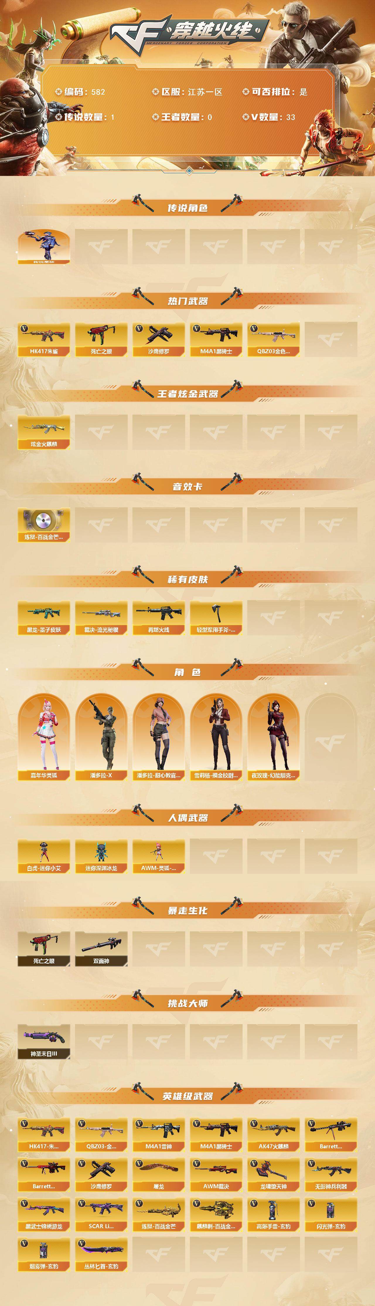[14377828]江苏一区-33v-0王者-1炫金 【传说角色】:传说星骇 【热门武器】:q03-金色蔷薇,hk417-朱雀,死亡之眼,m4a1-黑骑士,沙鹰-修罗6 【王者炫金武器】:炫金火麒麟 【音效卡】:炼狱-百战金芒-庆典舞曲音效卡 【皮肤】:裁决-流光秘银,m4a1-再燃火线,黑龙-墨子皮肤,轻型军用手斧-再燃火线 【角色】:嘉年华灵狐,潘多拉-x,潘多拉-甜心教官,雪莉杨-摸金校尉,夜玫瑰-幻能朋克 【人偶武器】:白虎-迷你小艾,awm-灵狐-15周年嘉年华,迷你深渊冰龙 【暴走生化】:双面神,死亡之眼 【挑战大师】:神圣爆裂者-末日iii 【英雄级武器】:ak47-火麒麟,m4a1-雷神,m4a1-黑骑士,hk417-朱雀,无影-神兵利器,黑武士-锦绣游龙,scar light-玄豹,q03-金色蔷薇,barrett-毁灭,barrett-极光,awm-裁决,炼狱-百战金芒,沙鹰-修罗6,屠龙,龙啸-堕天神,麒麟刺-百战金芒,丛林匕首-玄豹,高爆手蕾-玄豹2,闪光丹-玄豹2,盐雾蛋-玄豹 【道具】:bs战队炫彩背包,亚洲杯纪念炫彩背包,炫彩背包,百战金芒炫彩背包,女皇终结者-魔龙之吻,绿色巨人,灵魂忍者,妖姬,迷雾幽灵,夺命之镰,防化服3,金色流光-呛王排位2,星辰流光-呛王排位,呛王排位28赛季金色流光,呛王排位29赛季金色流光,语音特效-盛典烟火,语音特效-机器人,萌萌小葵表情,防弹头盔3,防弹衣3,c4工具钳3,手蕾包3 【特殊呛械】:1黑骑士