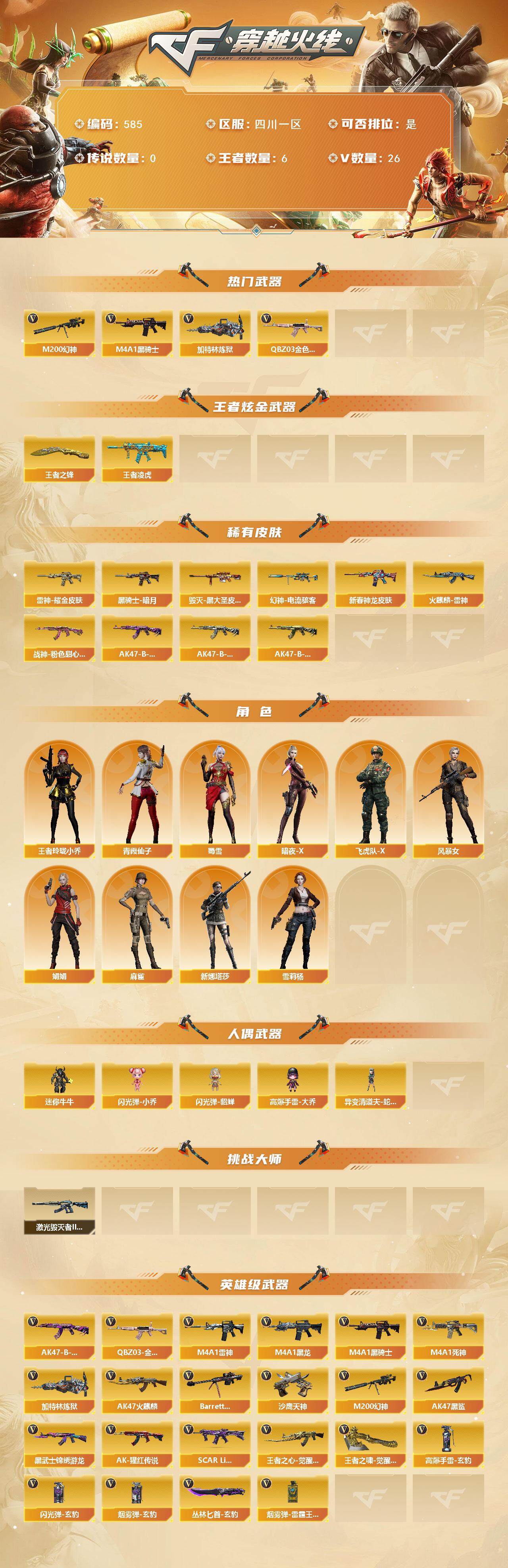 [14380558]四川一区-26v-6王者-0炫金 【热门武器】:q03-金色蔷薇,m200-幻神,m4a1-黑骑士,加特林-炼狱 【王者炫金武器】:王者凌虎,王者之锋 【皮肤】:幻神-电流骇客 皮肤,雷神-耀金皮肤,m4a1-雷神-新春神龙皮肤,火麒麟-雷神,毁灭-黑大圣皮肤,黑骑士-暗月,战神-粉色甜心皮肤,ak47-b-常胜将军-曹操,ak47-b-常胜将军-刘备,ak47-b-常胜将军-孙权 【角色】:王者玲珑-小乔,暗夜-x,飞虎队-x,风暴女,娟娟,麻雀,青霞仙子,蜀雪,新娜塔莎,雪莉杨 【人偶武器】:异变清道夫-蛇影双骄,迷你牛牛,闪光丹-小乔,闪光丹-貂蝉,高爆手蕾-大乔 【挑战大师】:激光毁灭者iii-白马银呛 【英雄级武器】:ak47-火麒麟,m4a1-黑龙,m4a1-雷神,m4a1-黑骑士,m4a1-死神,ak47-黑鲨,黑武士-锦绣游龙,scar light-玄豹,q03-金色蔷薇,王者之心-觉醒版,ak-47-猩红传说,ak47-b-常胜将军,barrett-毁灭,m200-幻神,加特林-炼狱,沙鹰-天神,王者之啸-觉醒版,丛林匕首-玄豹,高爆手蕾-玄豹3,闪光丹-玄豹,盐雾蛋-玄豹2,盐雾蛋-雷霆王者-觉醒版 【道具】:bs战队炫彩背包,cfs限定背包,云山科技背包,炫彩背包,超级背包,女皇终结者-魔龙之吻,救世主-黑桃战神,黄金生化钩,绿色巨人,灵魂忍者2,变异宝贝,迷雾幽灵3,夺命之镰,防化服3,星辰流光-呛王排位,流光-再燃火线,呛王排位28赛季金色流光,cfpl选手表情-第2套,ep战队名片,ep战队喷图,防弹头盔3,防弹衣3,c4工具钳4,手蕾包4 【特殊呛械】:1黑骑士,1炼狱