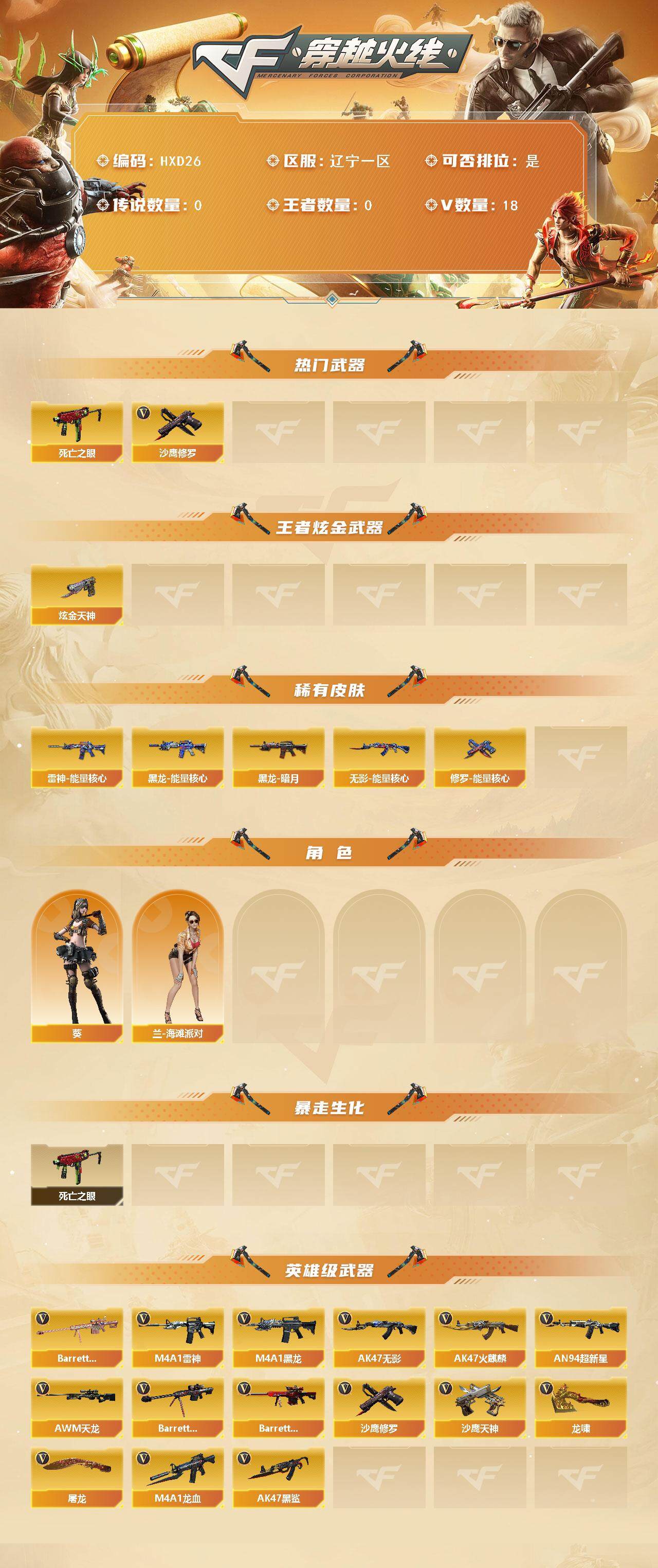 【hxd26】17v/101级/大元首/1炫金/1英雄/死亡之眼/沙鹰-修罗/炫金天神/雷神-能量核心/黑龙-能量核心/黑龙-暗月/无影-能量核心/修罗-能量核心/葵/兰-海滩派对/ak47-火麒麟/m4a1-黑龙/m4a1-雷神/ak47-无影/an94-超新星/ak47-黑鲨/m4a1-龙血/awm-天龙/barrett-毁灭/barrett-极光/barrett-金色蔷薇/沙鹰-天神/屠龙/龙啸/炫彩背包/夺命之镰/防化服/防弹头盔/防弹衣/c4工具钳/手蕾包