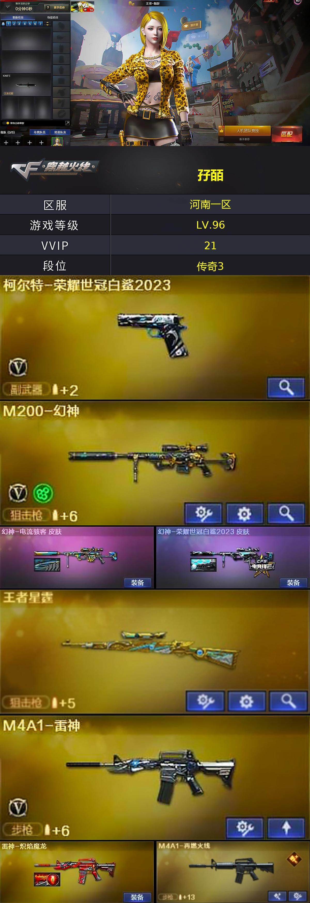 【1263】贝35365可排位-可二次【河南一区/19v/vip4】【白鲨套】【四防王者-魅影】【王者星霆】【白虎-九尾白狐】【m200-幻神/幻神-荣耀世冠白鲨2023皮/幻神-电流骇客皮】【柯尔特-荣耀世冠白鲨2023】【炽芒蝶刃/炽芒蝶刃-荣耀世冠白鲨2023皮】【m4a1-雷神/雷神-炽焰魔龙】【火麒麟-cfstar】【m4a1-黑龙】【黑武士-锦绣游龙】【炼狱-百战金芒】【云龙扇】【麒麟刺-百战金芒】【擎天】【屠龙/屠龙-星火燎原】【王者-魅影/暗夜-x/救世主-x】【黑鲨-电流骇客皮】【colt1911-小故障/colt 1911-大黄蜂/新usp-呛王排位奖励】【沙鹰-夜玫瑰】【盐雾蛋-荣耀世冠白鲨20233】【高爆手蕾-云龙2/闪光丹-云龙3/盐雾蛋-云龙】【炫金天神】【防弹头盔2/防弹衣2/c4工具钳2/手蕾包2/防化服2】【截图展示段位不代表实际段位,如赛季更新等不/拒因素发生变化、时限道具不保证所剩时间。】